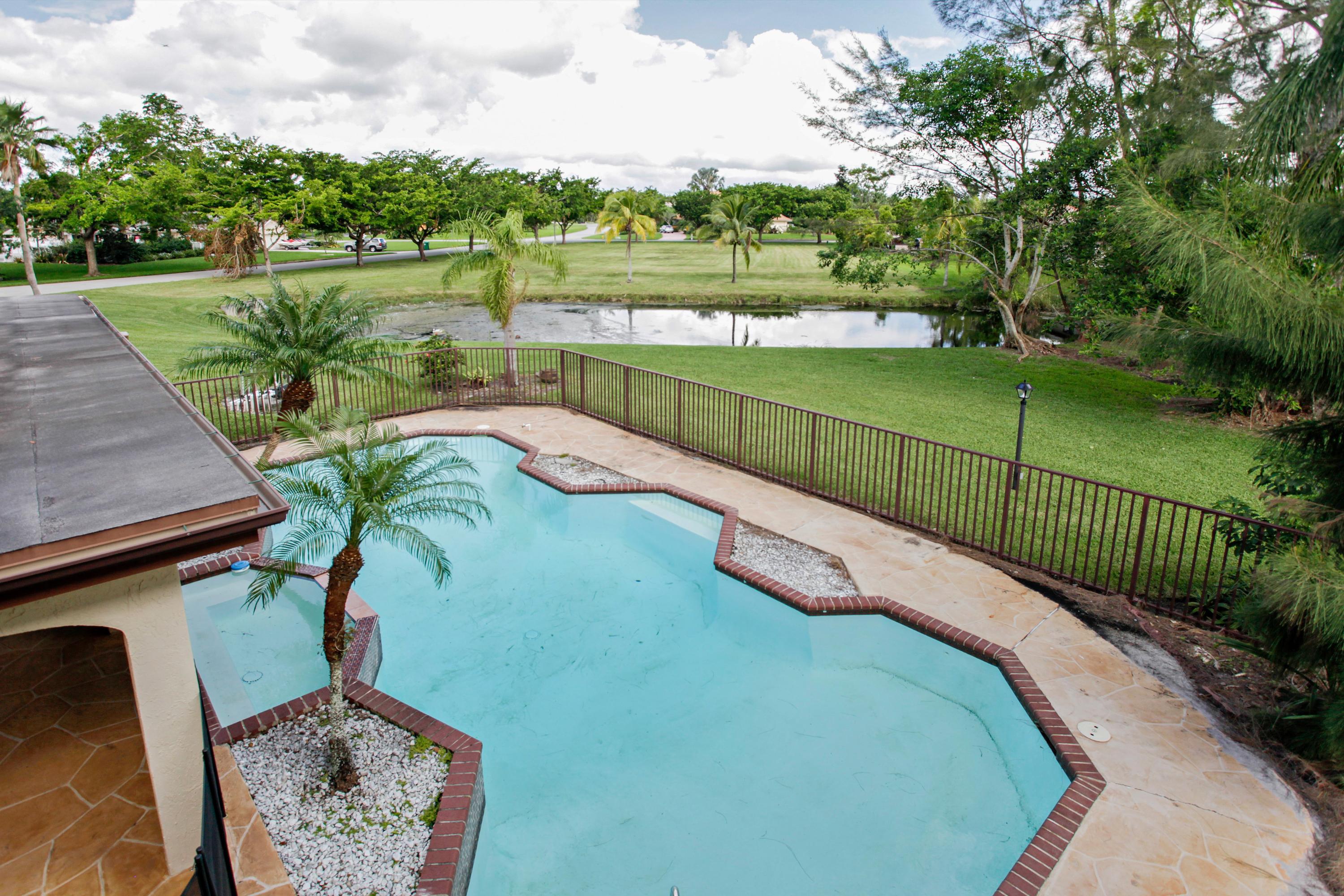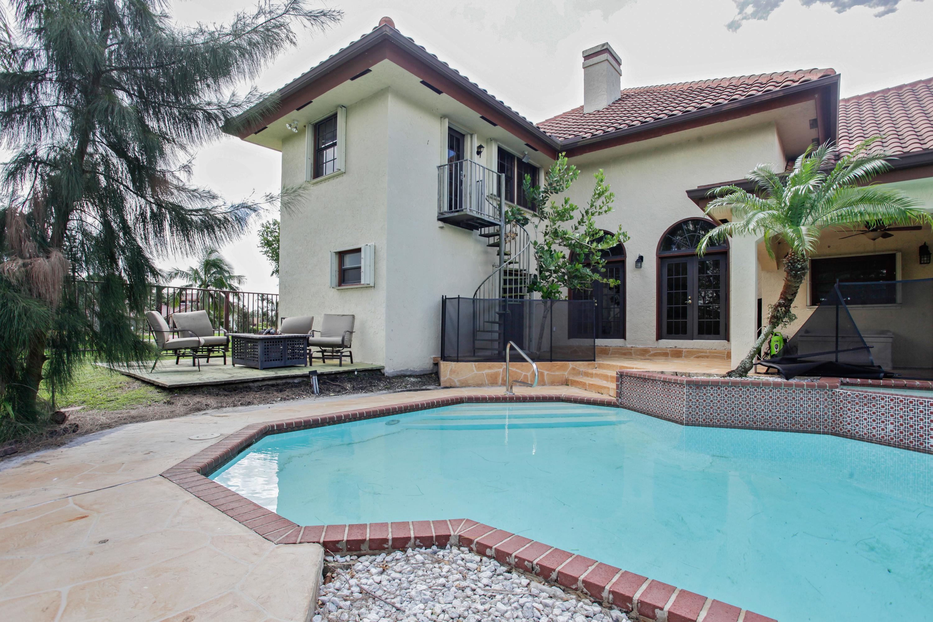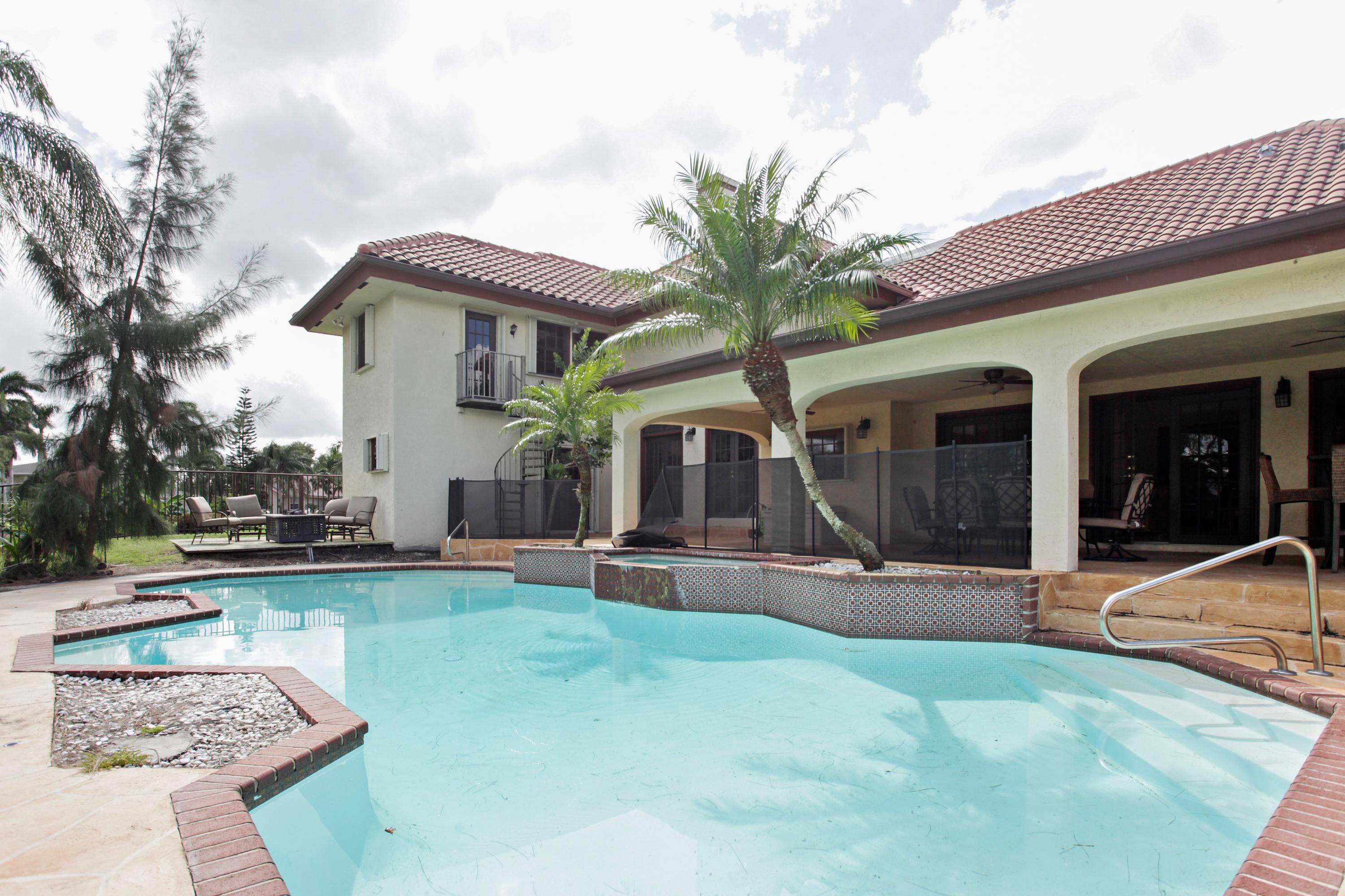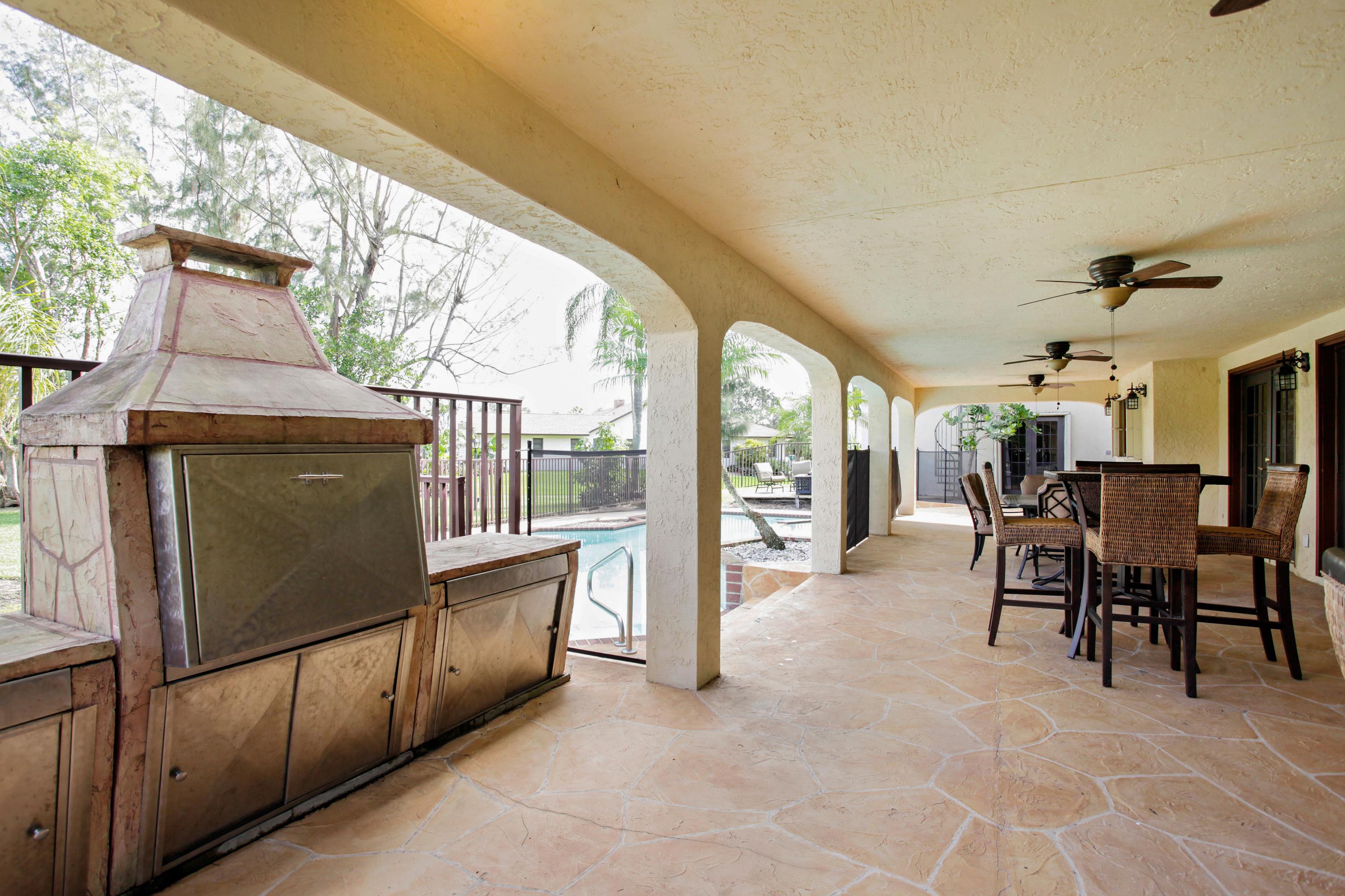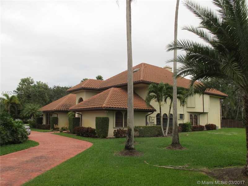 Breathtaking Mini Estate situated on a large corner acre lot on a pond. This spacious 5 Bedrooms, 5.1 Baths, 3 car garage, Mediterranean pool home has a unique open foyer, glass enclosed courtyard, and floor to ceiling fireplace, and built in bar. The updated open kitchen features stainless steel appliances, double oven, double refrigerator, granite counter tops, 42'' wood cabinets, accordian hurricane shutters, hardwood and tile floors. The Master bedroom suite has 2 spacious walk-in closets, large bathroom area, an adjacent private office, nursery/den with a Juliet balcony and spiral staircase leading to the pool and backyard. This home is ideal for entertaining with a build-in grill, fire pit, large pool and spa, and lush landscaping. A must