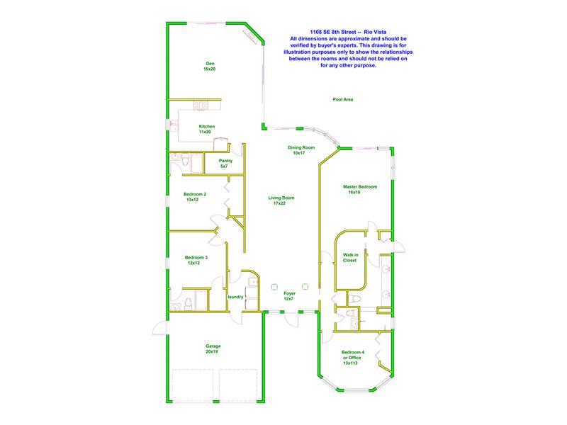 Single story with lots of elbow room on 75' lot. Four bedrooms. Den, kitchen, dining, living and master all open on to beautifully landscaped very private pool area. 10 foot ceilings with barrel vaulting in living room. Whole house generator powered to ru n everything. Impact windows and doors. Split bedroom with private master suite. One of Rio Vista's prettiest streets with excellent tree canopy. Dual fuel fireplace - wood/gas. This property feels like a true home - warm, inviting, scaled for real life.