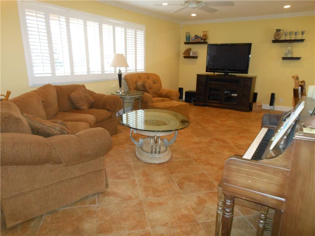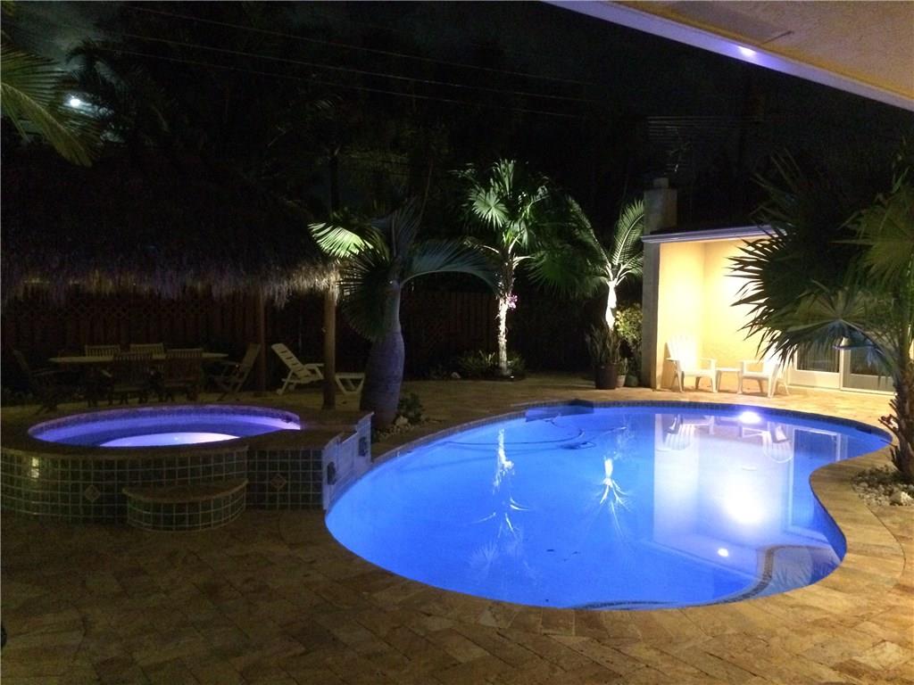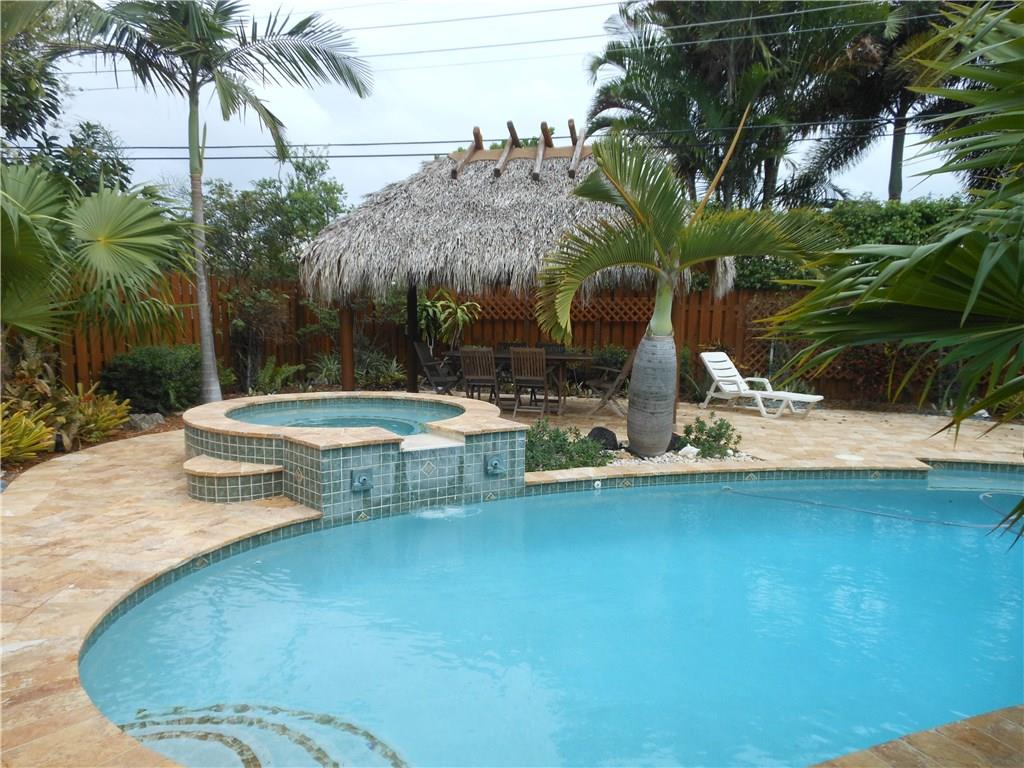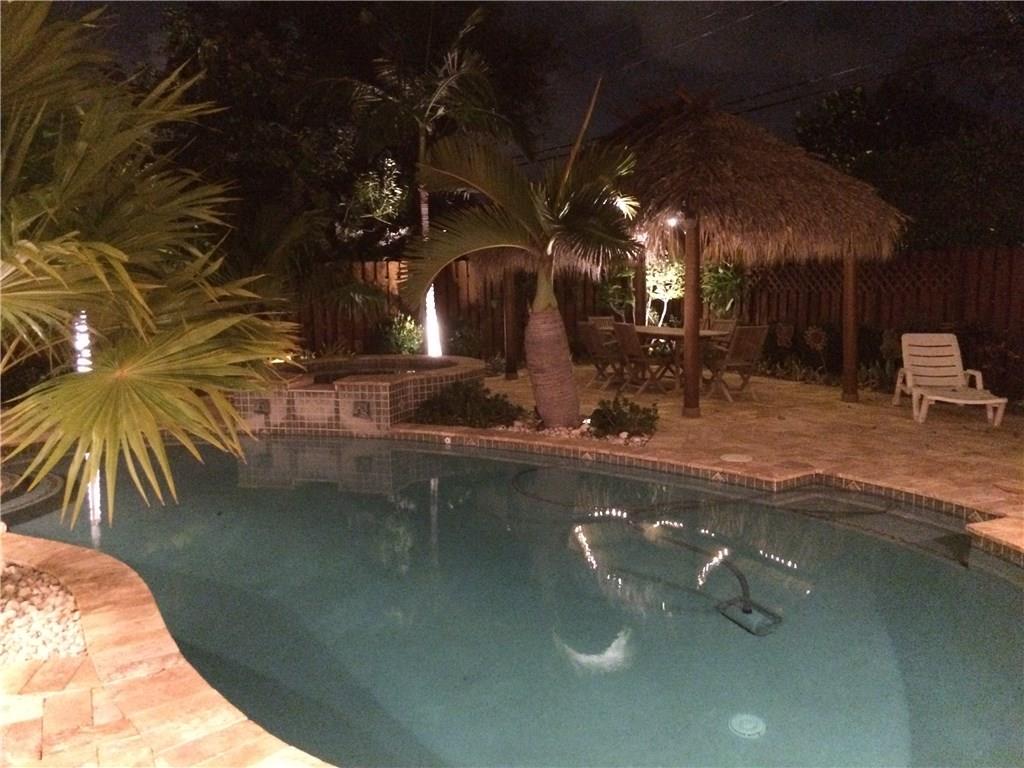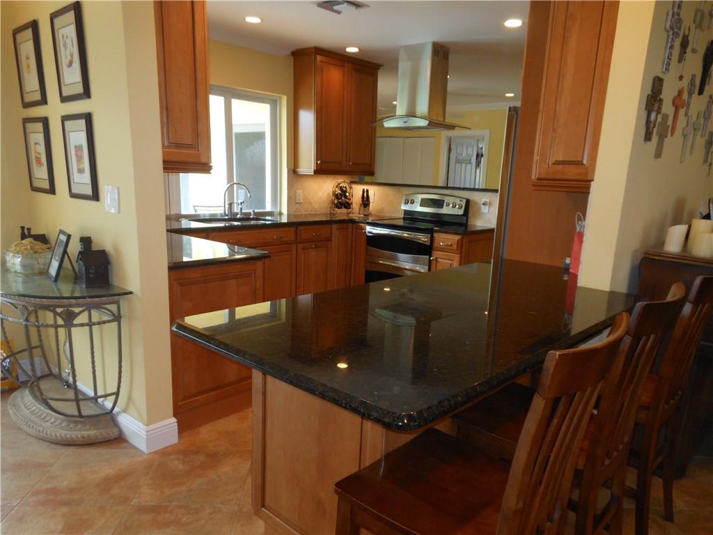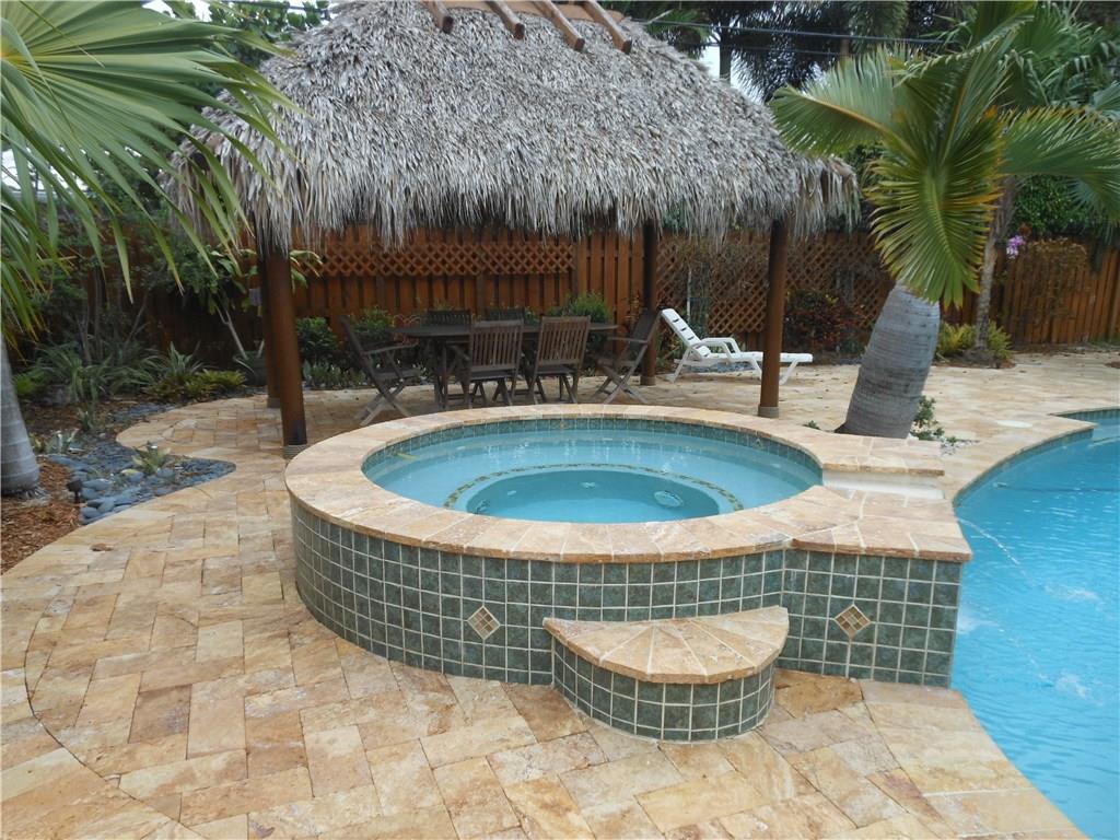 Resort Living-4/3 split plan, family room, heated pool/hot tub, laundry rm with storage, 2 car garage. Features: Impact windows/doors, remodeled kitchen opens to family room and dining area with granite, SS appliances, double sinks, pantry and breakfast bar, 3 updated baths, tile floors throughout. Tropical Paradise highlights a thatched palm tiki hut for outdoor dining, salt system pool/hot tub, travertine pavers, Kitchler Landscape Lighting. Sophisticated Lutron remote controlled lighting system.