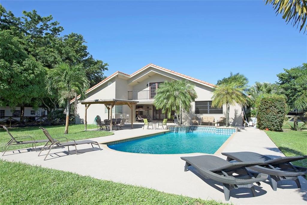 Welcome home to this recently updated mid-century home situated on a builder's acre in Davie. Located in A+ school district, on a quiet & peaceful street. Tranquil master suite offers direct access to covered jacuzzi tub, pool area & backyard. Quaint bath room with euro-style soaking tub & separate shower. Enter the home into the voluminous, bright great room featuring a spiral staircase to the loft [can be converted back to bedroom] currently used as office, balcony overlooking yard & pool area.
