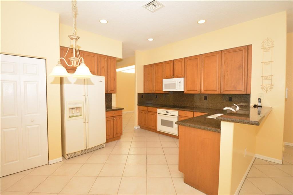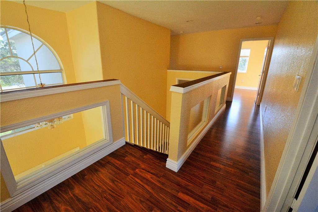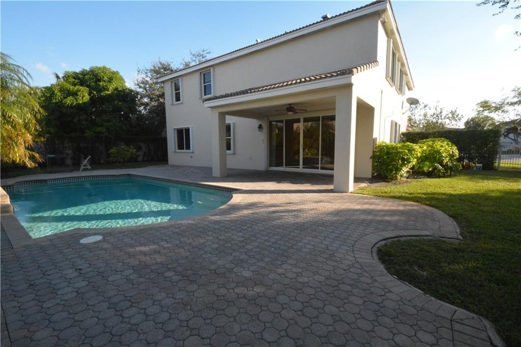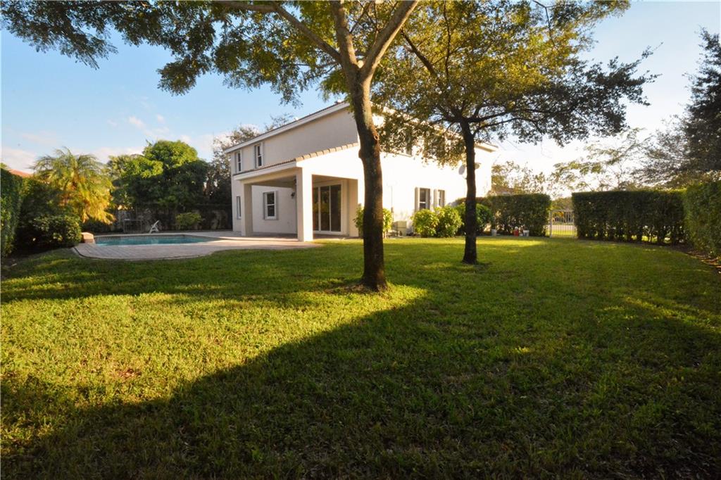 Enjoy the oversized pool, patio and expansive fenced in backyard of this 2 story home. The lush landscaping provides privacy and a resort style feel. Upper level has all wood floors, lower level has tile set on the diagonal. Kitchen has beautiful real wood cabinetry. Home is protected by accordion shutters. The quiet cul de sac makes this the perfect location! Gated community w/abundant green areas & parks.