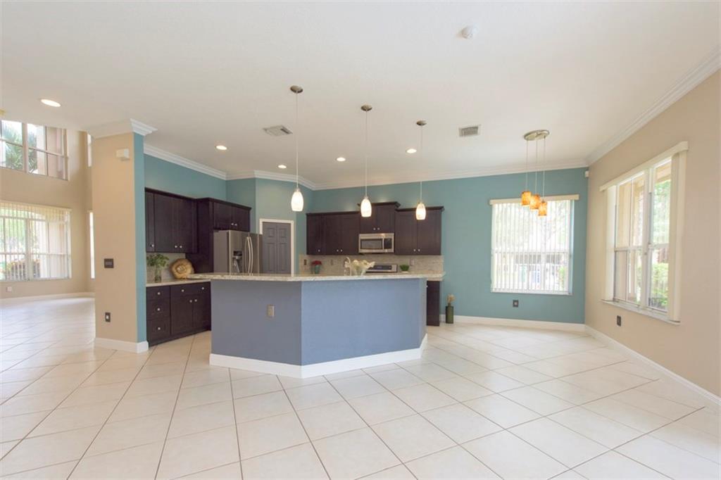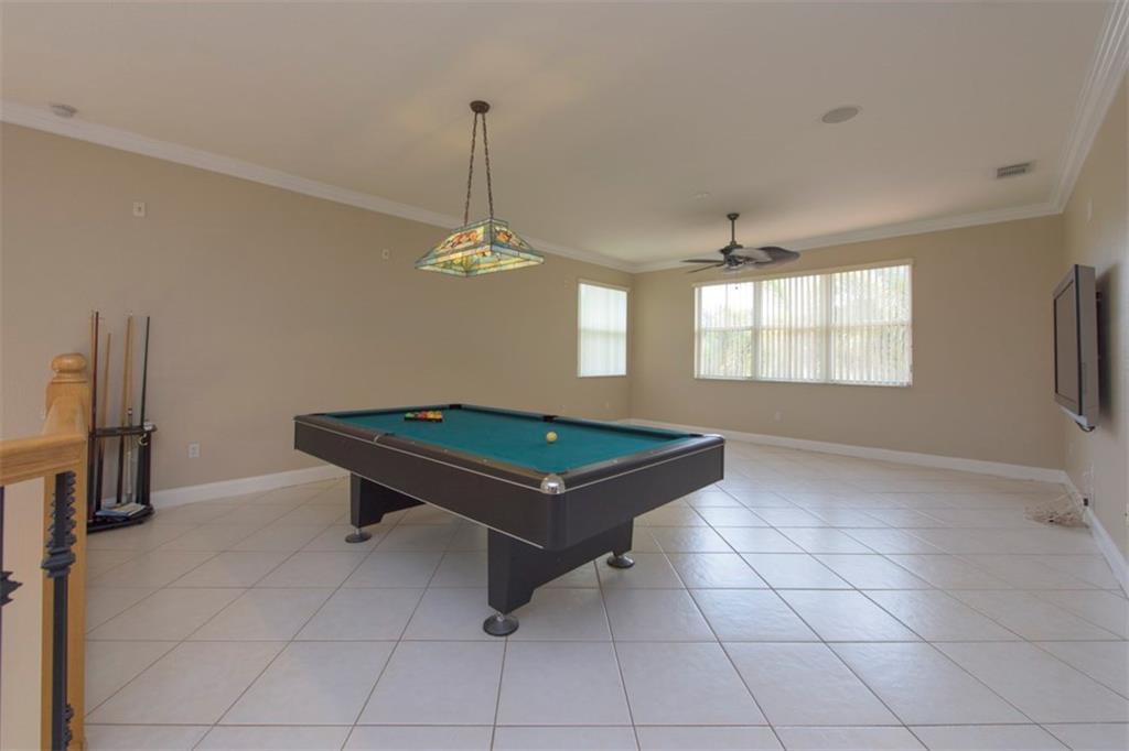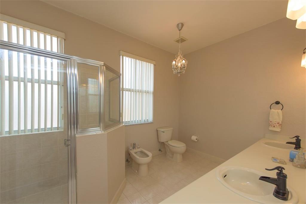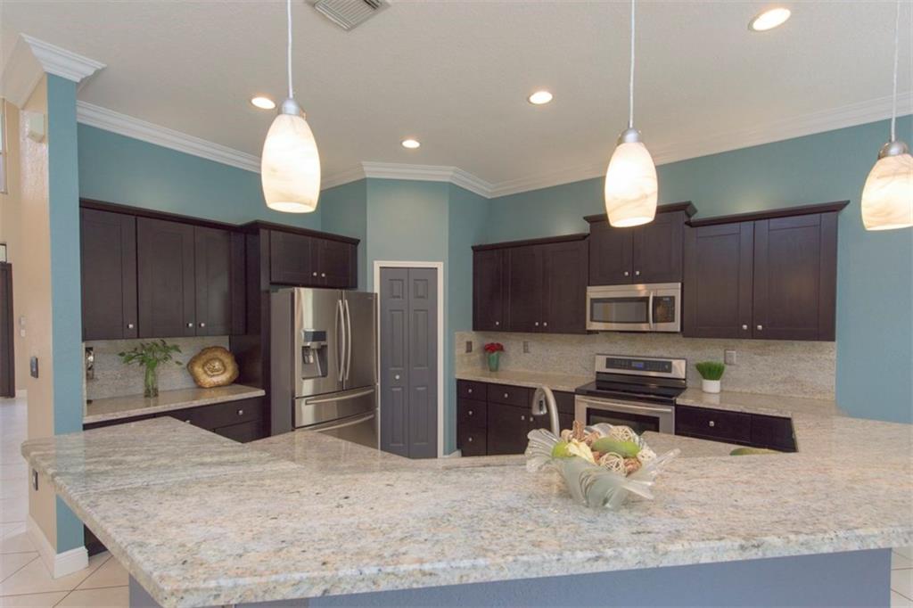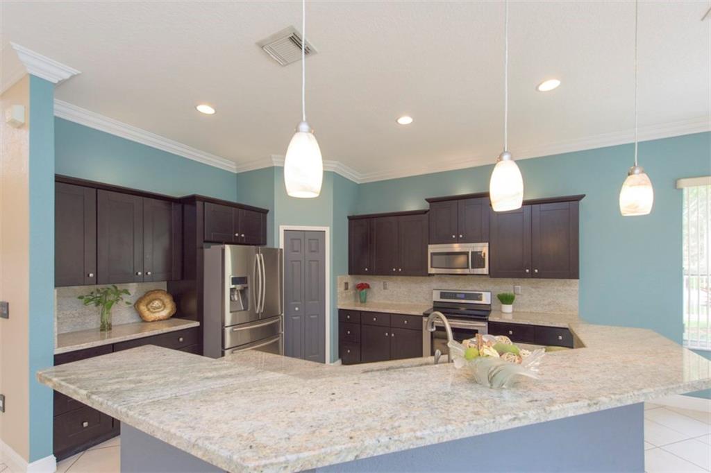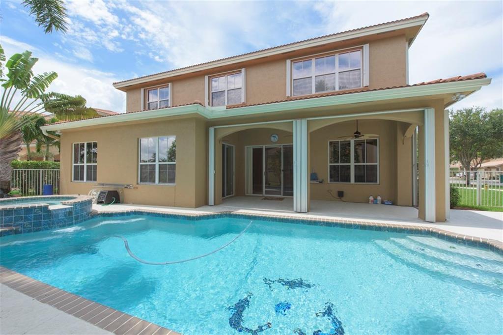 Spectacularly upgraded 2 story home with remodeled kitchen featuring granite, stainless appliances & gorgeous wood cabinets. Spacious master bedroom (1st floor) has 2 walk-in custom cabinet closets. Master bath has dual sinks, bidet & Jacuzzi tub. Huge loft-playroom. Heated pool with salt system & spa has wireless remote control. Hurricane shutters- all accordion upstairs. Tile & wood flooring. Fenced yard with covered patio has a view of the lake. 2 AC's (1 replaced 2014). Gated Community close to I-75.