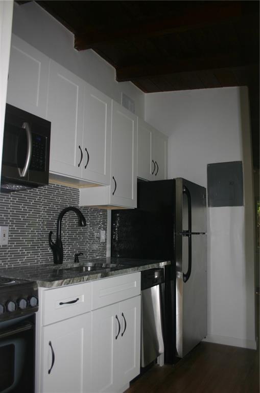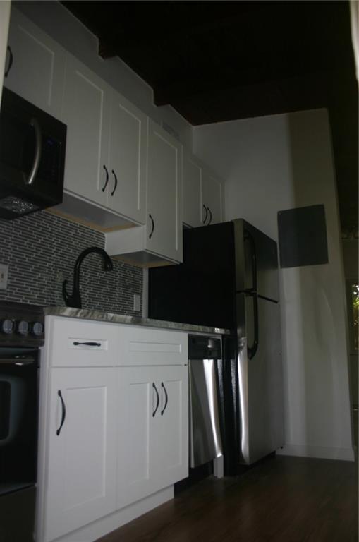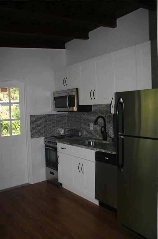 Cute home beautifully updated, w/new "Shaker" style kitchen cabinets, Quartzite counter-tops, all new stainless steel appliances (refrig, stove, micro & DW), hurricane impact windows, wood beam volume ceilings. Washer and dryer in laundry room, sprinkler system & nice big fenced yard. This home is priced lower than any in the neighborhood, has been updated & won't last long. Great area close to beach, I-95, shopping & the Atlantic Boulevard CRA District. East of Dixie Hwy, N of Atlantic. Easy to show!