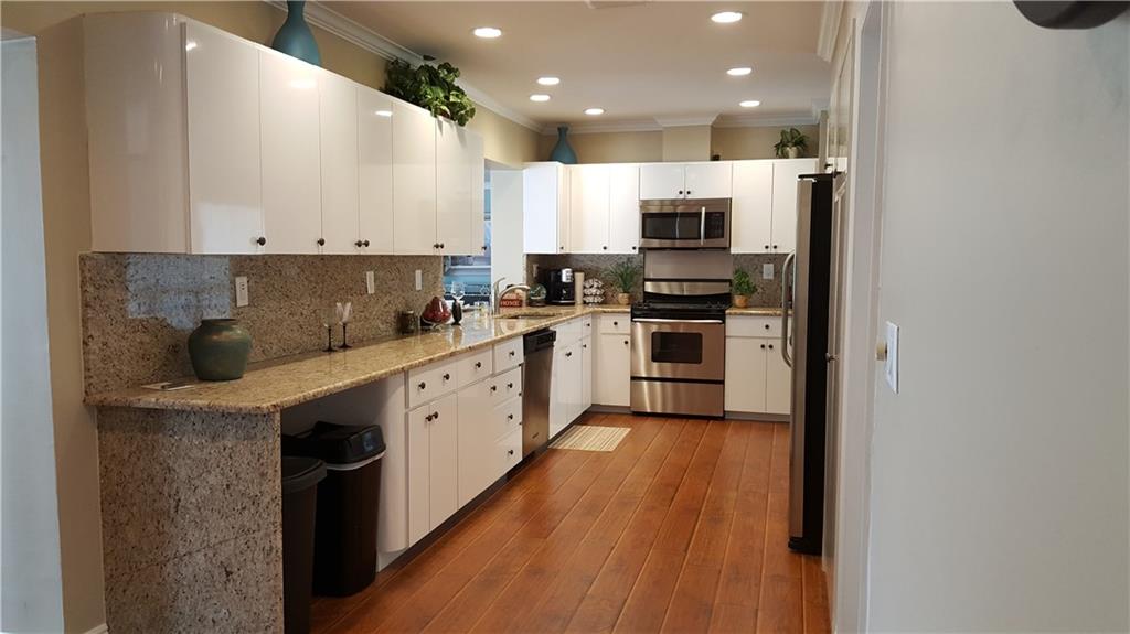 Elegantly updated 3/2 with open floor plan. Large master bath w/huge shower & large walk in closet. Kitchen has new recessed lighting, Granite, Stainless Steel appliances. New interior doors, crown molding, new wood flooring being installed, High efficiency AC. New 2nd Bath. Wall to wall windows in HUGE bonus/rec room/family room. Security system w/camera, phone apps for garage & A/C. Tropical landscaping. 2 Car Garage. Brick pavers driveway & back patio.