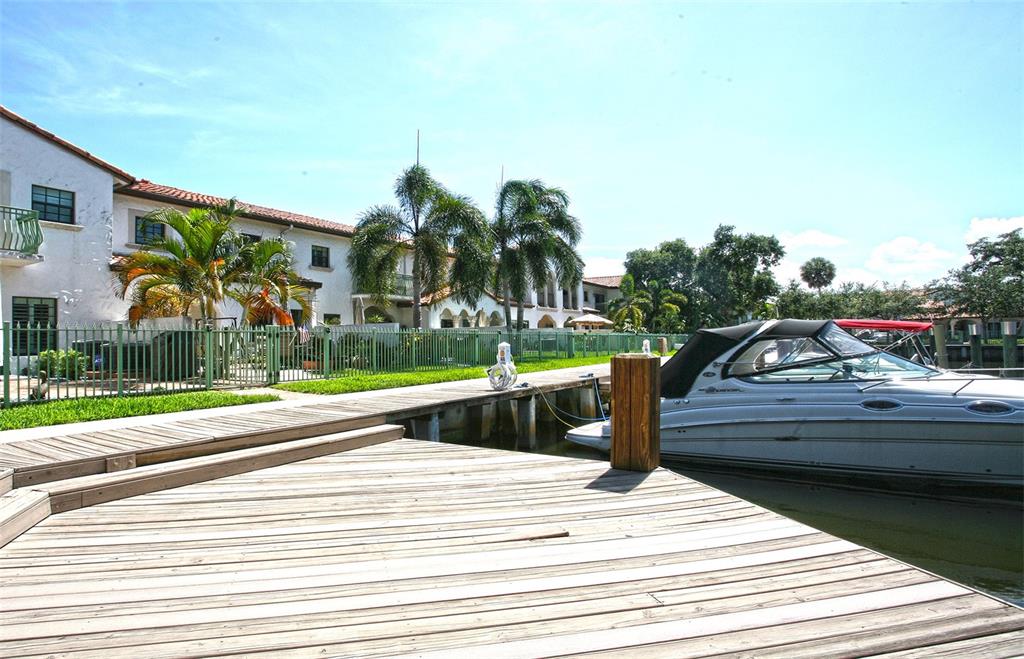 Model Town home in prestigious waterfront gated community. Unit includes a deeded a boat dock steps from the patio (incl power & water). This original builders model unit has 3 large bedrooms with 2.5 baths, updated Kitchen with top of the line appliances and granite counter tops. Barrel tile roof, hurricane impact windows and doors. Separate connection and circuit breaker panel for generator. Beautiful gated garden with grassy area for entertaining.