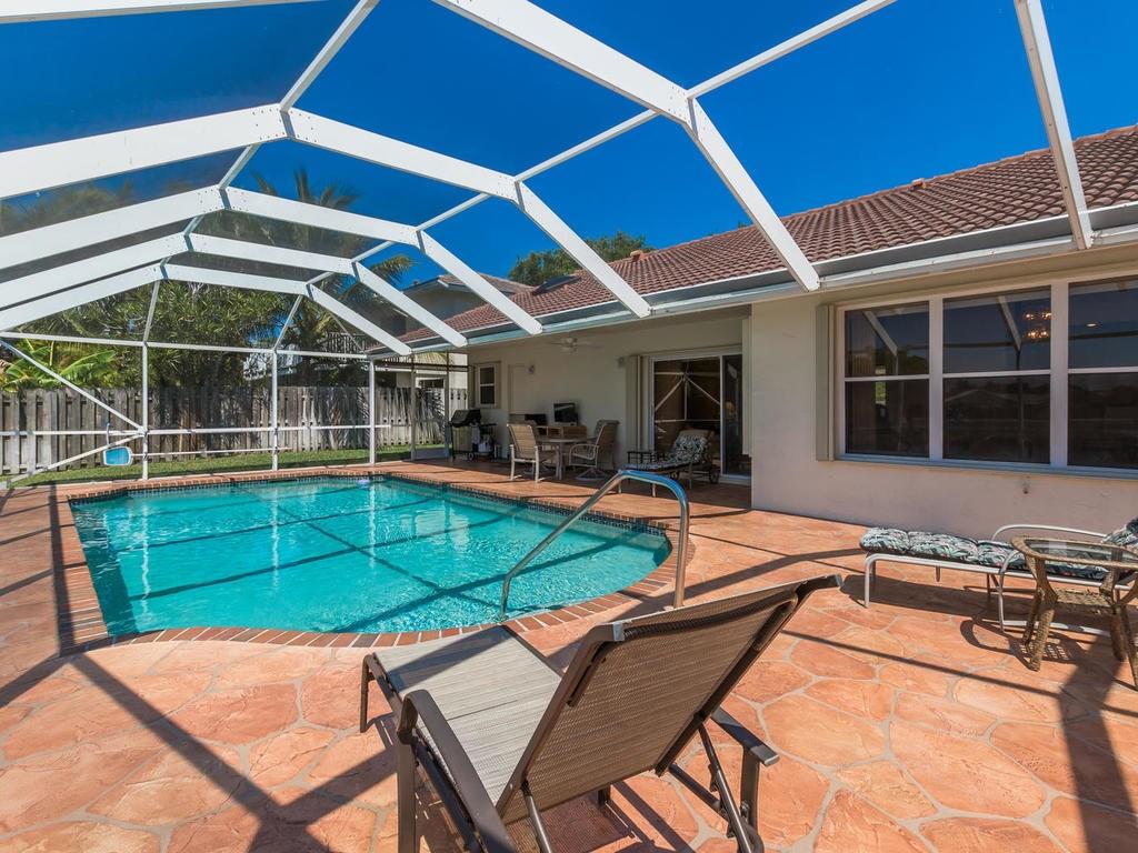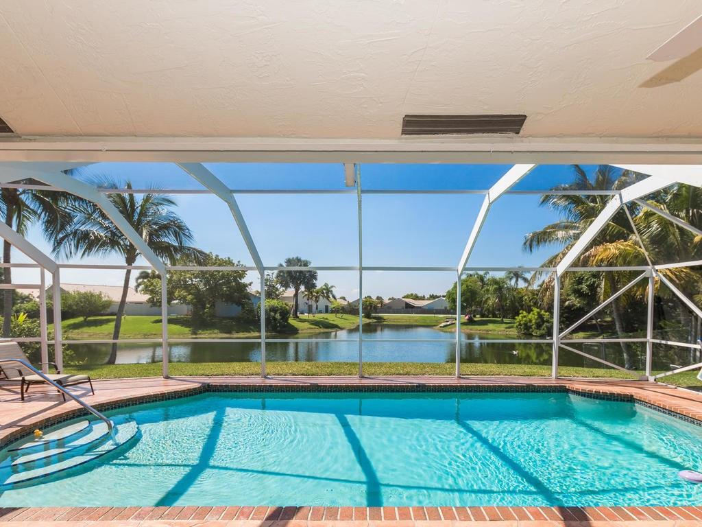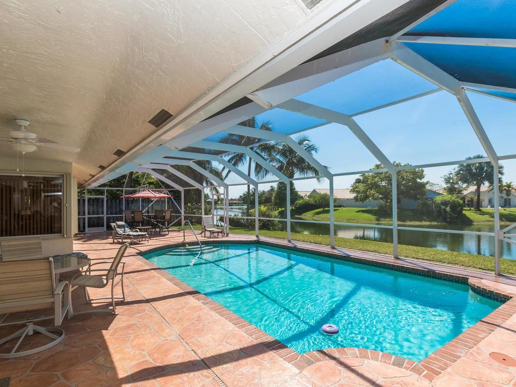 Immaculate original owner Montelana Model. 3 big bedrooms, 2 bathrooms. Open floor plan, walk through front doors and overlooking beautiful lake and screened in pool with aprox 1500 sq. ft. euro-tile pool/patio! Kitchen features quartz countertops and stainless appliances including a convection oven and a Bosch dishwasher. Barrel tile roof, Gutters, accordion hurricane shutters, Concrete driveway ,freshly painted inside and out! "A" Schools!