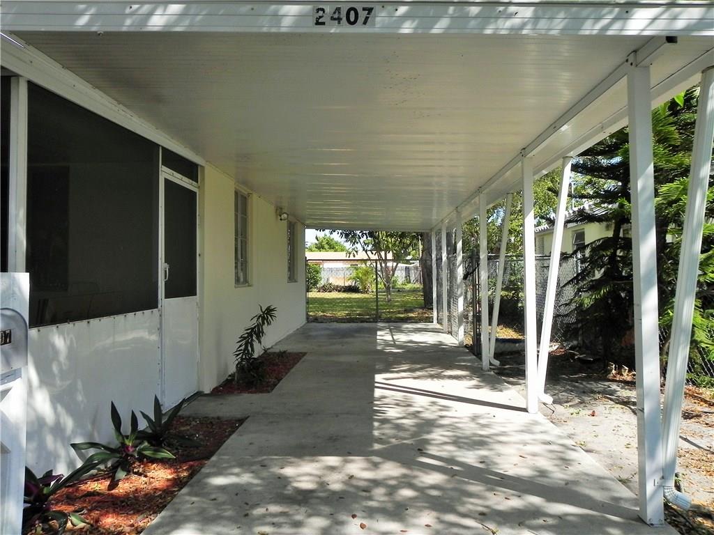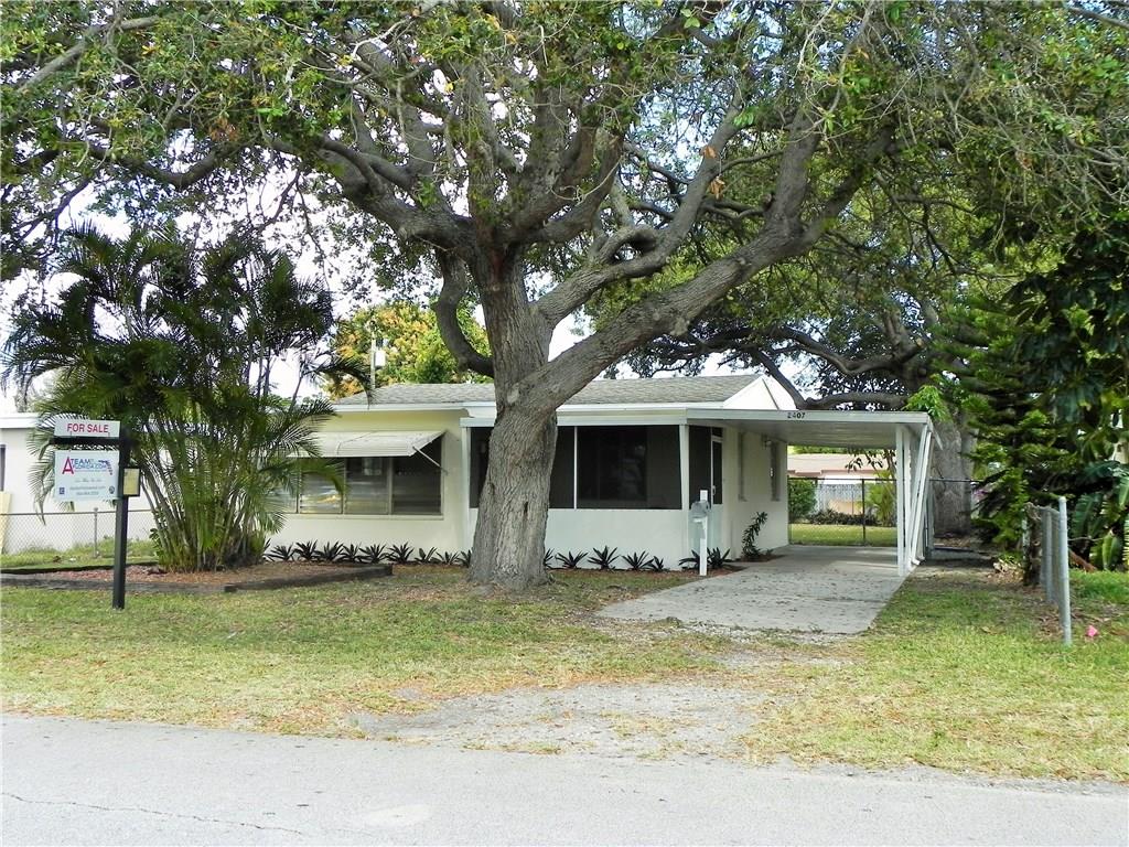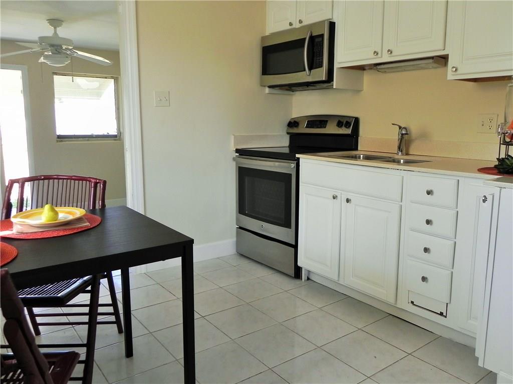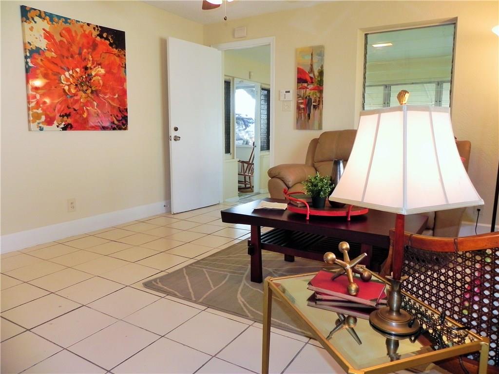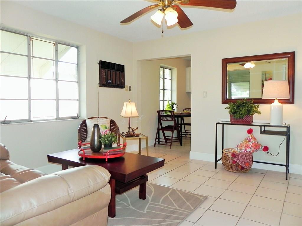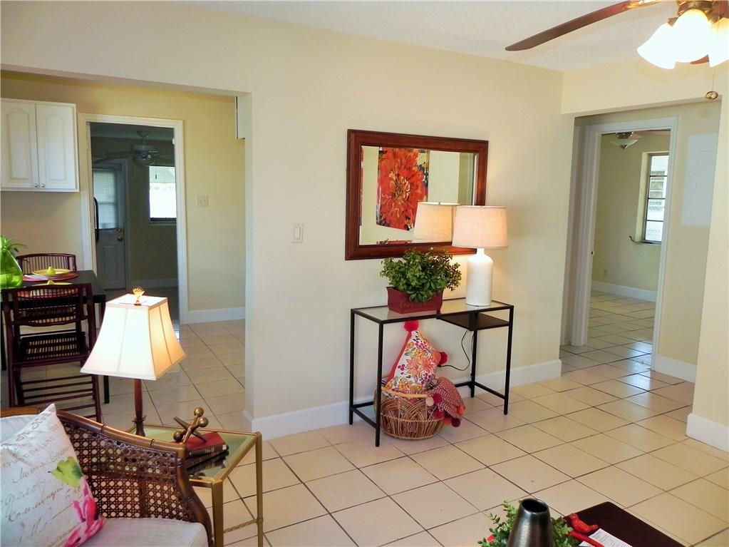 Great starter home, freshly painted, updated kitchen and bath. Big back yard with room for expansion or pool. Tile floors throughout. Three bonus rooms; screened patio as you walk in from covered carport, glassed-in patio with entrance door to living room and large utility room in the back with stainless steel refrigerator and washer/dryer hook-up. Cozy eat-in kitchen with stainless steel range & microwave. Termite treatment completed in past month; warranty available. Wall A/C. Furniture for sale. AS IS