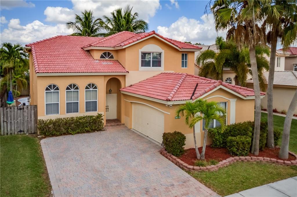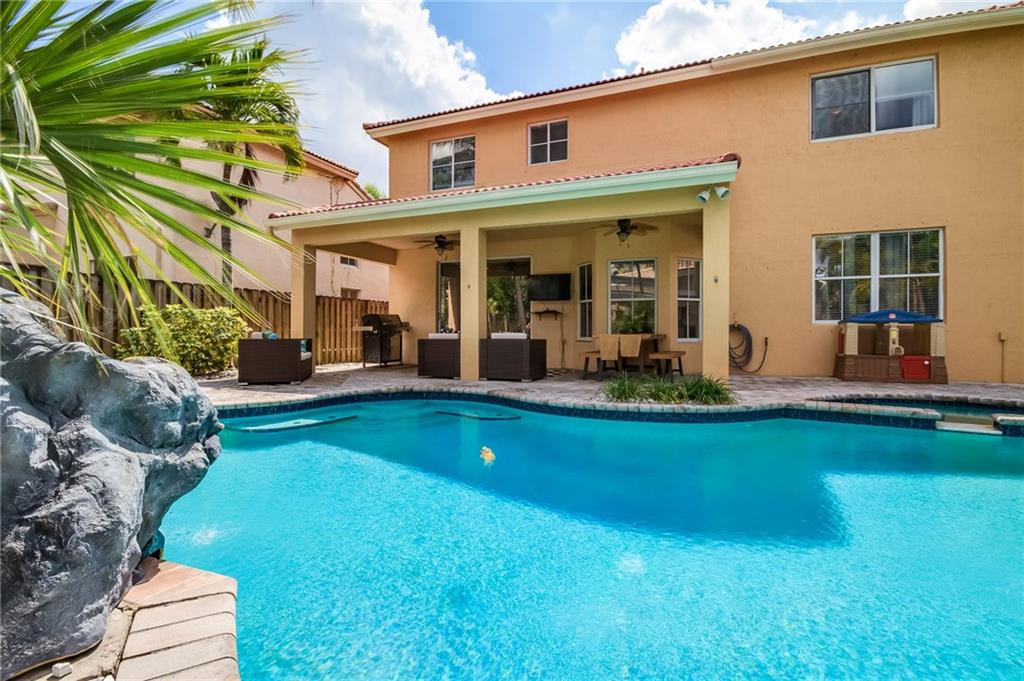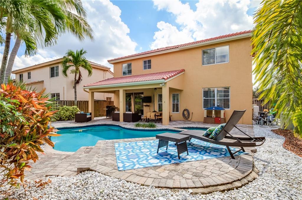 Beautiful 4 Bdrm 3 Bath home in prestigious Poinciana Parc. One full bdrm & bath down stairs, upgraded kitchen, large master bdrm with tray ceiling and remodeled master bath & closets, newly tiled first floor, carpeted second floor, hurricane shutters, huge covered patio($13,000 builders upgrade), salt pool and heated spa, lushly landscaped and fully fenced in backyard. Great pool and patio area to entertain. 2 A/C units, Excellent Davie schools and security of a 24 hr manned guard gate.