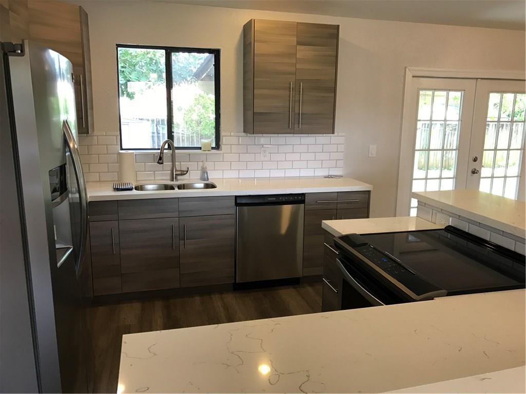 COMPLETELY REMODELED 3 BEDROOM, 2 BATH HOME WITH VAULTED CEILINGS LOCATED AT THE END OF A QUIET STREET. NEWER A/C (2010), PRIVATE FENCED BACK YARD, BEAUTIFUL WOOD LAMINATE FLOORING THROUGHOUT LIVING AREAS, TILE IN BATHROOMS, REMODELED KITCHEN WITH STAINLESS STEEL APPLIANCES, QUARTZ COUNTERTOPS, AND SOFT CLOSE CABINETS AND DRAWERS, LARGE MASTER CLOSET WITH BARN DOOR, STORAGE SHED IN THE BACKYARD, COVERED PATIO WITH FRENCH DOORS LEADING OUT FROM THE LIVING ROOM.