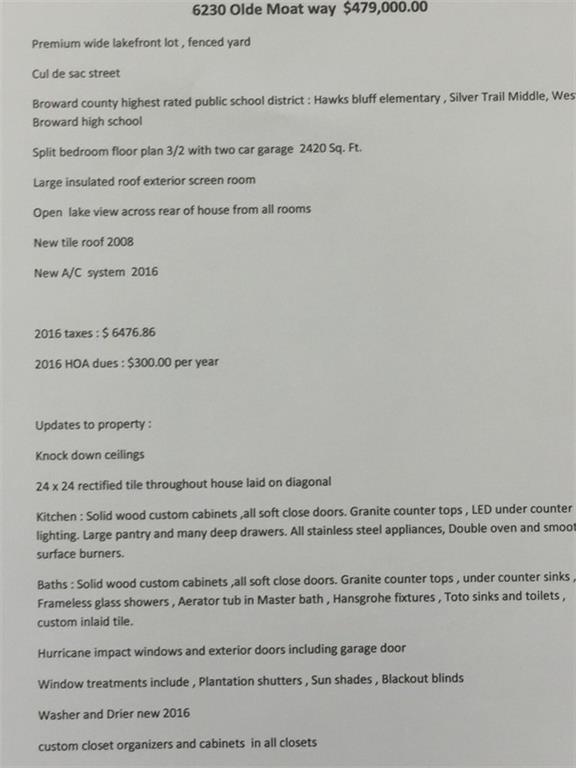 Premium Lakefront home in West Davie. Easy access to major interstates and close to exits. Quiet cul-de-sac street, Unique features and recent upgrades makes this property the exact definition of "Turn key" condition. Lake views from six different rooms in the house. Enjoy sitting on your large screen patio with the sun rising up from the lake and prevailing easterly breezes keeping you cool.