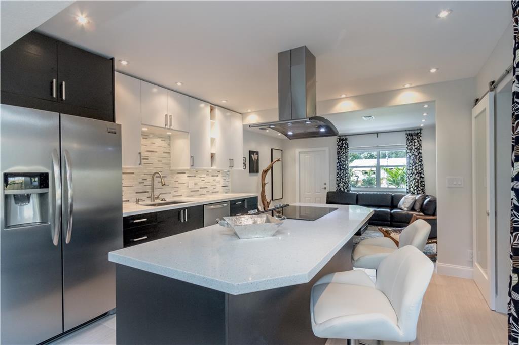 STUNNING CONTEMPORARY HOME steps to WILTON DRIVE! Wide open kitchen, dining & living space, new designer tile flooring throughout, gorgeous kitchen with quartz counter tops, brand new high-end stainless steel appliances, large center island, recessed lighting, modern glass doors throughout & beautiful chic & sophisticated bath. Expansive fenced in backyard with room for a pool! Wilton Manors without the price! Don’t miss.
