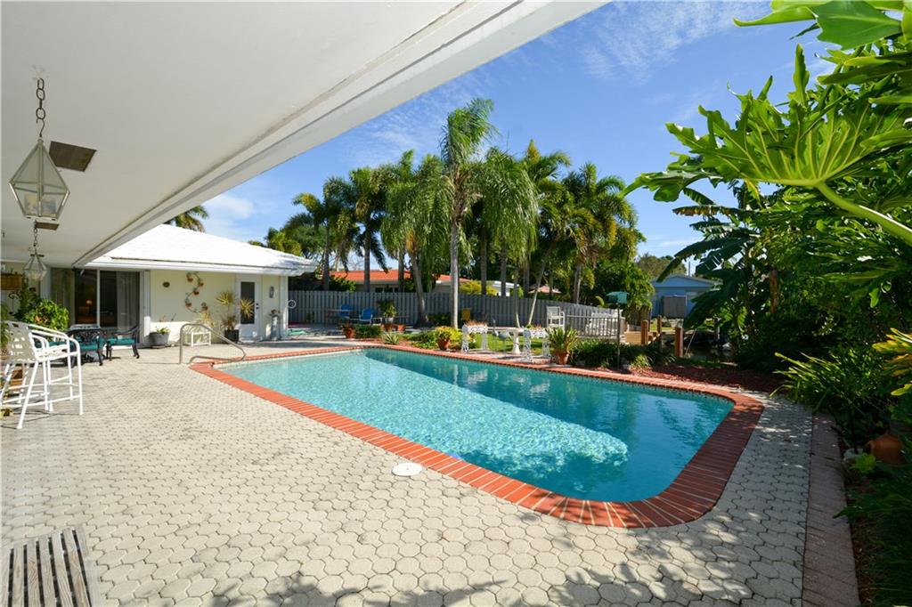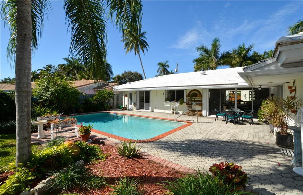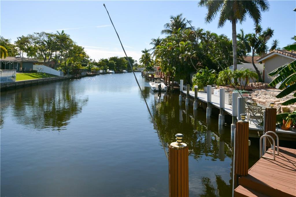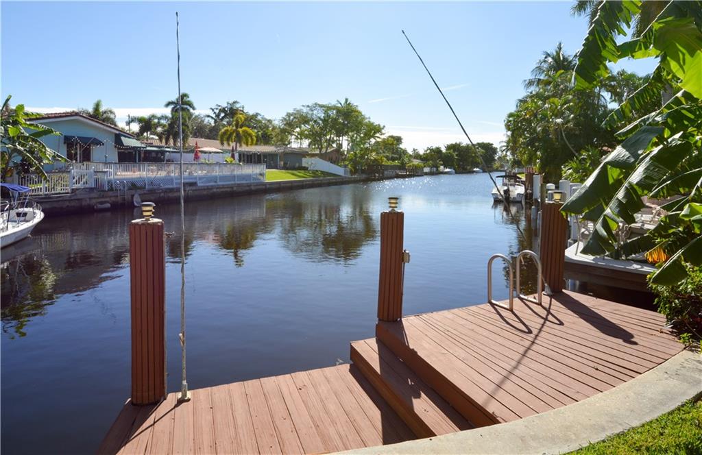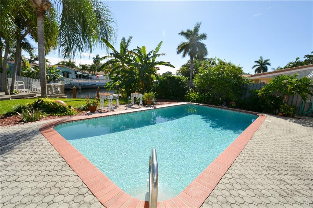 Oversized waterfront corner lot in a cul-de-sac section of N. Ft Lauderdale! Tree lined swales, sidewalks, features a lg eat-in kitchen, counter bar, pantry, 3rd bath & laundry rm; separate dining rm with lg picture window, spacious living rm, huge18’x18’ master with sitting area, dressing rm, multiple closets & bath; 2 car garage, pavered driveway & walkway. Double front doors located through a quaint courtyard featuring a sm fountain & pond. Lg backyard, pool, multi-level decks & dock lots of potential!