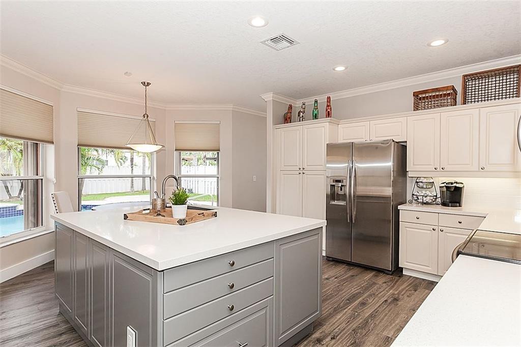 Spectacular pool home in the guard-gated Silver Shores community! Home features an open, renovated kitchen w/ huge island, quartz counters & stainless steel appliances. Enormous master suite features a sitting area, 2 walk-in closets & renovated bath. Brand new wood floors & fresh paint throughout. The fenced backyard is perfect for entertaining complete w/ pool, patio, exterior lighting, sound system & retractable awnings. 2 new Trane AC units & accordion shutters. Community tennis courts, pool, gym etc.