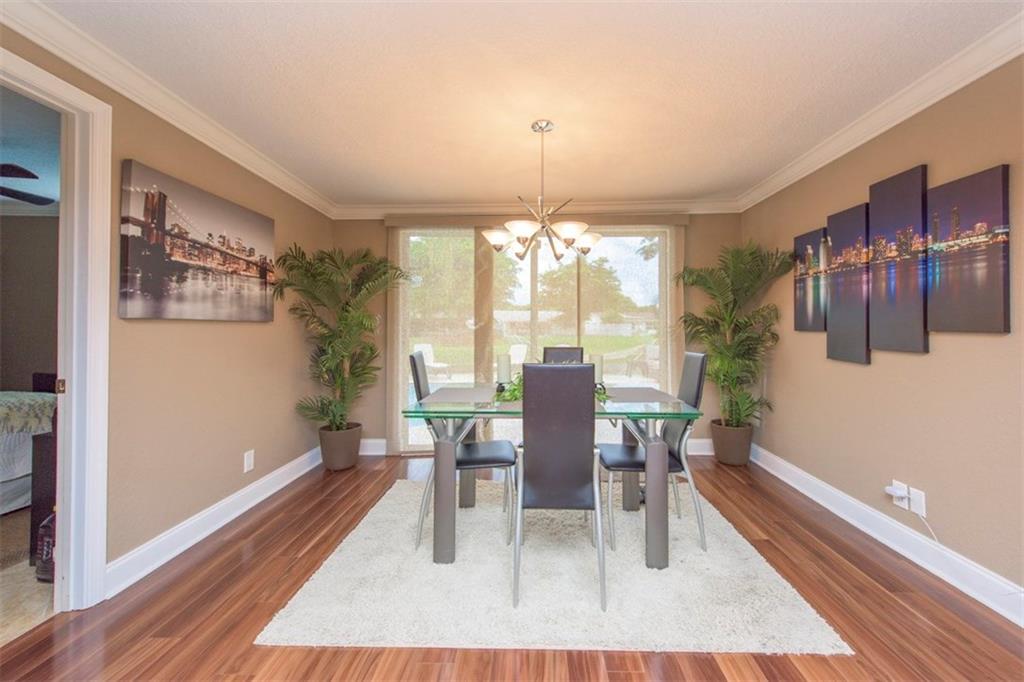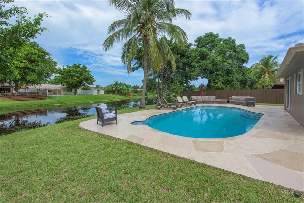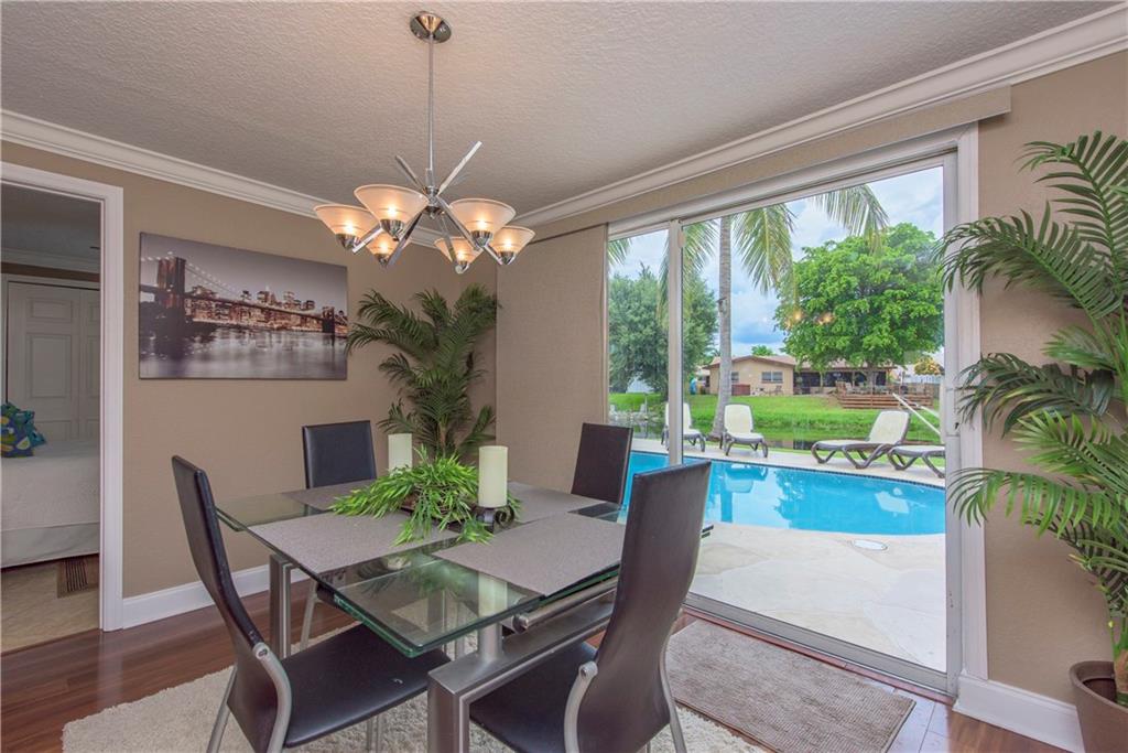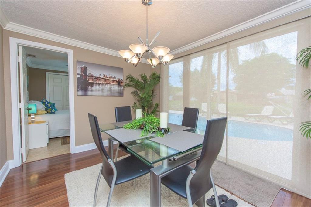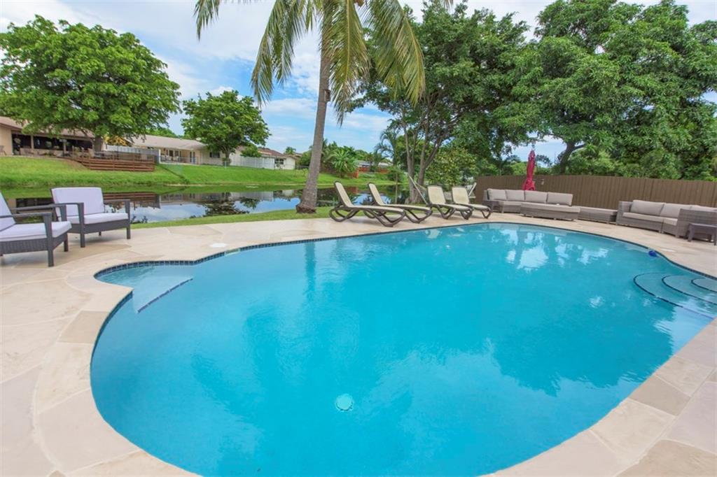 Delightful Waterfront Pool home. This Beautiful 4/2 boasts over 1,800 square feet of living space. Large, Open Floor Plan w/Pool, Garden & Water Views throughout. Spacious & Updated eat-in Kitchen w/Granite counter tops, Wood Cabinetry, Stainless Steel appliances & Snack Bar. Poolside Formal Dining Room. Stunning Engineered Flooring throughout. Magnificent Resort-Style Waterfront Pool Area, ideal for Entertaining. Split bedroom plan. Walk-in closets. Laundry room. Crown Molding and Recess Lighting.