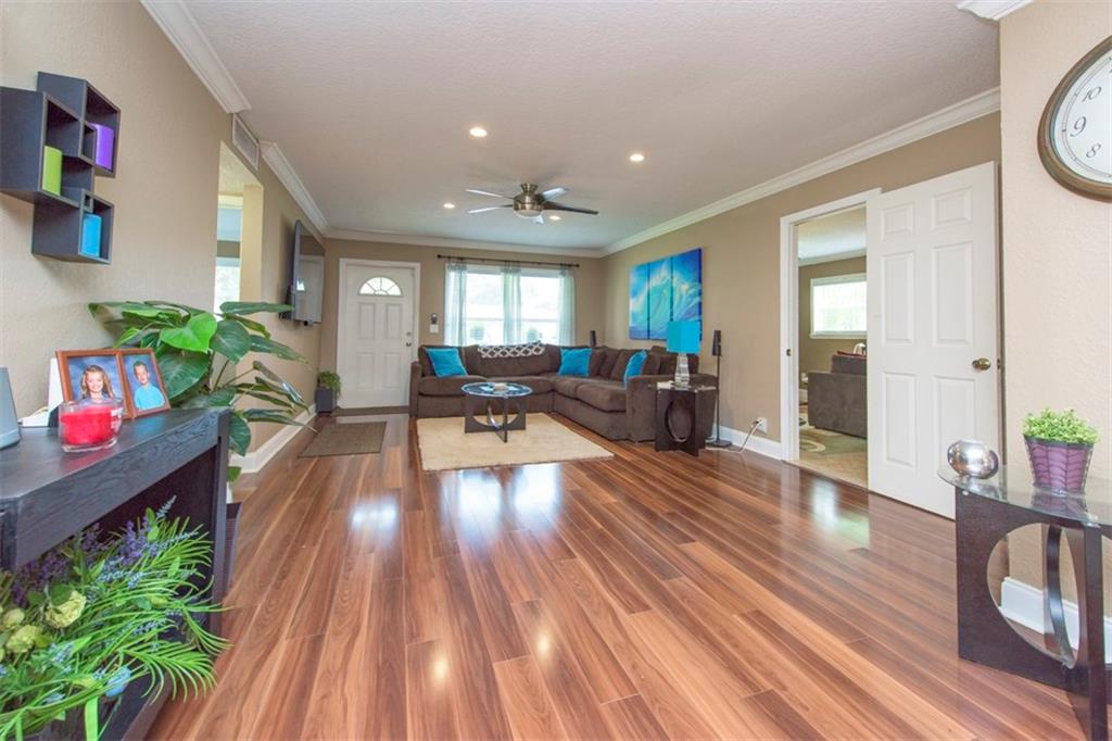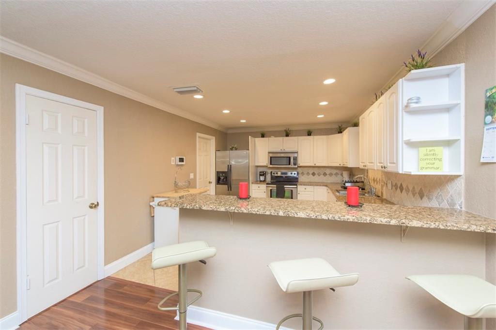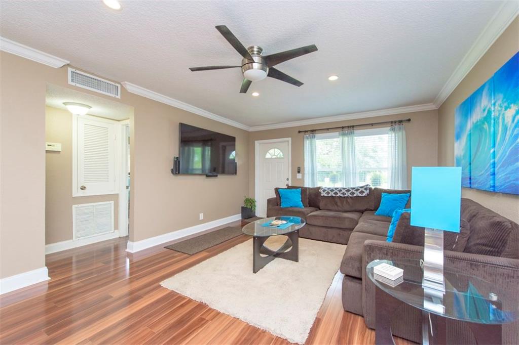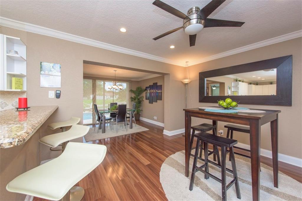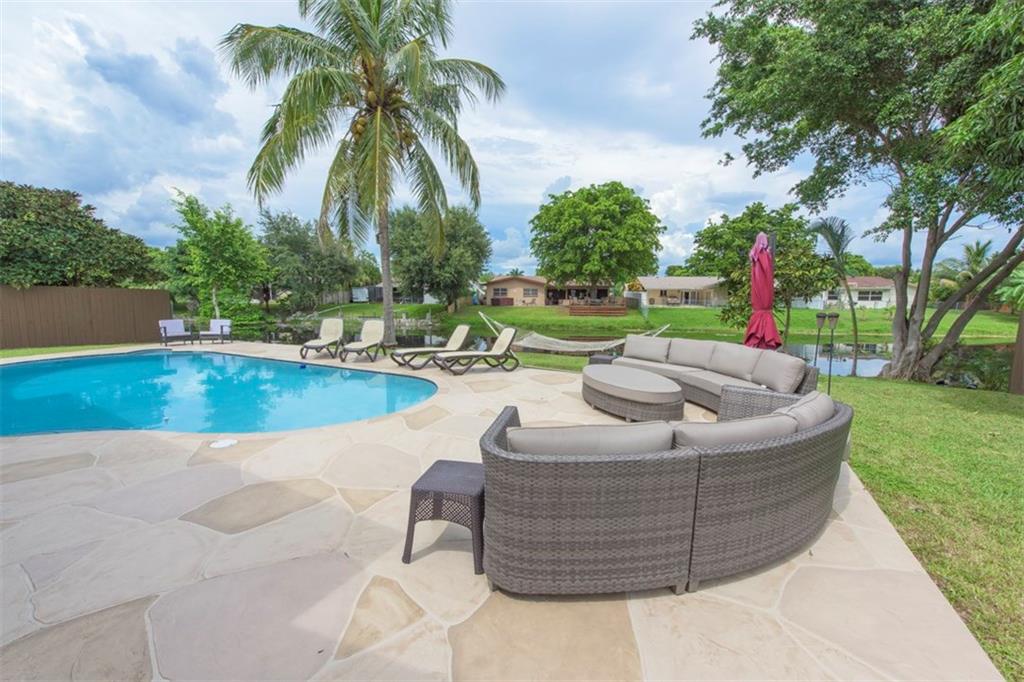 Delightful Waterfront Pool home. This Beautiful 4/2 boasts over 1,800 square feet of living space. Large, Open Floor Plan w/Pool, Garden & Water Views throughout. Spacious & Updated eat-in Kitchen w/Granite counter tops, Wood Cabinetry, Stainless Steel appliances & Snack Bar. Poolside Formal Dining Room. Stunning Engineered Flooring throughout. Magnificent Resort-Style Waterfront Pool Area, ideal for Entertaining. Split bedroom plan. Walk-in closets. Laundry room. Crown Molding and Recess Lighting.