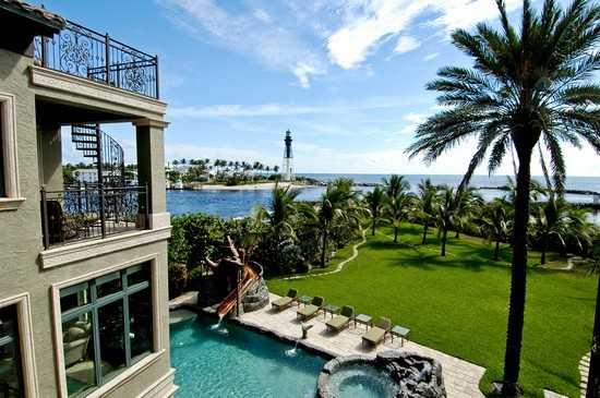Oceanfront Point Lot. One-of a-kind location directly on the Ocean and the Hillsboro Inlet. Views are spectacular! Come home to your own Private Resort. Built in 2004, with the finest craftsmanship and details. Enter into a 2 storied living room with wal ls of glass and endless ocean views looking over a huge backyard with a resort style pool, built in summer kitchen, even a water slide for the kids! 5 bedrooms, plus a beautiful office, a media/game room & exercise room. Offered completely furnished.