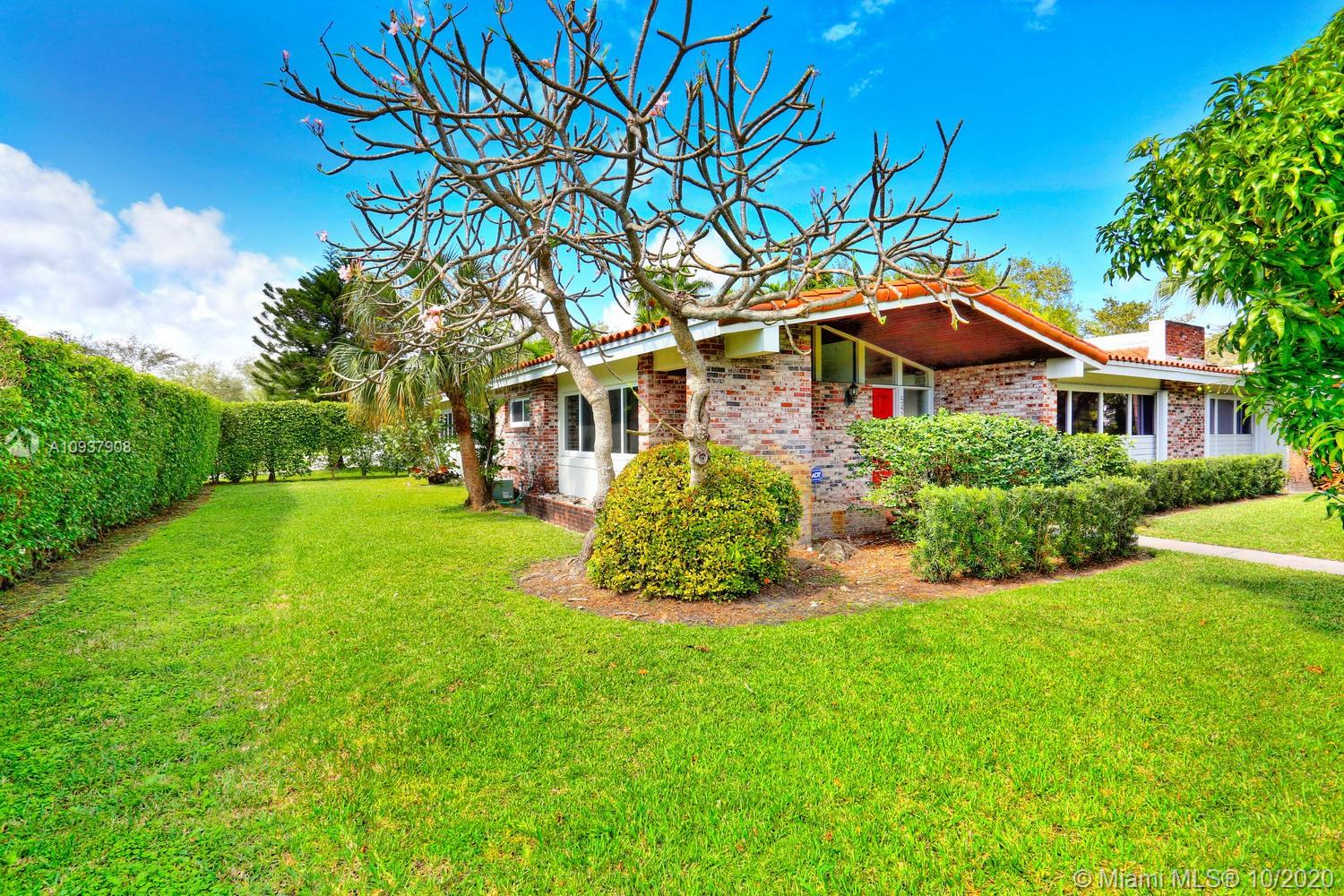 Classic mid-century modern-style home on historic & tree-lined Alhambra Circle. Hidden behind a tall privacy hedge and surrounded by 11,550 SF of gardens with fruit trees & tropical landscaping. Light-filled, open living spaces feature vaulted ceilings and banks of French doors that overlook ultra-private courtyard with large pool & terrace. Split-plan bedroom layout with 4th BR/BA ideal for housekeeper or guests ( private entrance). Notable features include: sunny kitchen w/ gas range & granite countertops, large master suite w/vaulted ceilings, separate laundry room, 2 car garage & most windows & doors with impact glass. Walking distance to UM campus, Riviera Country Club and close to The Biltmore Hotel.