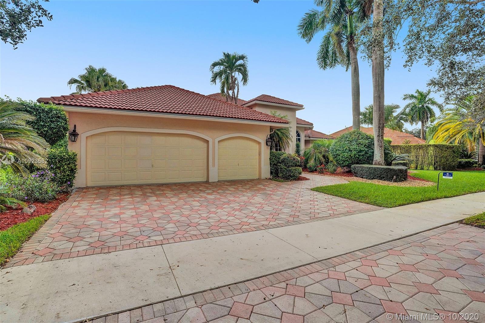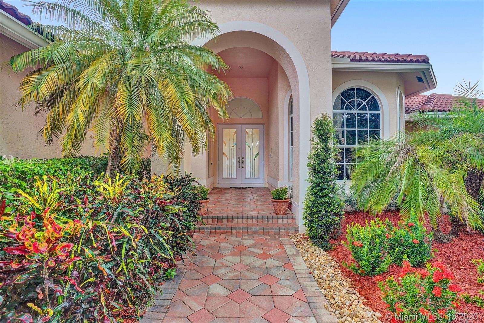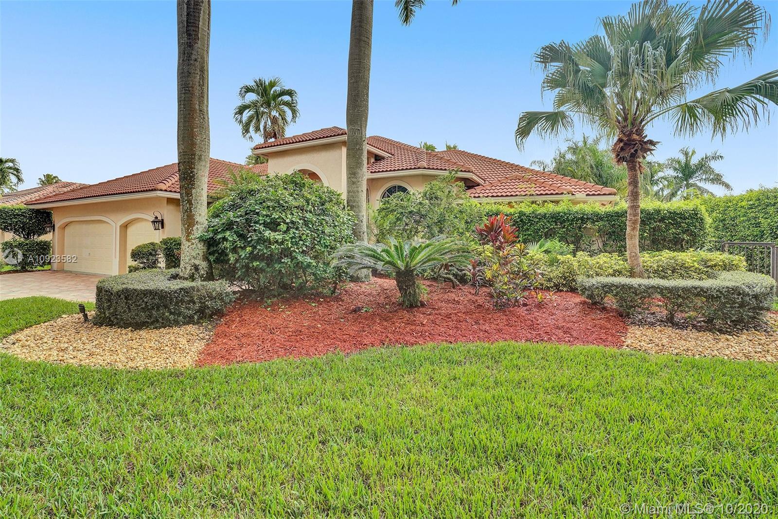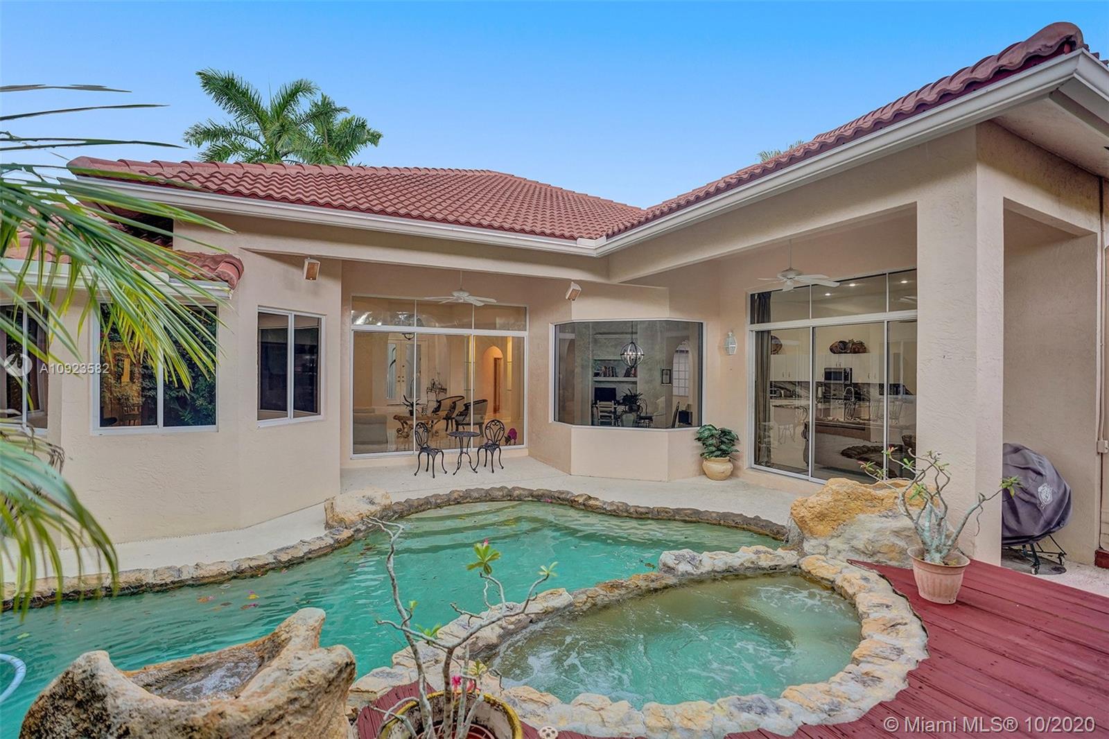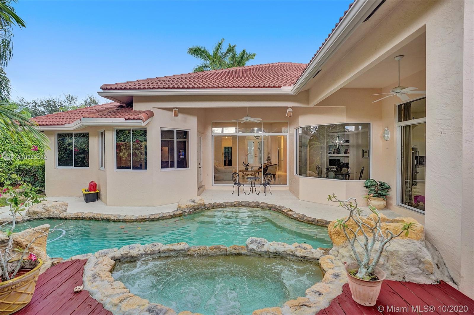 Four spacious bedrooms plus den/office. Tucked in the boutique community of Maple Island in The Islands at Weston. This custom one-story home features soaring ceilings with windows on the pool. Fully fenced yard with lush tropical landscaping and deck. Freeform pool with waterfall function and spa. White kitchen with renovated granite countertops and stainless steel appliances. Triple split plan with grand owners suite plus sitting area with door to the pool. Newly renovated owners bath with roman tub, new floorings, granite countertops, white cabinetry, and shower. NEWER ROOF