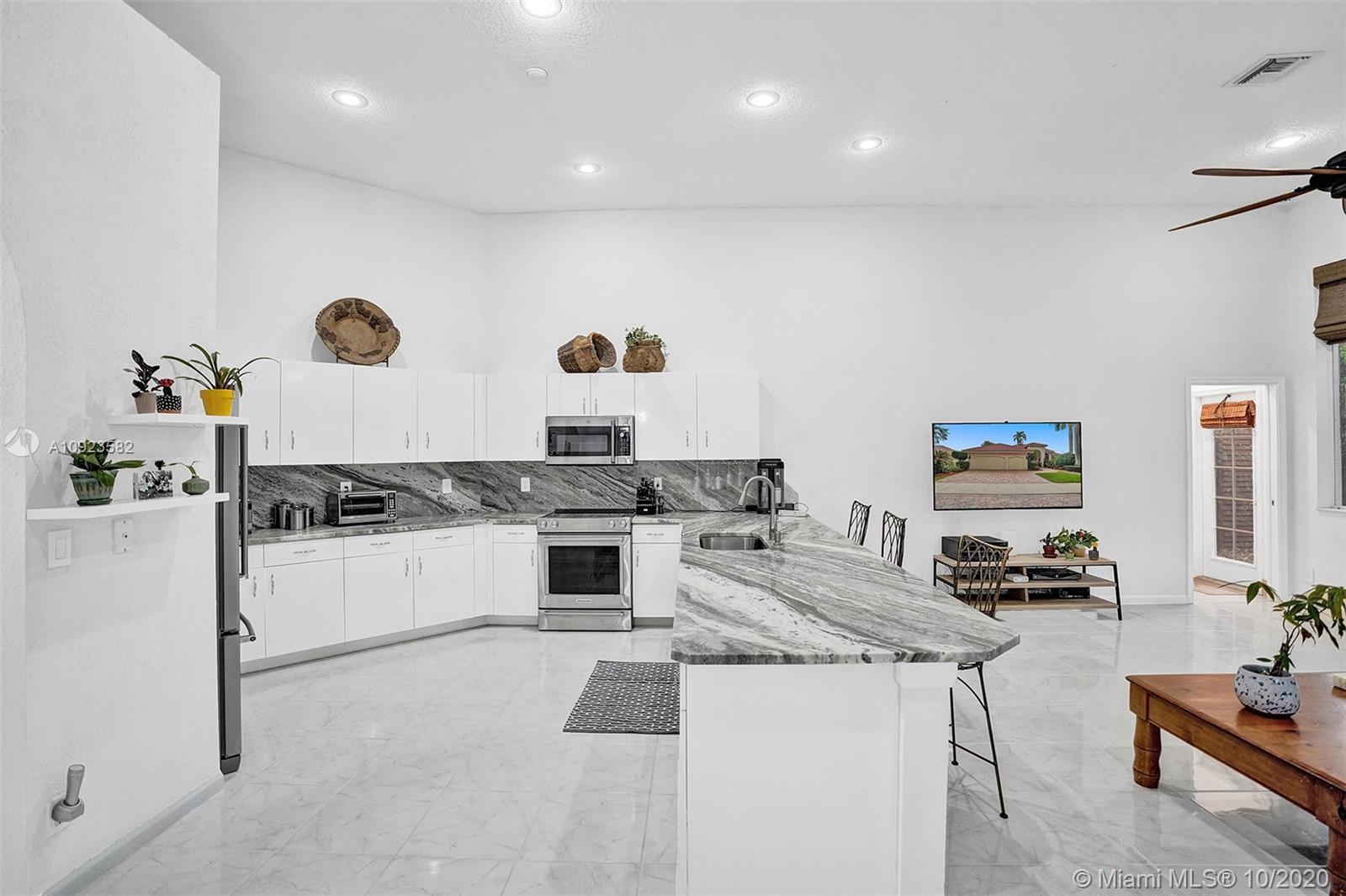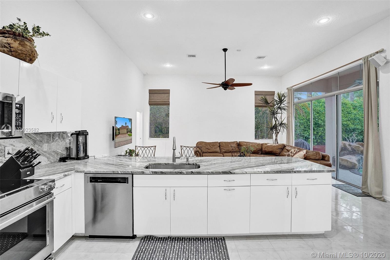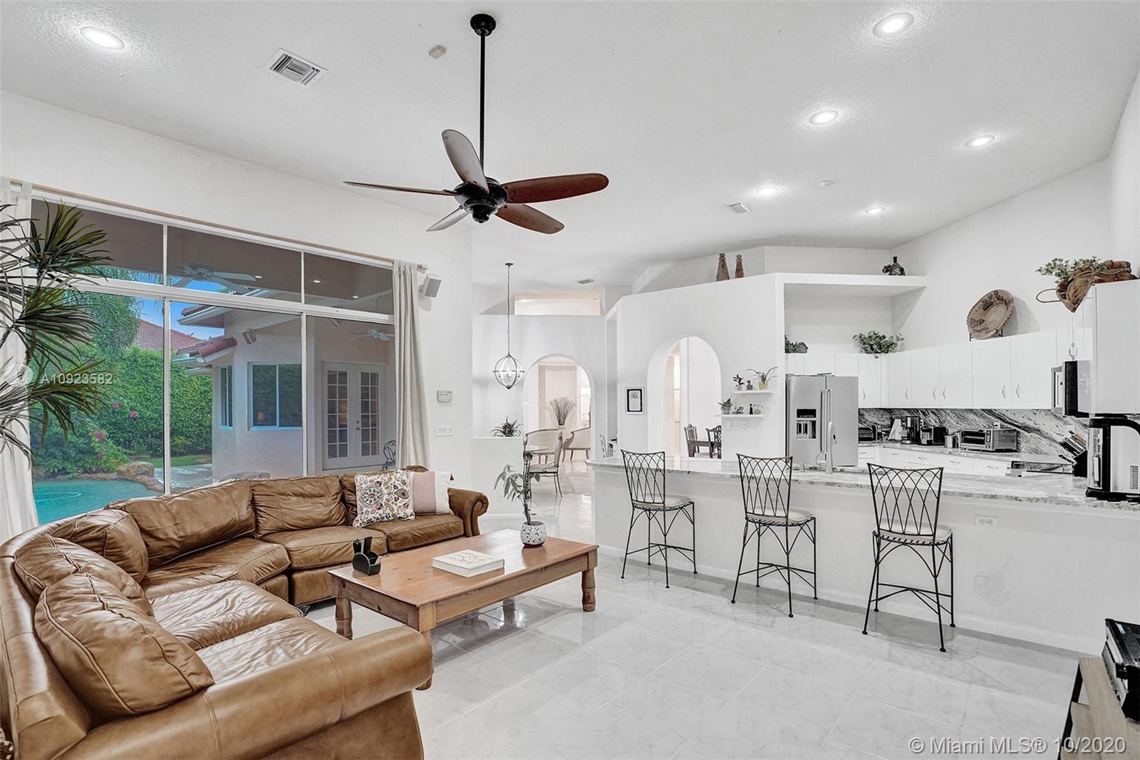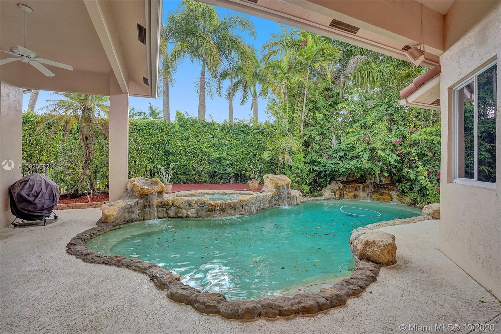 Four spacious bedrooms plus den/office. Tucked in the boutique community of Maple Island in The Islands at Weston. This custom one-story home features soaring ceilings with windows on the pool. Fully fenced yard with lush tropical landscaping and deck. Freeform pool with waterfall function and spa. White kitchen with renovated granite countertops and stainless steel appliances. Triple split plan with grand owners suite plus sitting area with door to the pool. Newly renovated owners bath with roman tub, new floorings, granite countertops, white cabinetry, and shower. NEWER ROOF