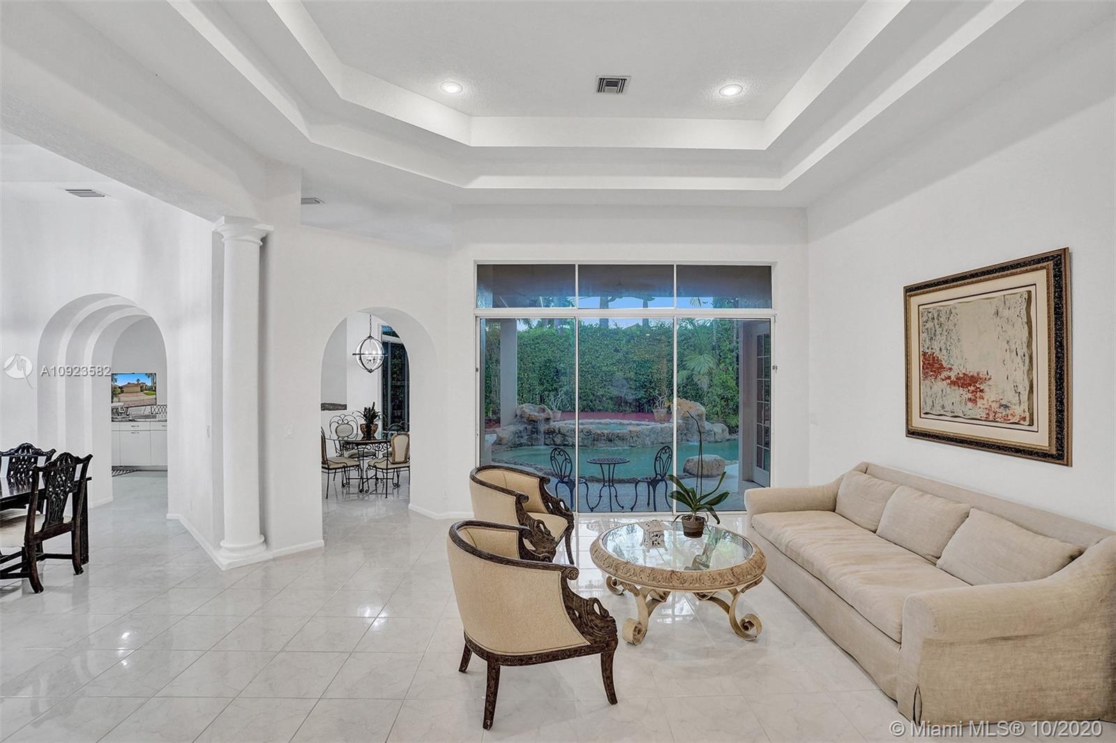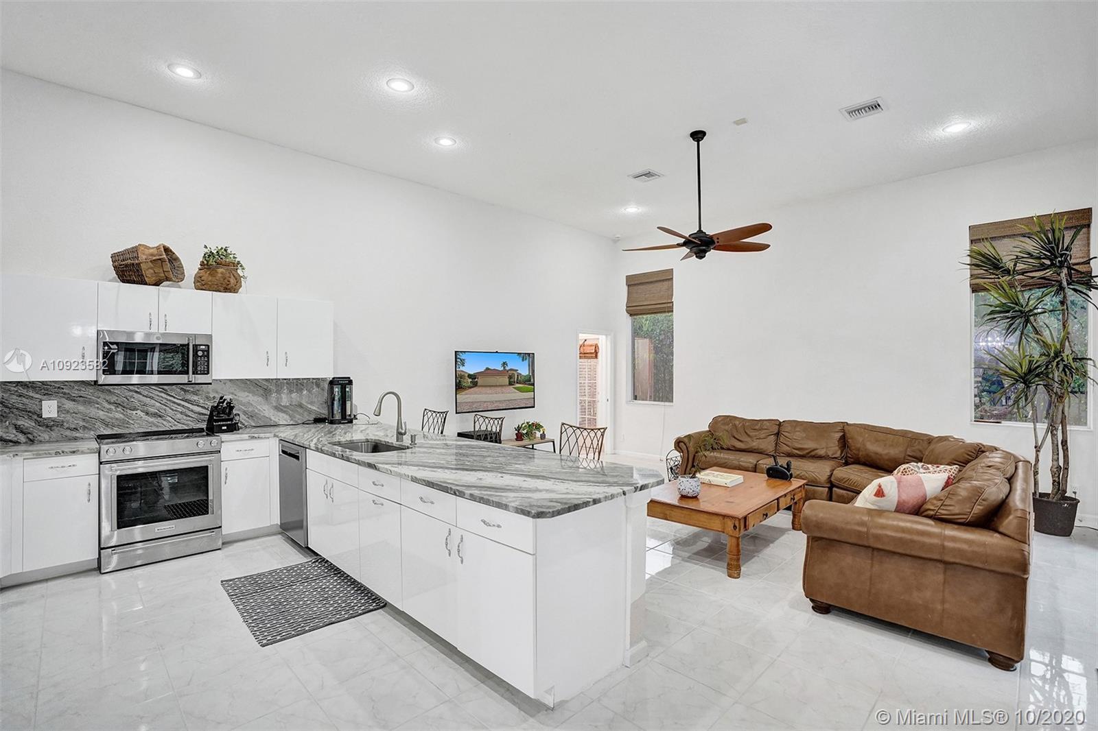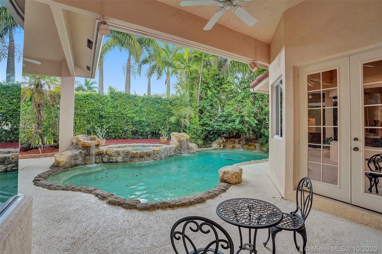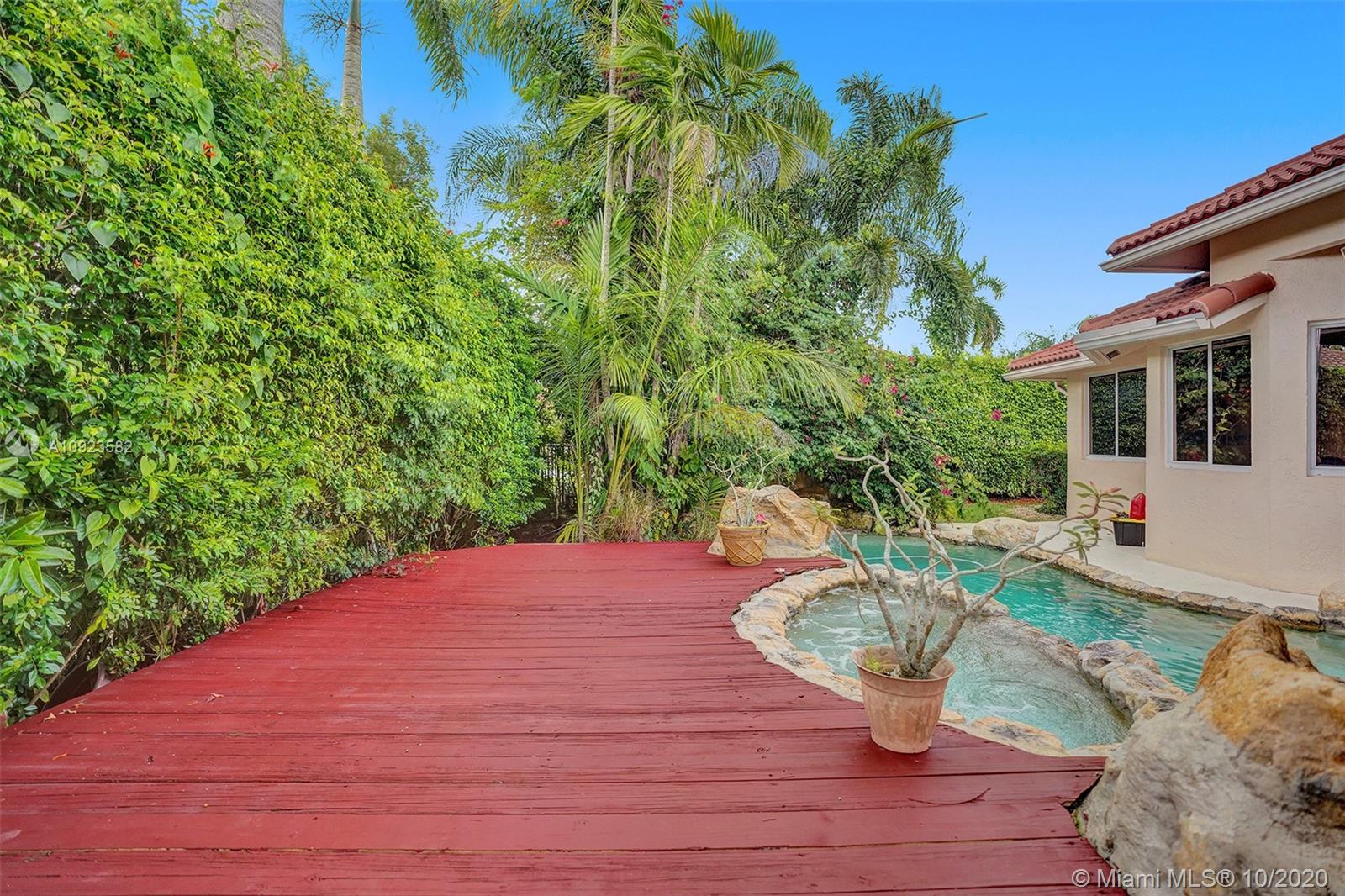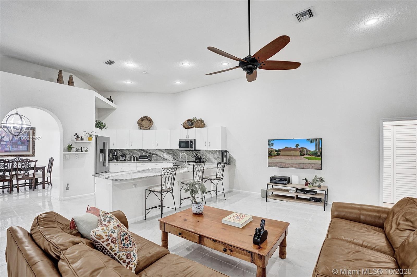 Four spacious bedrooms plus den/office. Tucked in the boutique community of Maple Island in The Islands at Weston. This custom one-story home features soaring ceilings with windows on the pool. Fully fenced yard with lush tropical landscaping and deck. Freeform pool with waterfall function and spa. White kitchen with renovated granite countertops and stainless steel appliances. Triple split plan with grand owners suite plus sitting area with door to the pool. Newly renovated owners bath with roman tub, new floorings, granite countertops, white cabinetry, and shower. NEWER ROOF