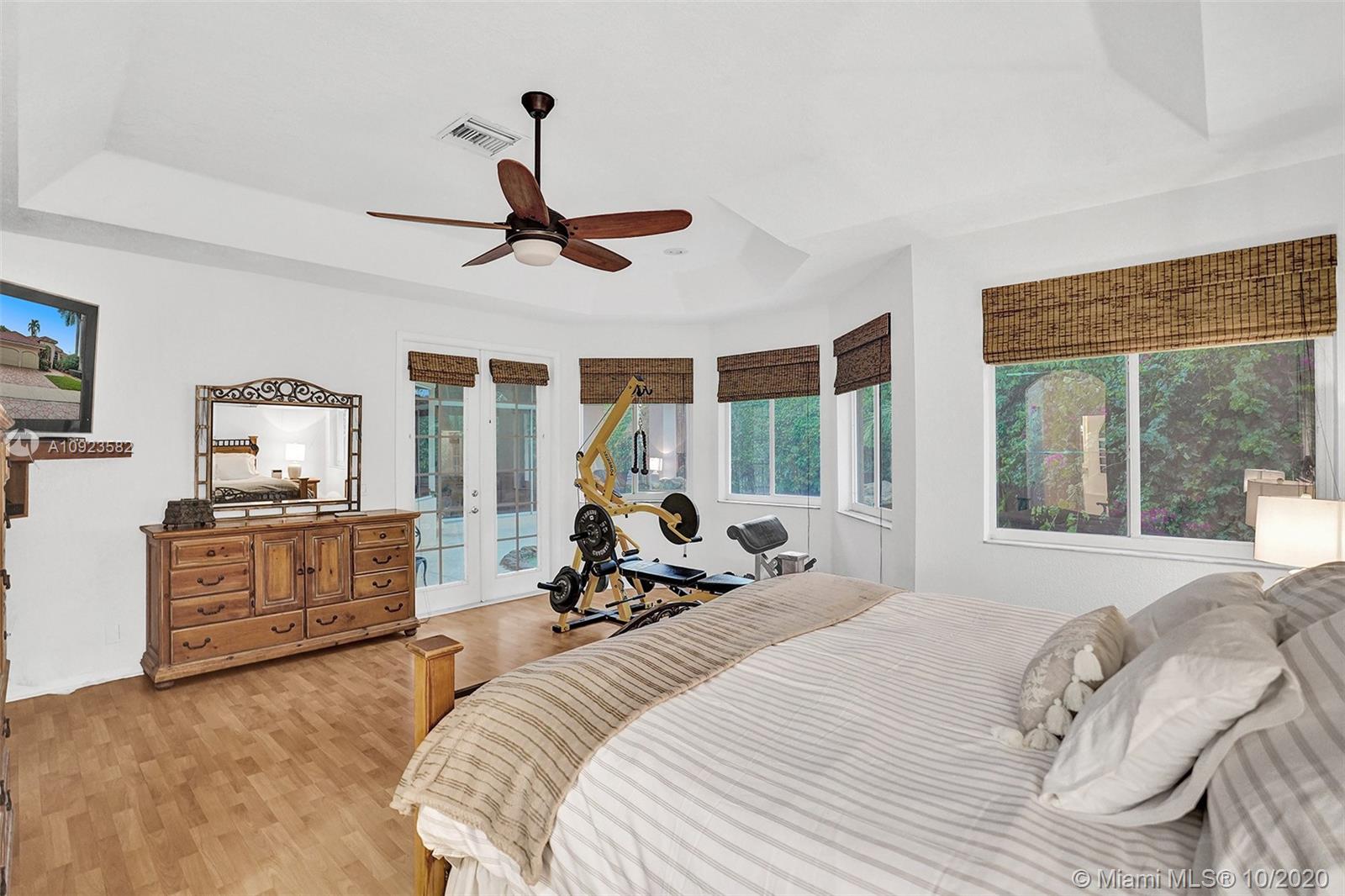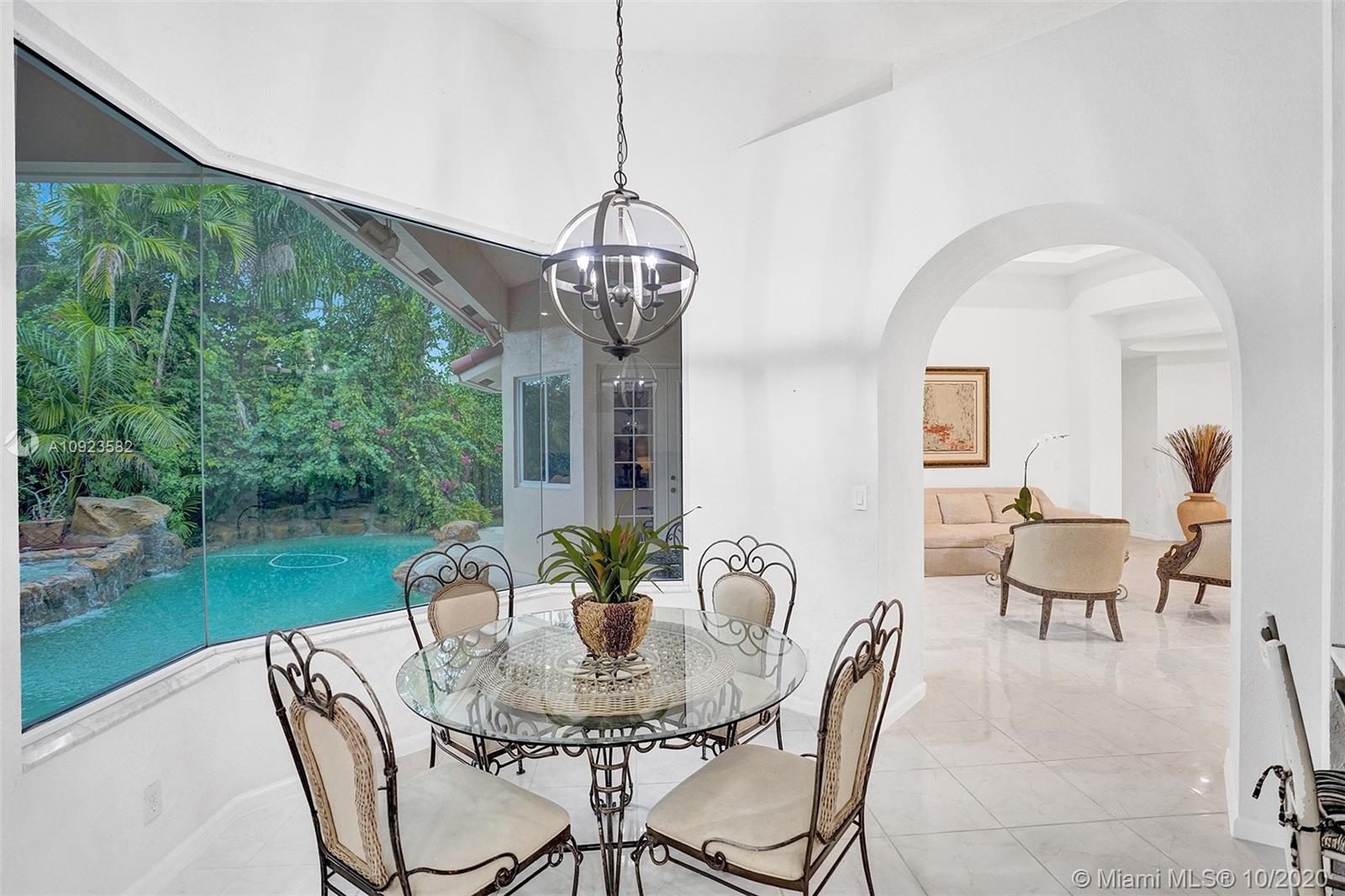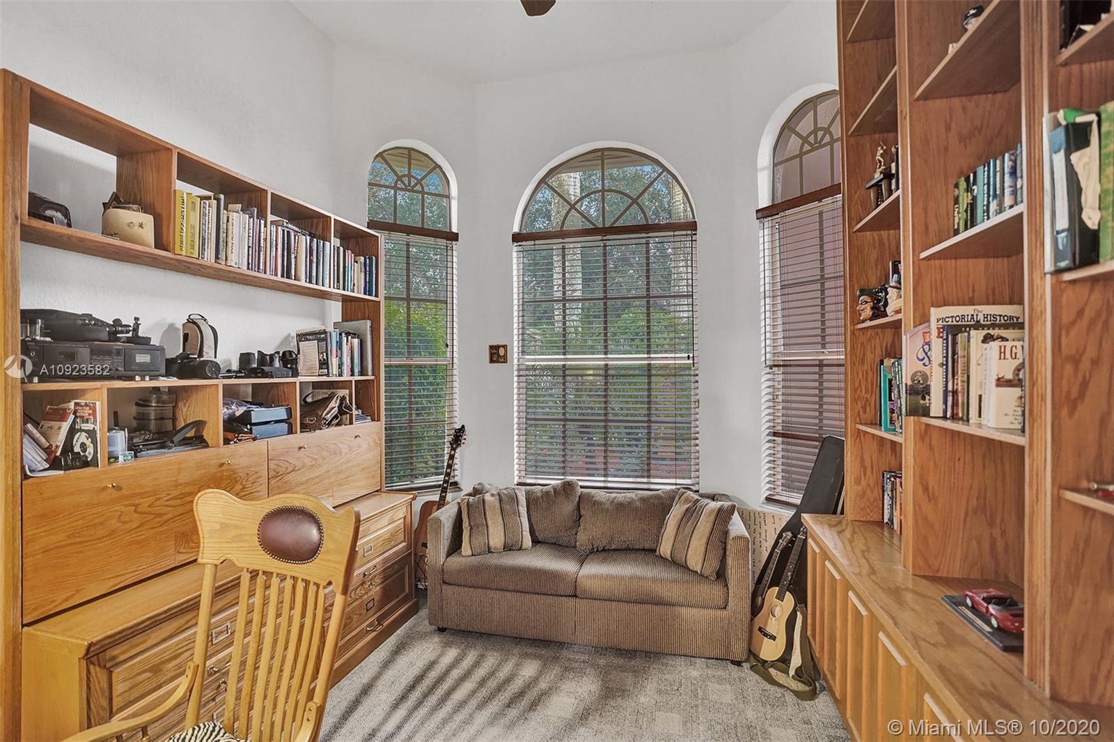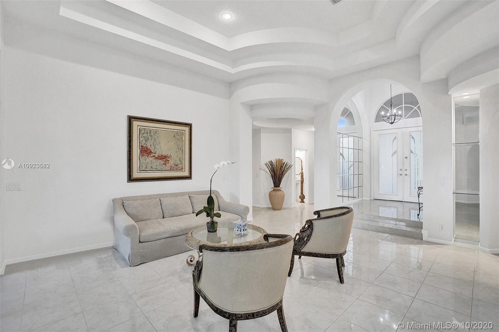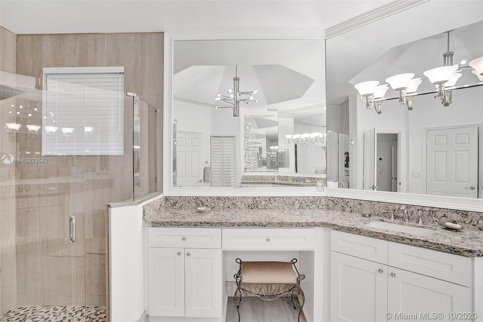 Four spacious bedrooms plus den/office. Tucked in the boutique community of Maple Island in The Islands at Weston. This custom one-story home features soaring ceilings with windows on the pool. Fully fenced yard with lush tropical landscaping and deck. Freeform pool with waterfall function and spa. White kitchen with renovated granite countertops and stainless steel appliances. Triple split plan with grand owners suite plus sitting area with door to the pool. Newly renovated owners bath with roman tub, new floorings, granite countertops, white cabinetry, and shower. NEWER ROOF