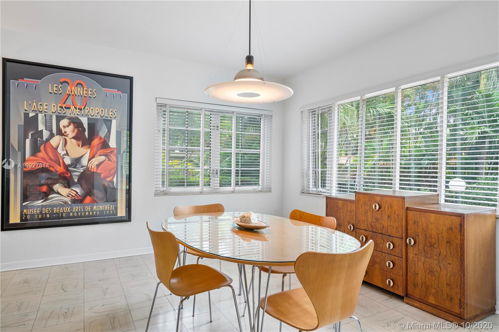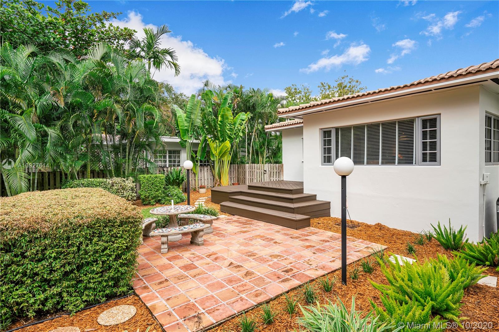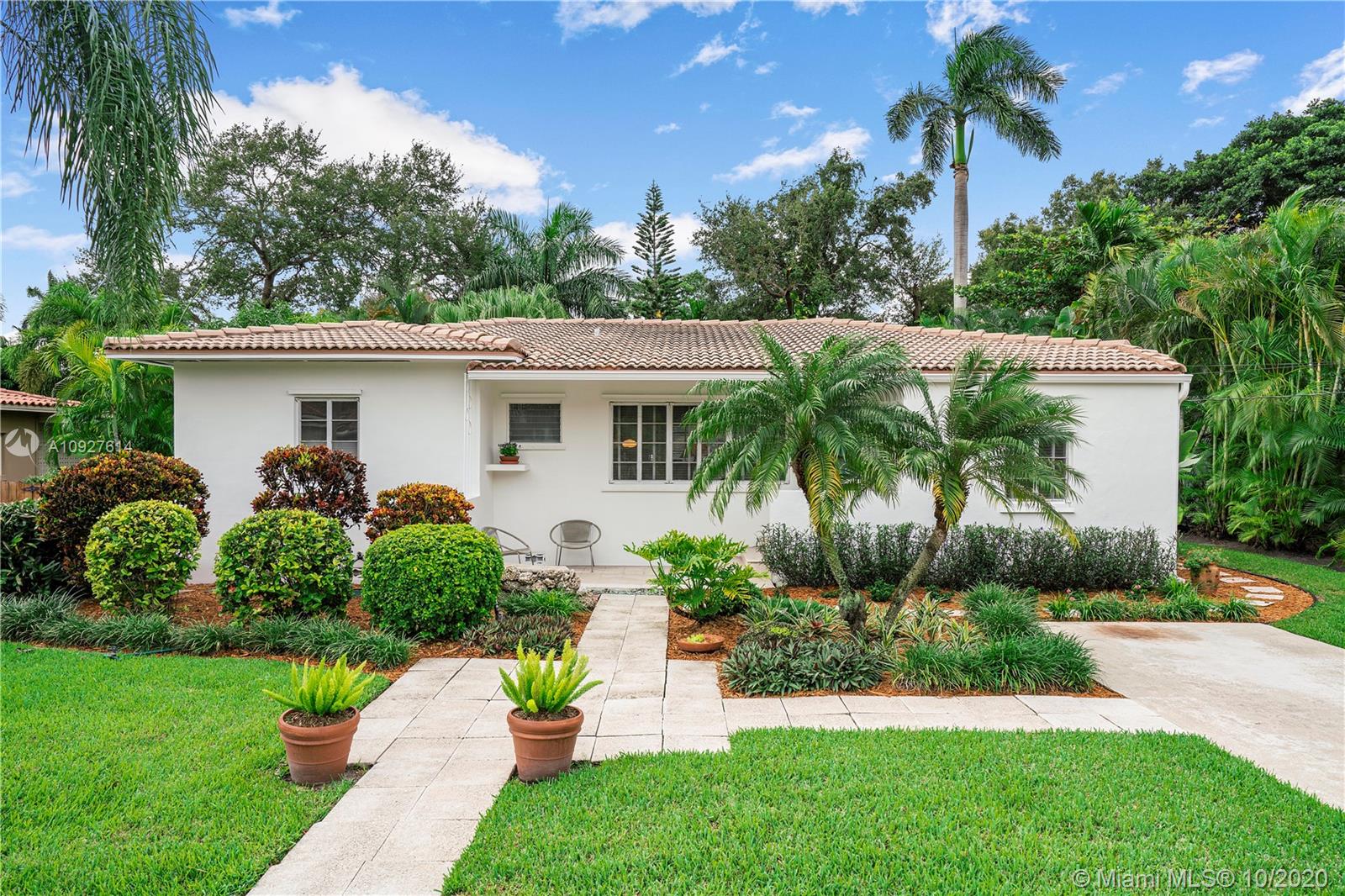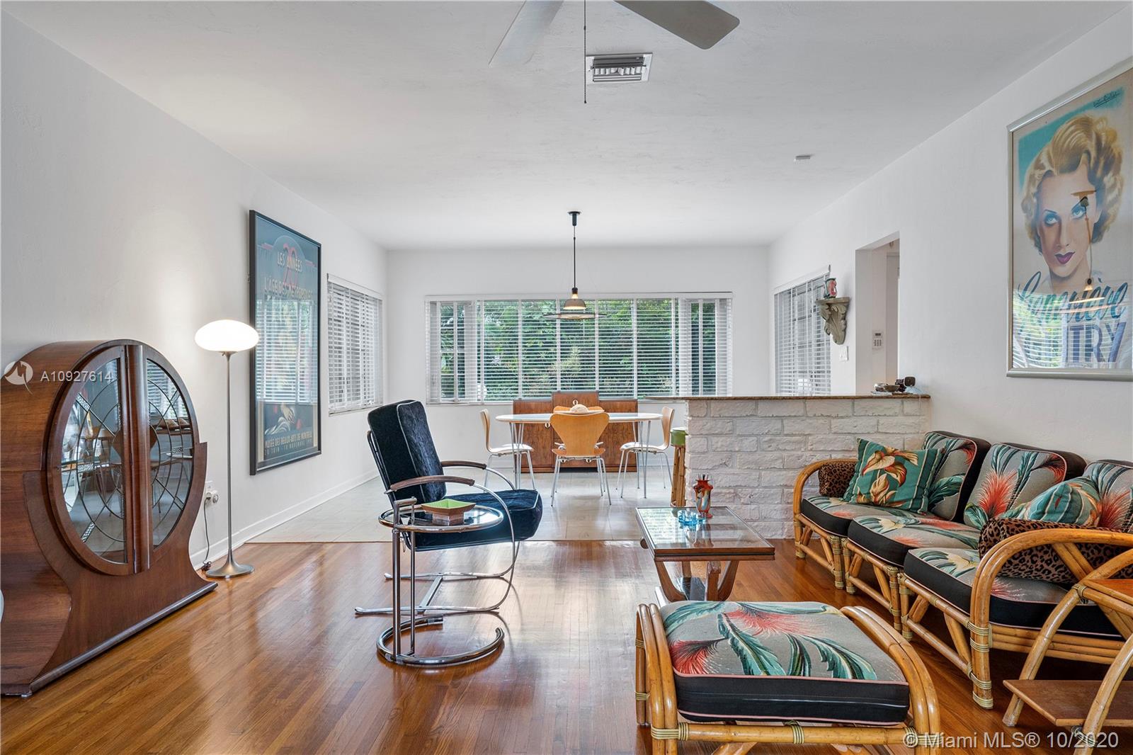 Situated in one of Miami-Dade County's most desirable neighborhoods, this oversized 10,500 SQ FT lot is nestled on a quiet street in Miami Shores Village. An open floor plan with 3 BDRMS, 2 BA, and a large Great Room consisting of Living, Dining, and Sun Room areas. Abundant natural daylight, cross ventilation, and large room volumes. Wonderful example of Mid-century Modern architecture built in 1952 and designed by famed Art Deco and MiMo architect, Gerard Pitt. Meticulously maintained by designer/owner/ author. Many original finishes abound: Oak slat floors, Cuban Tile floors, plaster walls and ceilings, ceramic mosaic tiles. Unique opportunity to own a MiMo classic with potential to renovate or expand.