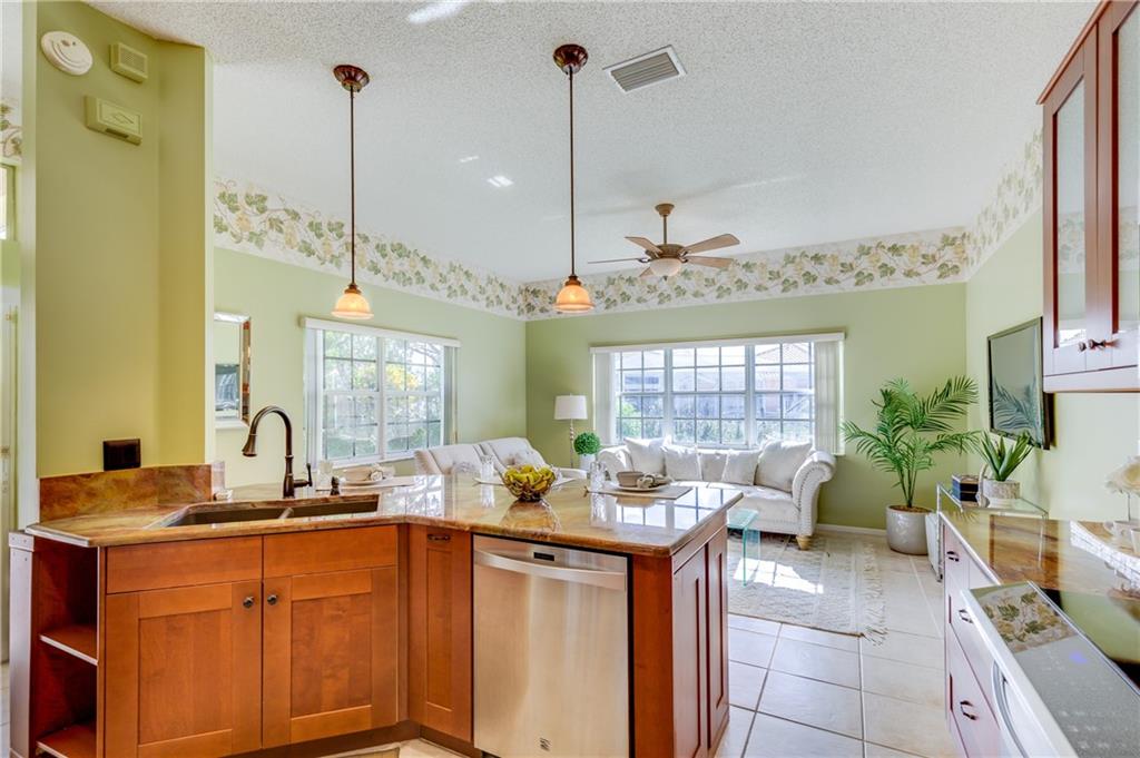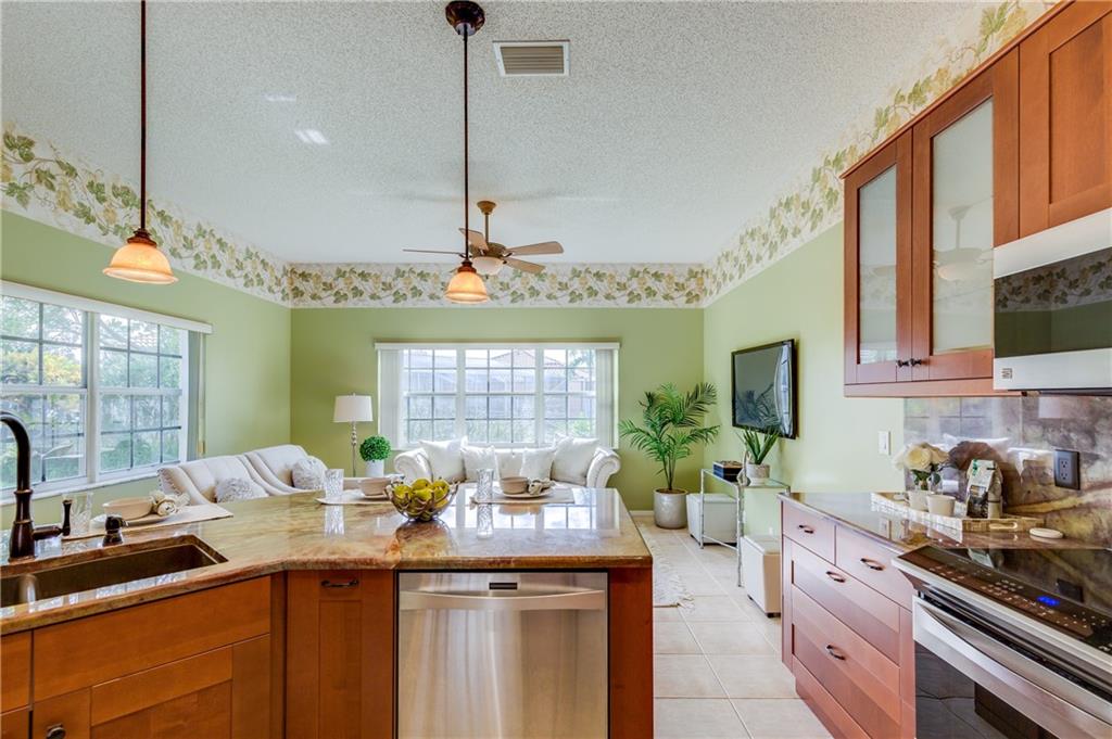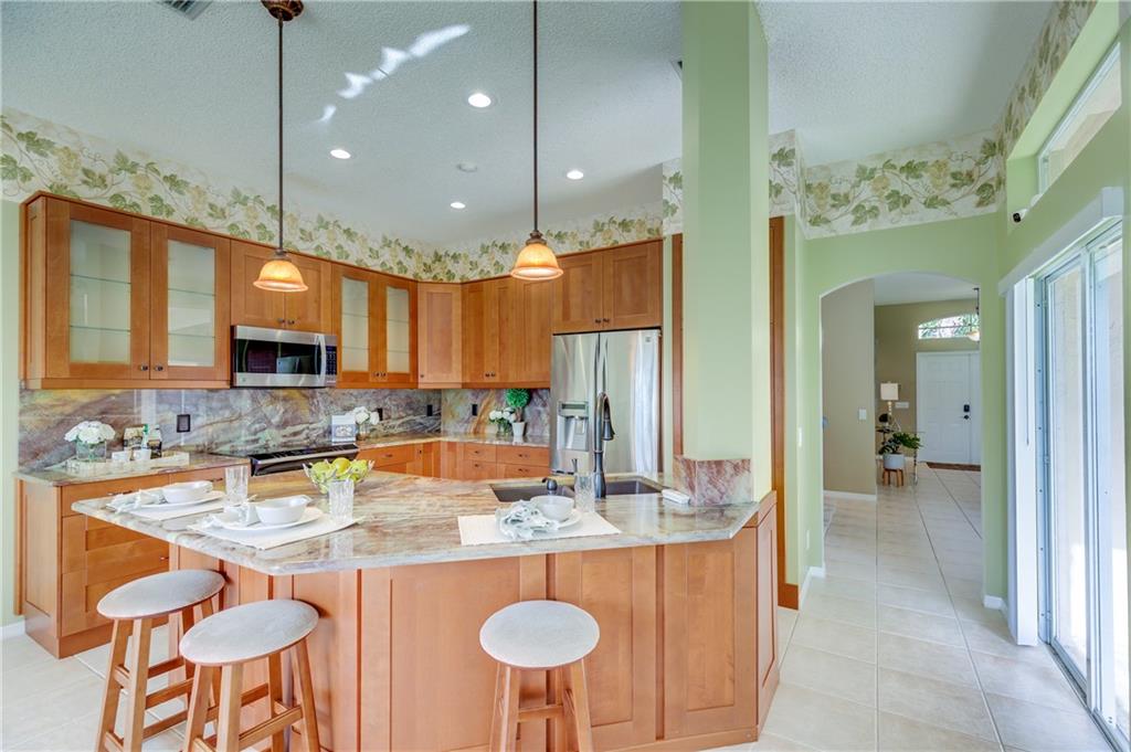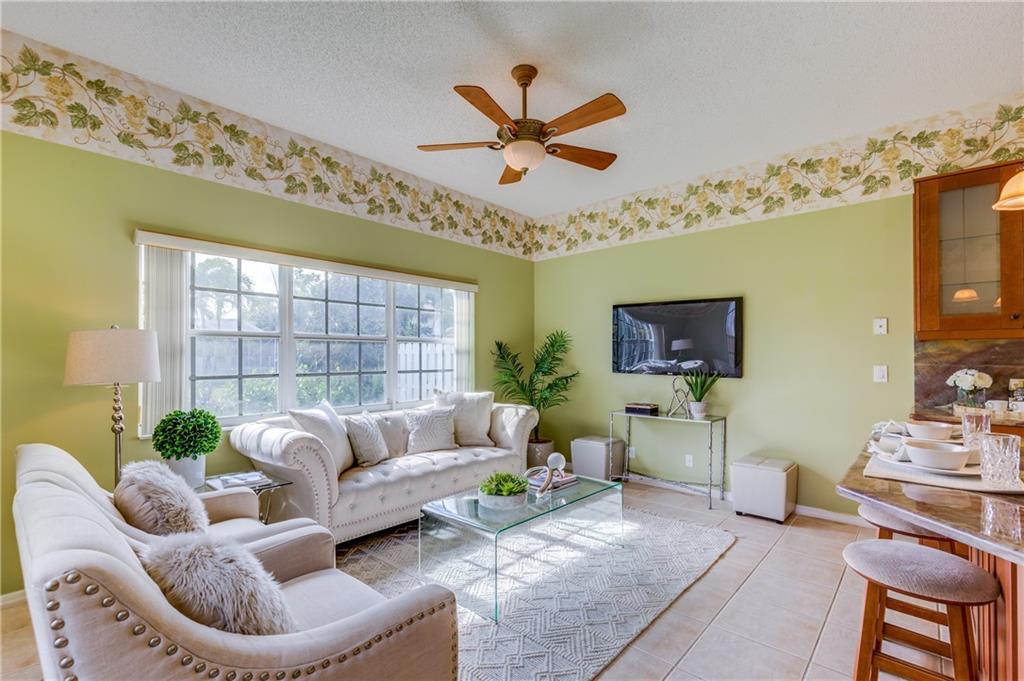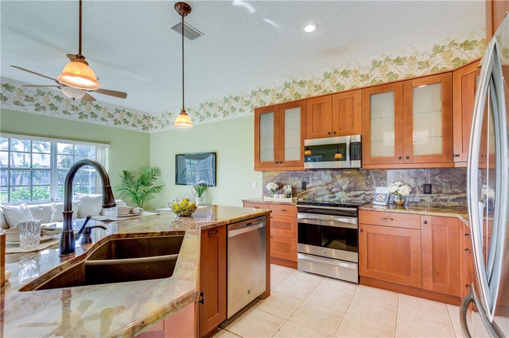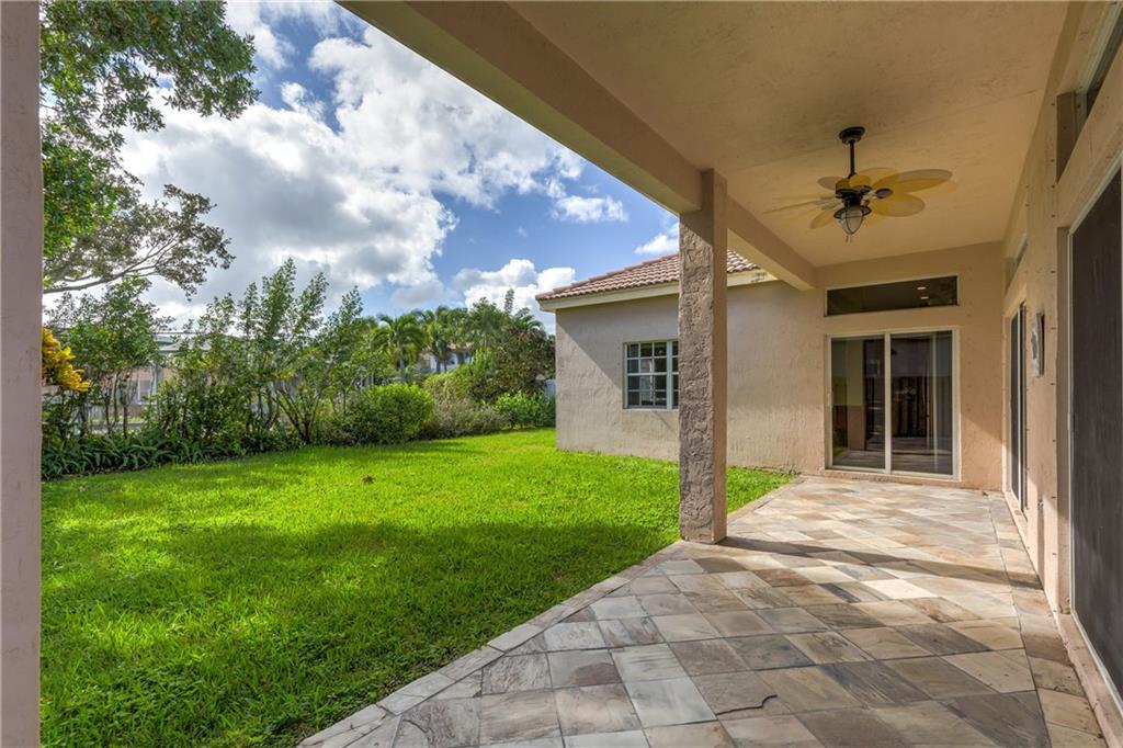 Beautiful home in desirable 24/7 guard gated Weston community of The Meadows. A paver driveway and front walkway greets you as you enter. 4 bedrooms, 2 1/2 bath one story home. Spacious family room and breakfast bar, in addition to formal dining room and living room. Split floor plan with 10 foot ceilings in living room. Neutral ceramic tile in social areas and baths, laminate in bedrooms. Walk-in closet in master. Very nice covered slate rear patio. Backyard has room for a pool! Large 20' x 20' two-car garage plus room for two cars on paver driveway. Guest bath was recently renovated. Beautiful updated kitchen with 42 inch wood cabinets, stunning quartzite counters and backsplash, under-cabinet lighting and stainless steel Kenmore Elite appliances.