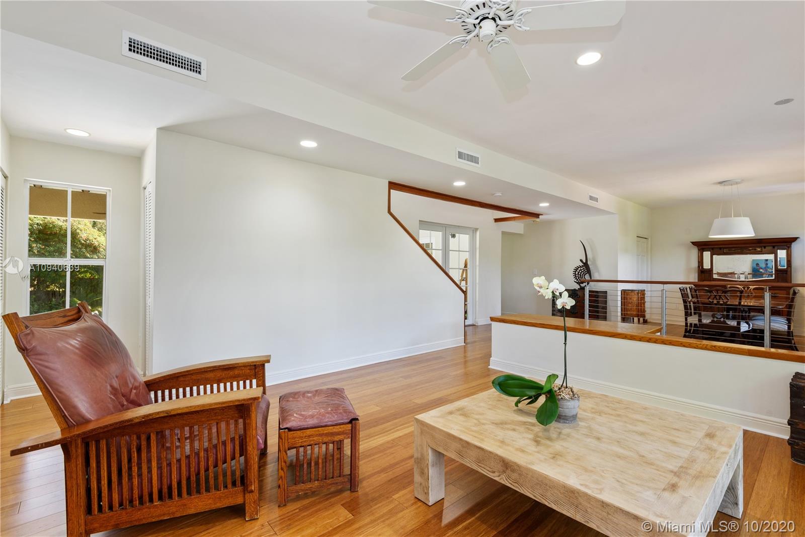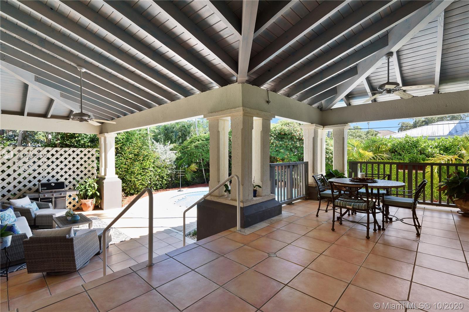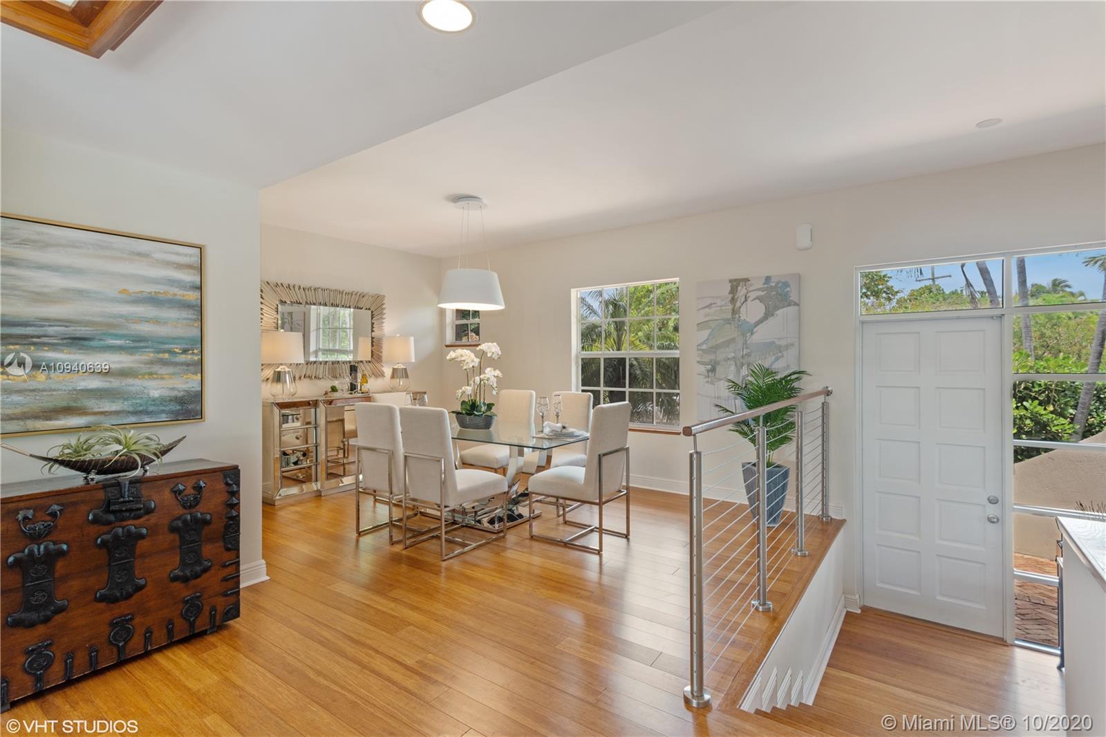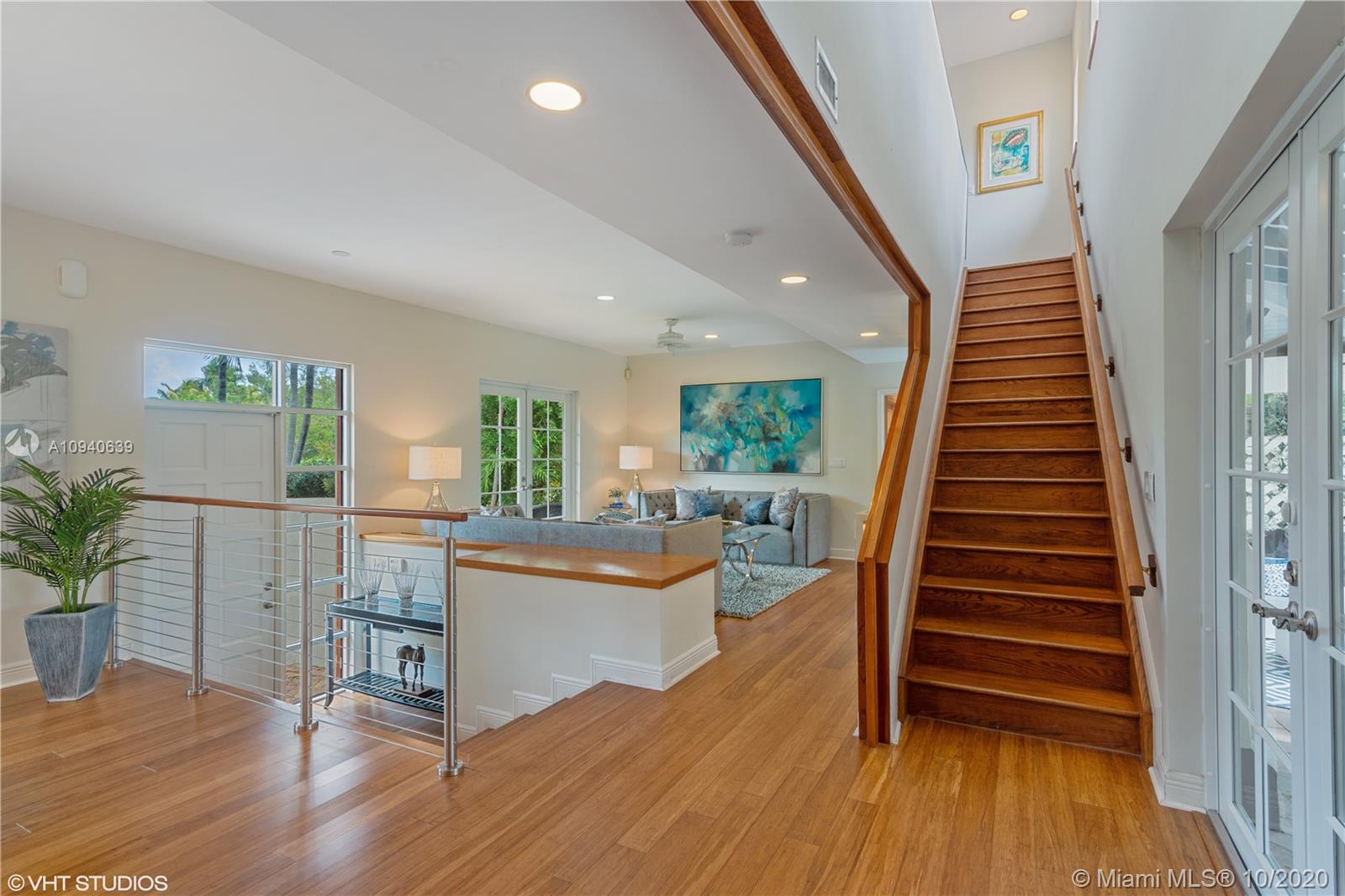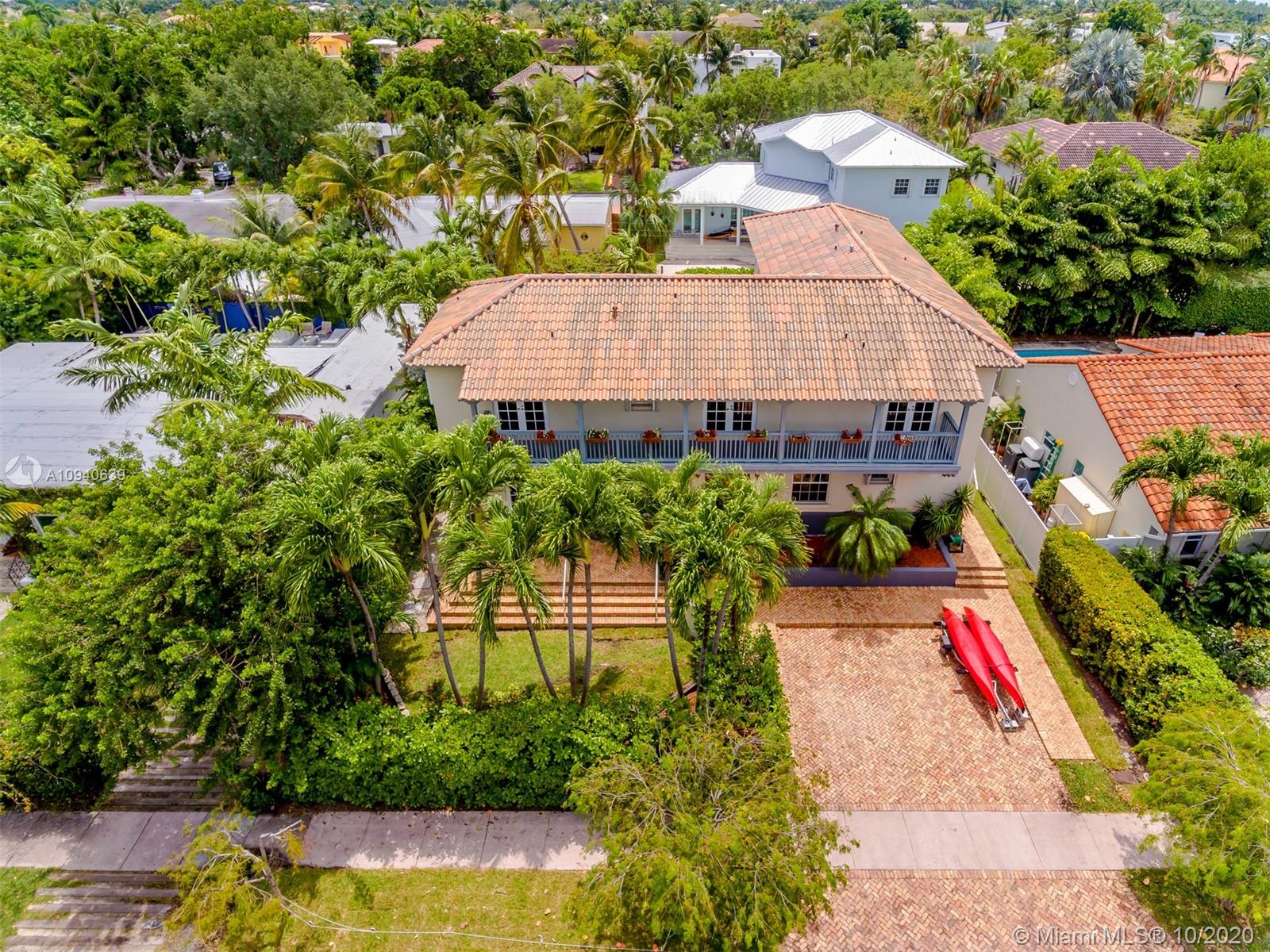 Tropical 2 story Key West style elevated Island home greets you with wood flooring throughout with cozy living and dining room with views to lush secret gardens. Some property features include integration of open kitchen with family room through a convenient pass through window. This residence offers numerous bedrooms with ample closet space plus an additional studio bedroom with bath. Second floor bedrooms open to a beautiful balcony. Luxury and spacious master suite have a wonderfully remodeled bath. All living areas lead to a double level terrace with a peaceful pool cascade, ready to enchant you with its serene landscaping. Property is completely fenced and easily accommodates parking for 3 vehicles. This home is the true epitome of Key Biscayne living. Photos are professionally staged