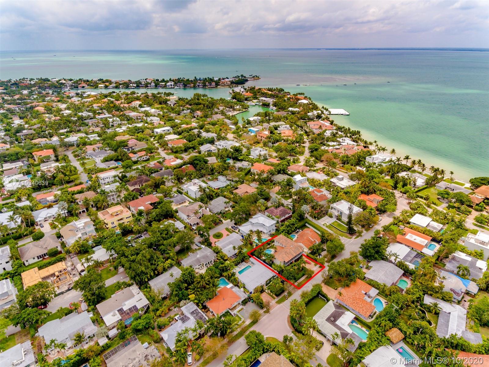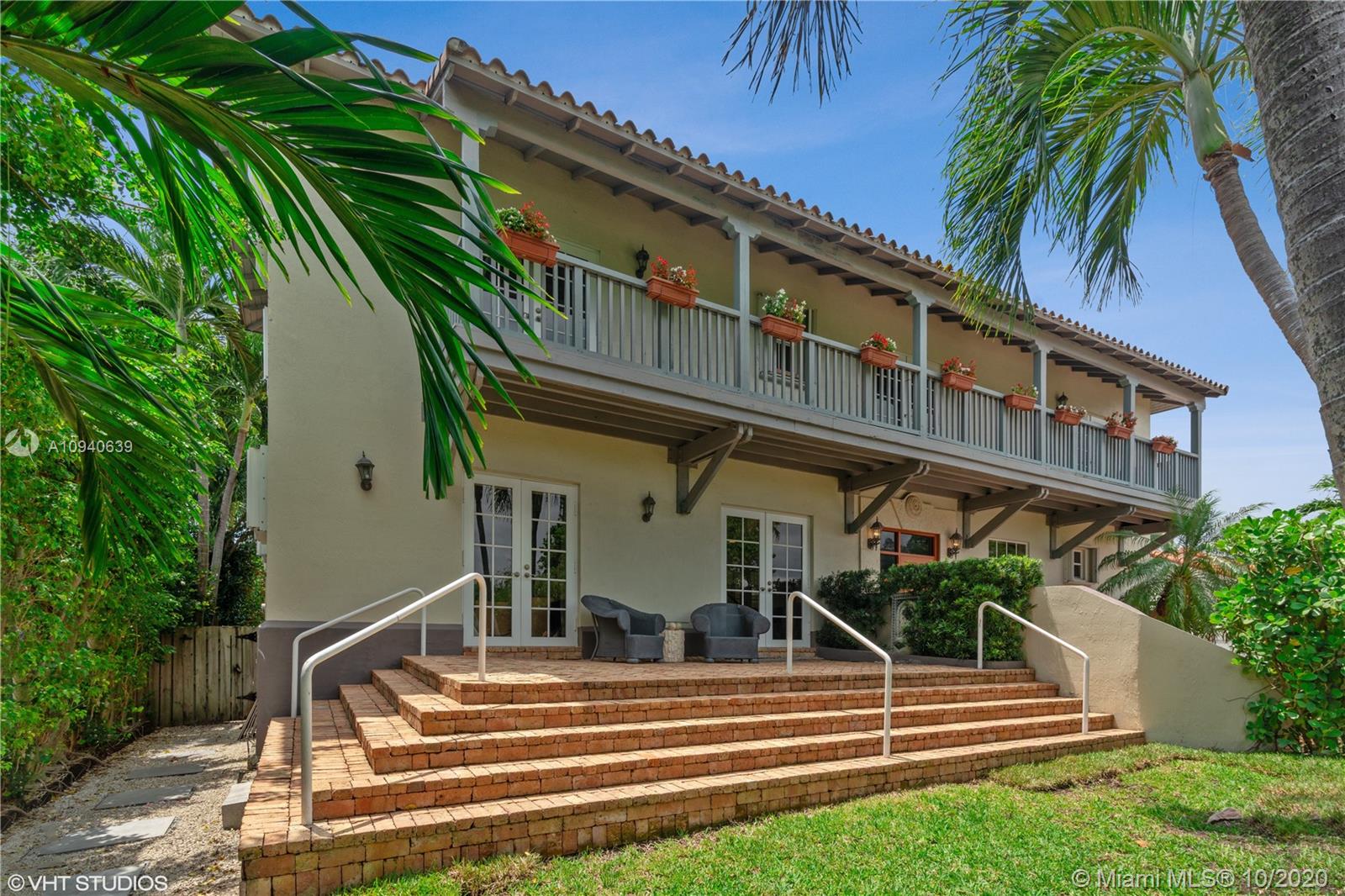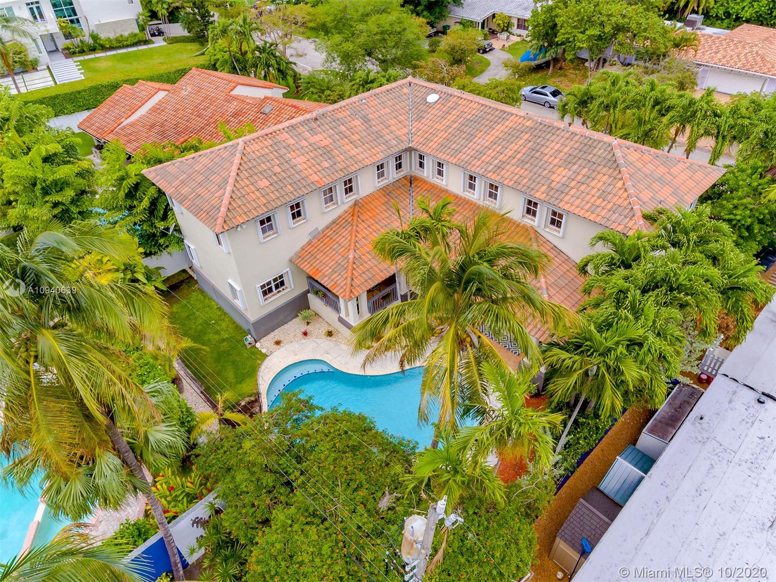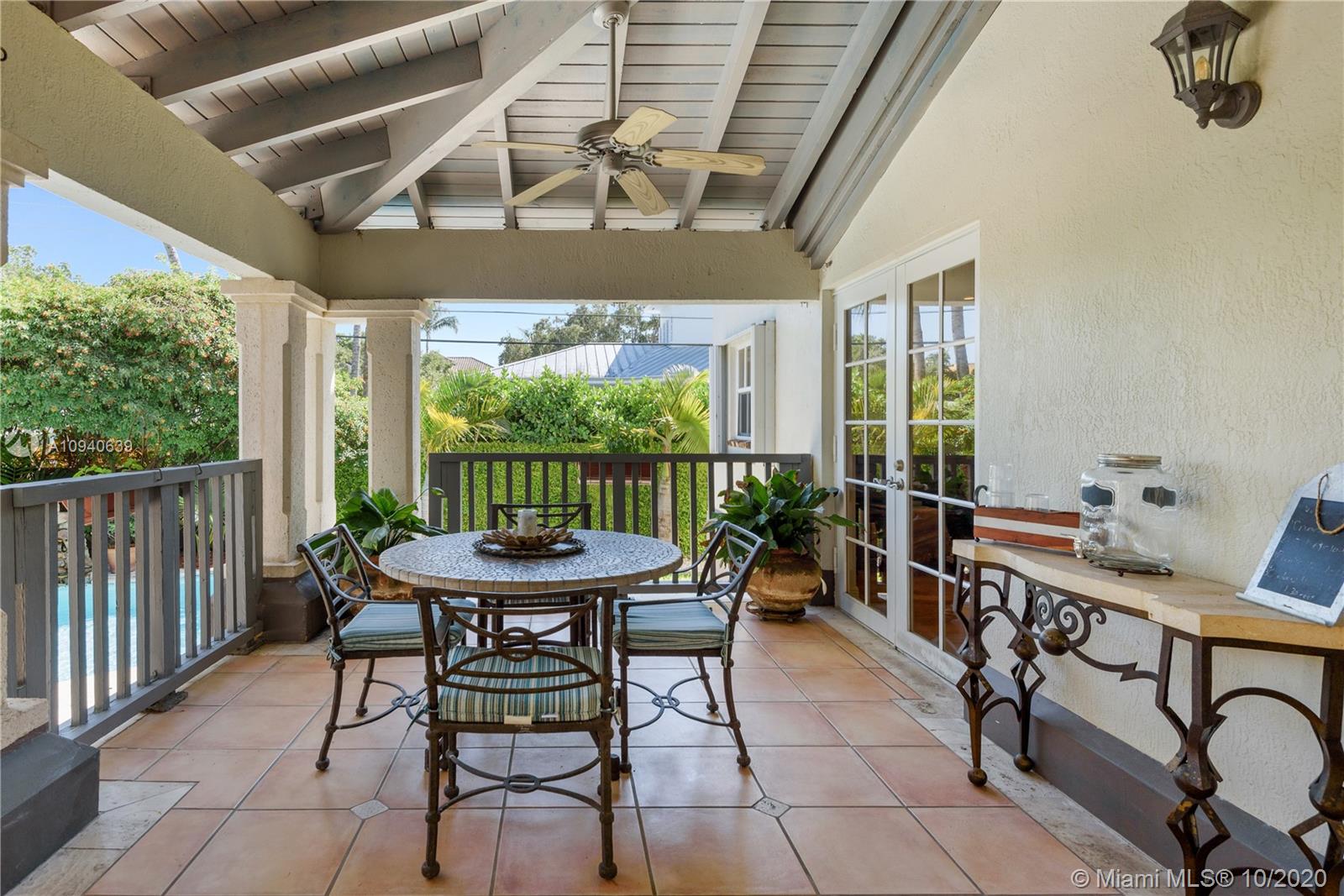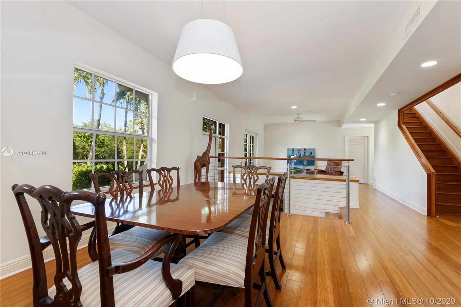 Tropical 2 story Key West style elevated Island home greets you with wood flooring throughout with cozy living and dining room with views to lush secret gardens. Some property features include integration of open kitchen with family room through a convenient pass through window. This residence offers numerous bedrooms with ample closet space plus an additional studio bedroom with bath. Second floor bedrooms open to a beautiful balcony. Luxury and spacious master suite have a wonderfully remodeled bath. All living areas lead to a double level terrace with a peaceful pool cascade, ready to enchant you with its serene landscaping. Property is completely fenced and easily accommodates parking for 3 vehicles. This home is the true epitome of Key Biscayne living. Photos are professionally staged