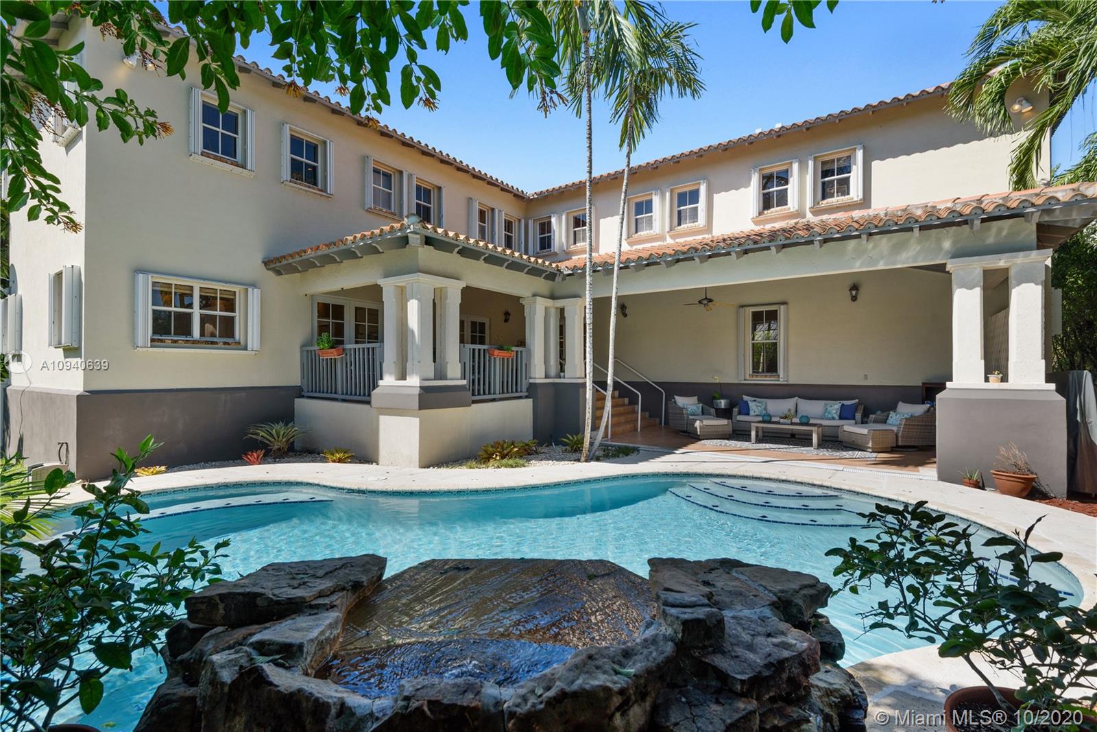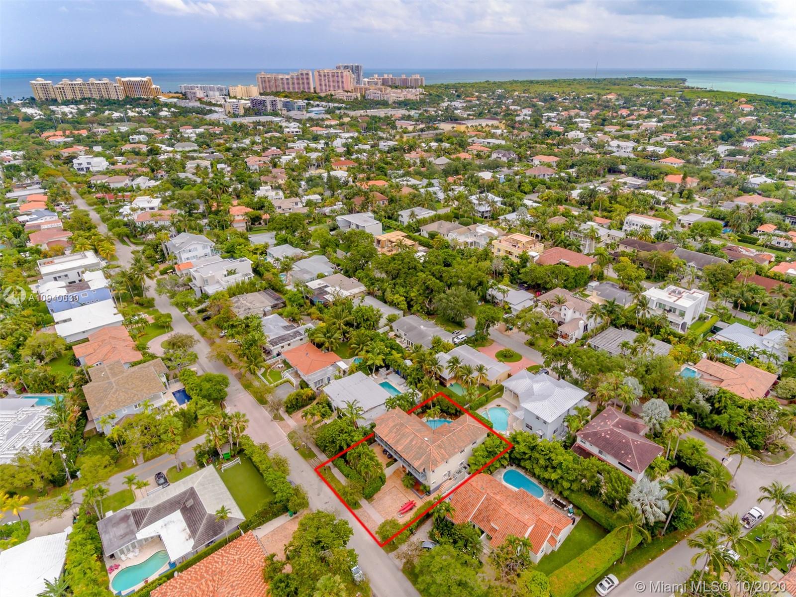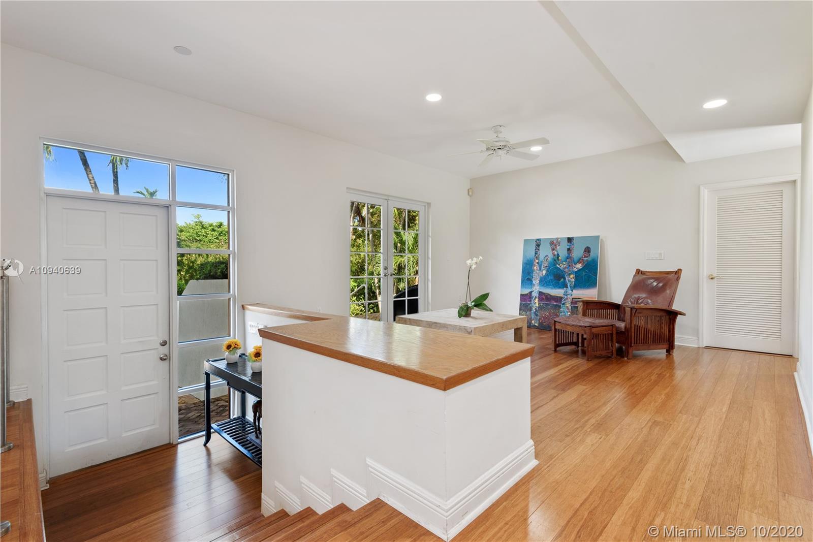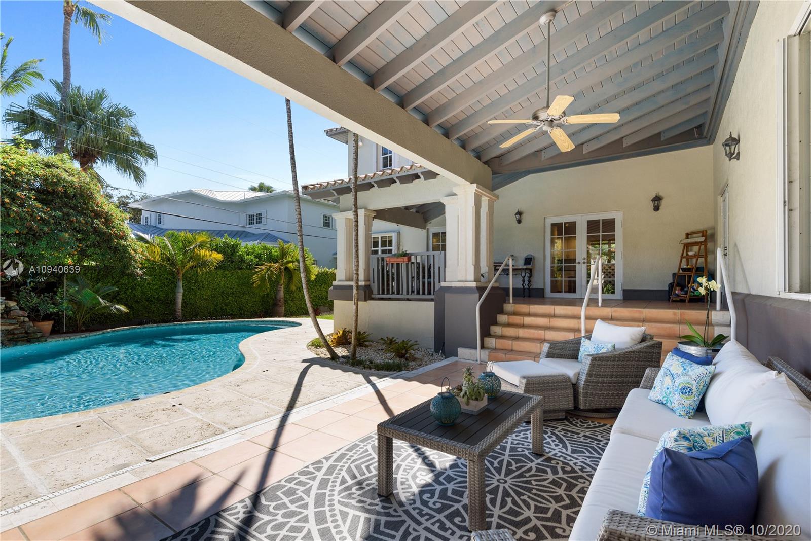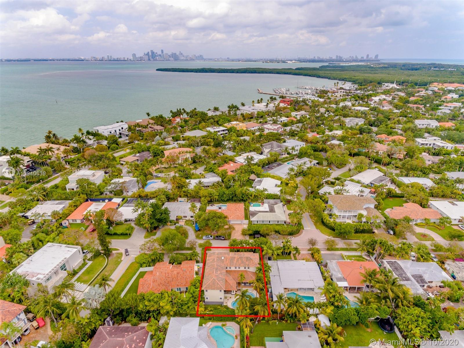 Tropical 2 story Key West style elevated Island home greets you with wood flooring throughout with cozy living and dining room with views to lush secret gardens. Some property features include integration of open kitchen with family room through a convenient pass through window. This residence offers numerous bedrooms with ample closet space plus an additional studio bedroom with bath. Second floor bedrooms open to a beautiful balcony. Luxury and spacious master suite have a wonderfully remodeled bath. All living areas lead to a double level terrace with a peaceful pool cascade, ready to enchant you with its serene landscaping. Property is completely fenced and easily accommodates parking for 3 vehicles. This home is the true epitome of Key Biscayne living. Photos are professionally staged