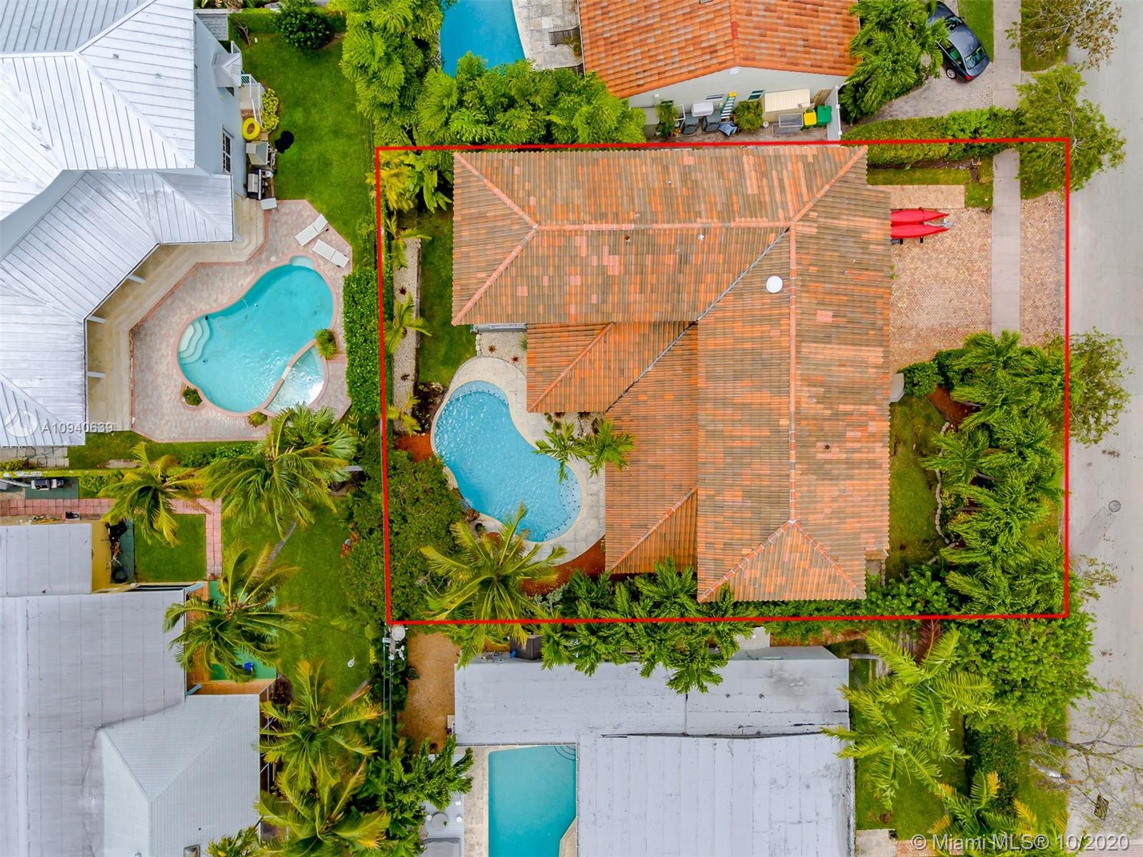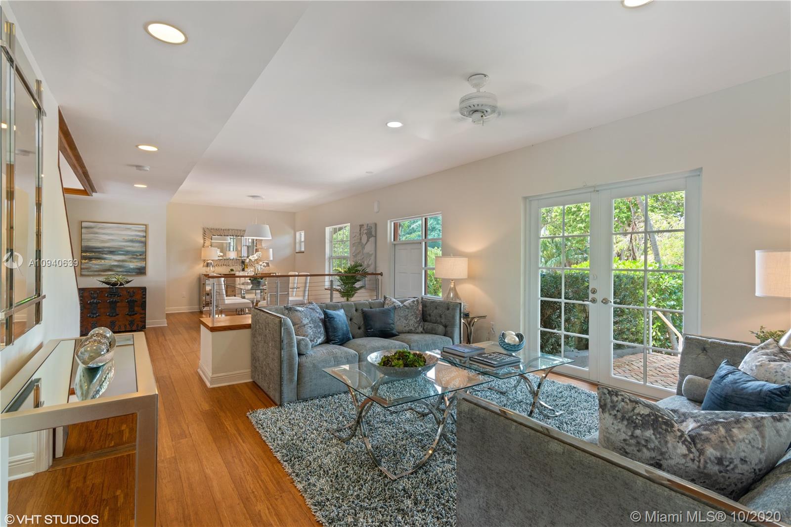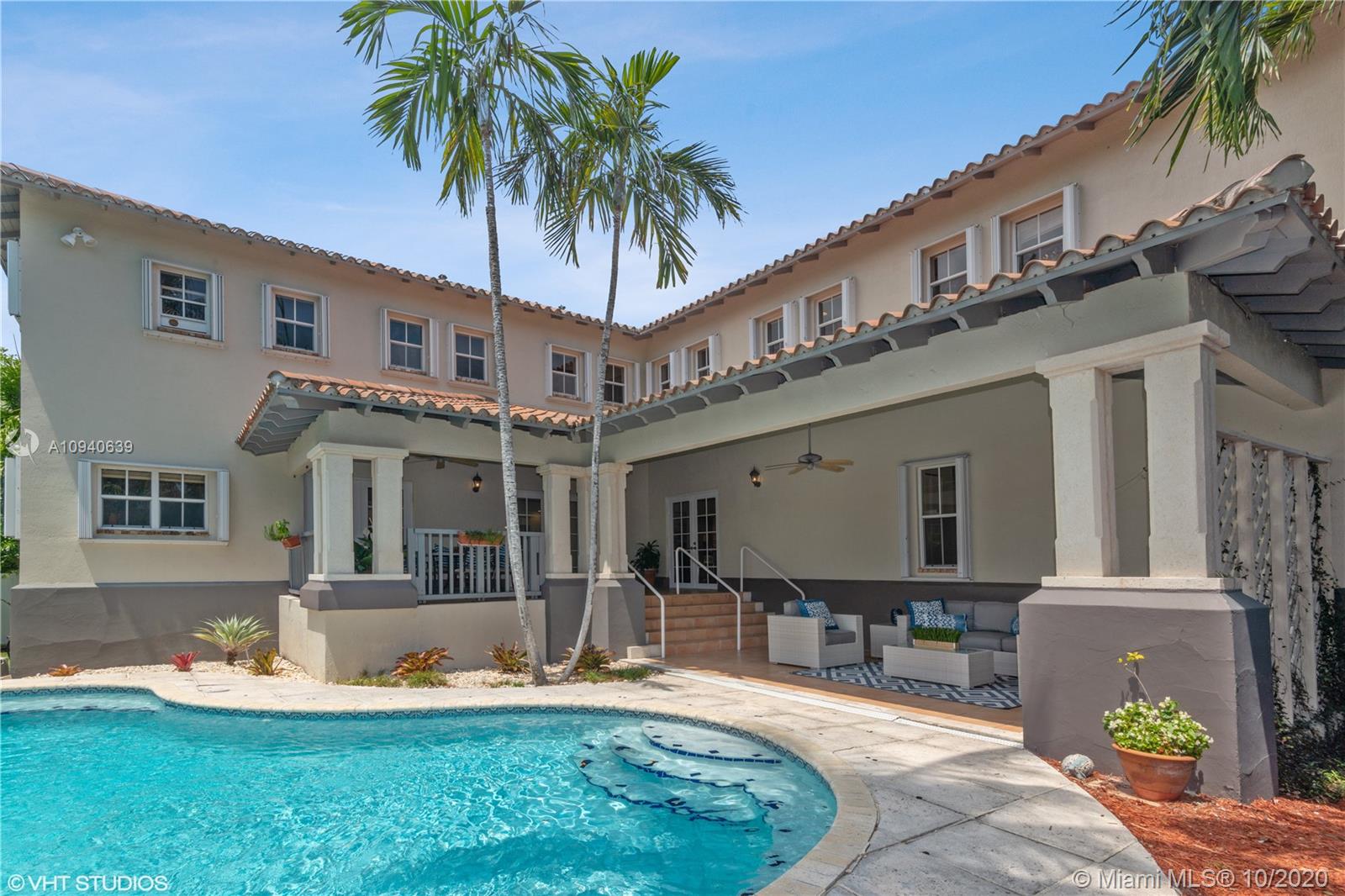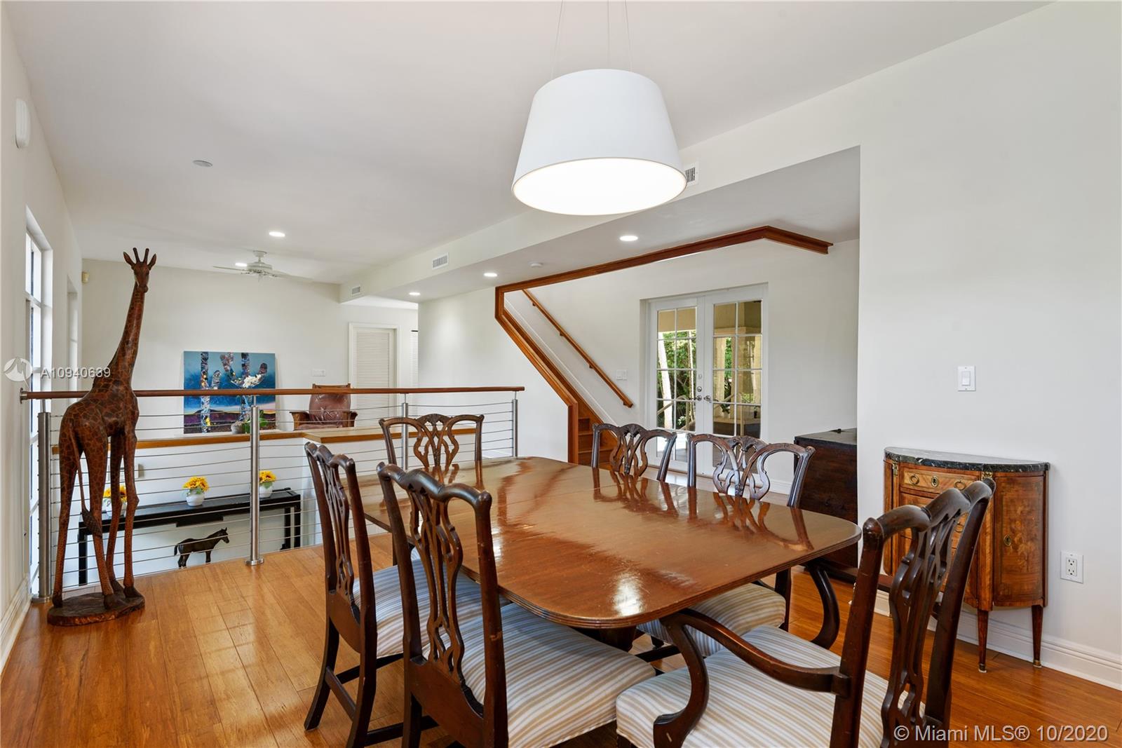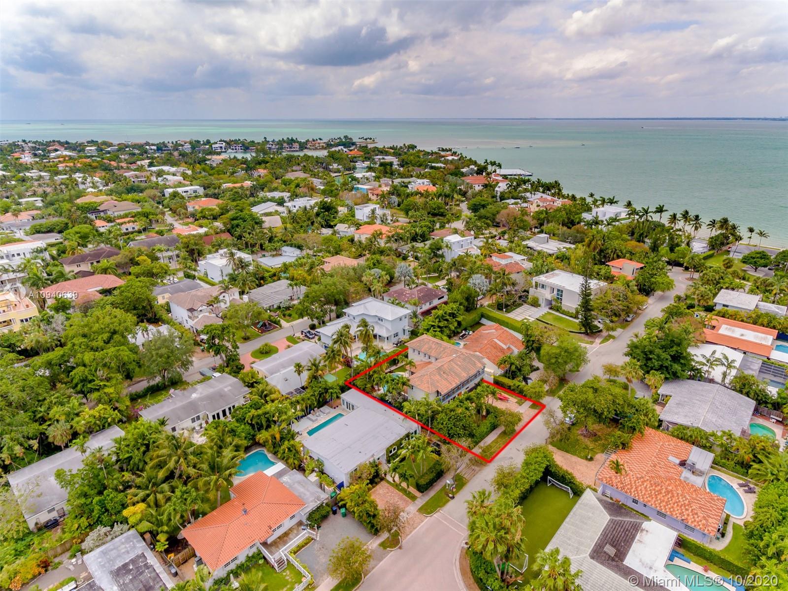 Tropical 2 story Key West style elevated Island home greets you with wood flooring throughout with cozy living and dining room with views to lush secret gardens. Some property features include integration of open kitchen with family room through a convenient pass through window. This residence offers numerous bedrooms with ample closet space plus an additional studio bedroom with bath. Second floor bedrooms open to a beautiful balcony. Luxury and spacious master suite have a wonderfully remodeled bath. All living areas lead to a double level terrace with a peaceful pool cascade, ready to enchant you with its serene landscaping. Property is completely fenced and easily accommodates parking for 3 vehicles. This home is the true epitome of Key Biscayne living. Photos are professionally staged