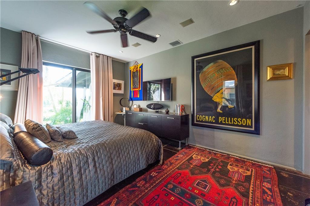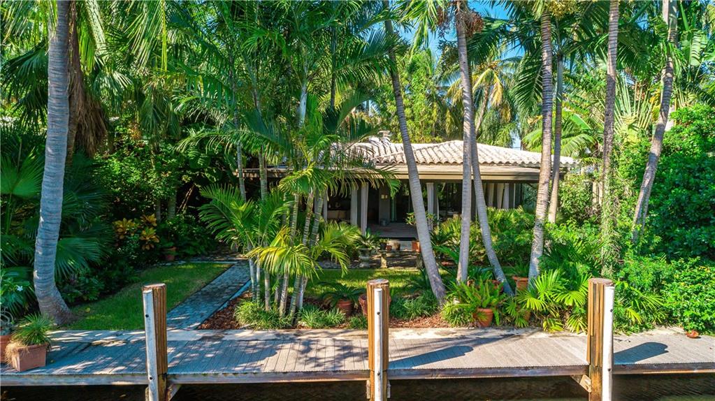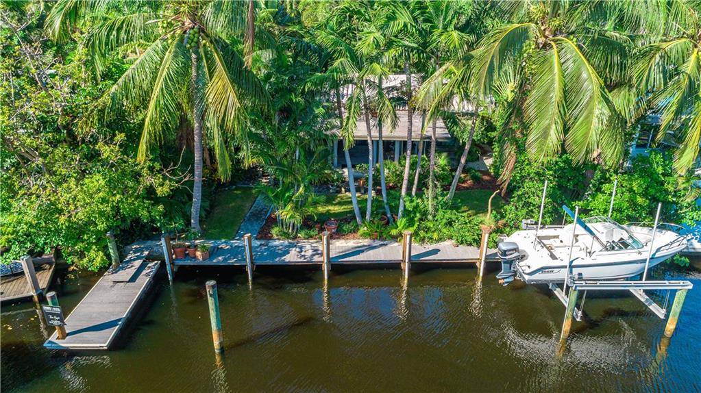 Island location on a 75 foot wide lot with extended views and five foot side setbacks, this home lives like a sophisticated summer lake house - perched above the water beneath mature foliage overlooking a peaceful canal with wide views down Rio Navarro. A central living space open to the outdoors with hurricane impact rated sliding doors onto a covered patio. The white modern kitchen has honed granite and professional series stainless appliances. The living area also has a wood burning fireplace and dark stained Ketchum tile flooring. Two guest bedrooms with hall bath are located off the living area while a third bedroom suite and office niche are located opposite. The 50' x 4' dock has a 10,000 lb boat lift with easy access to the Intracoastal.