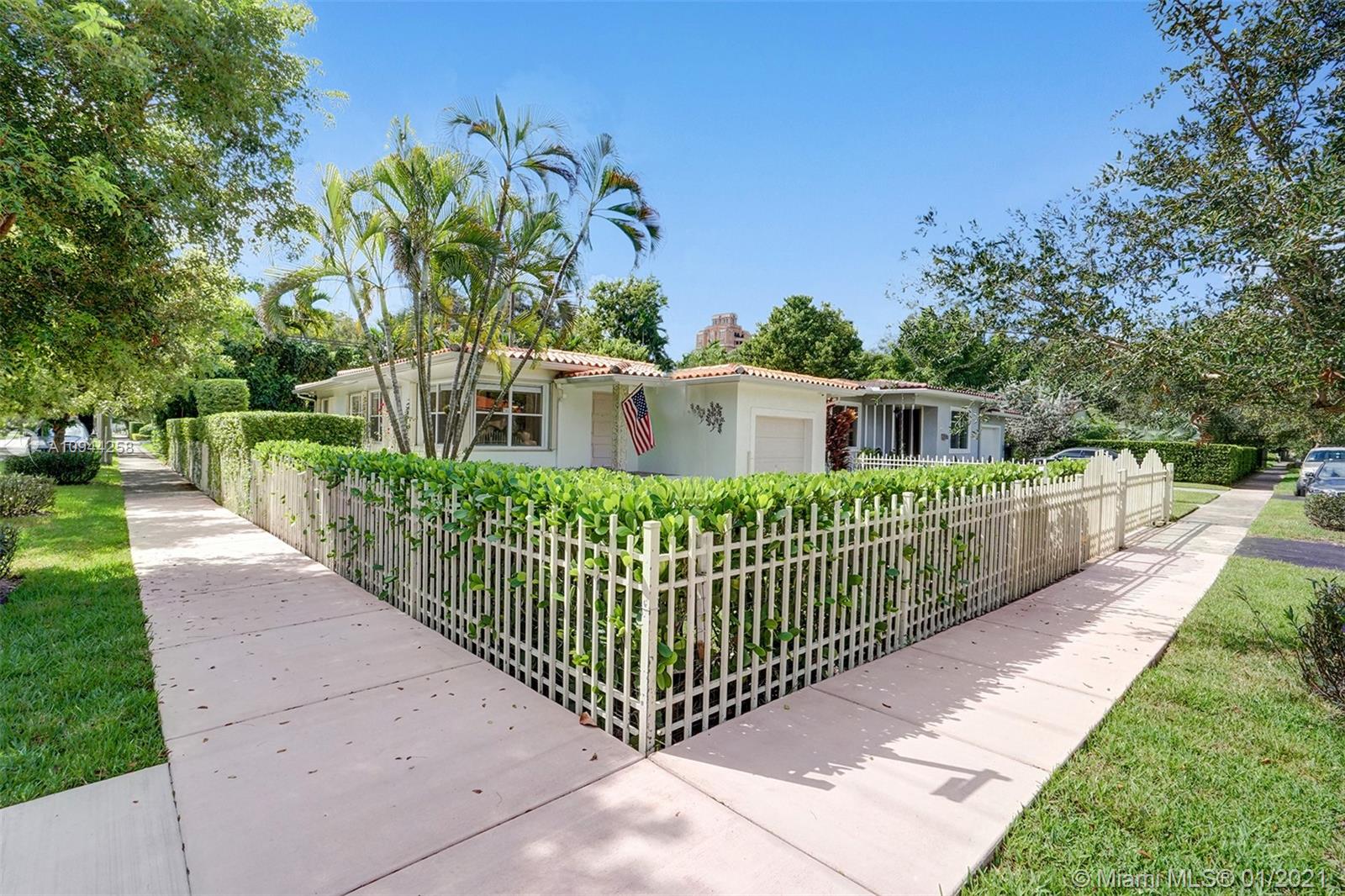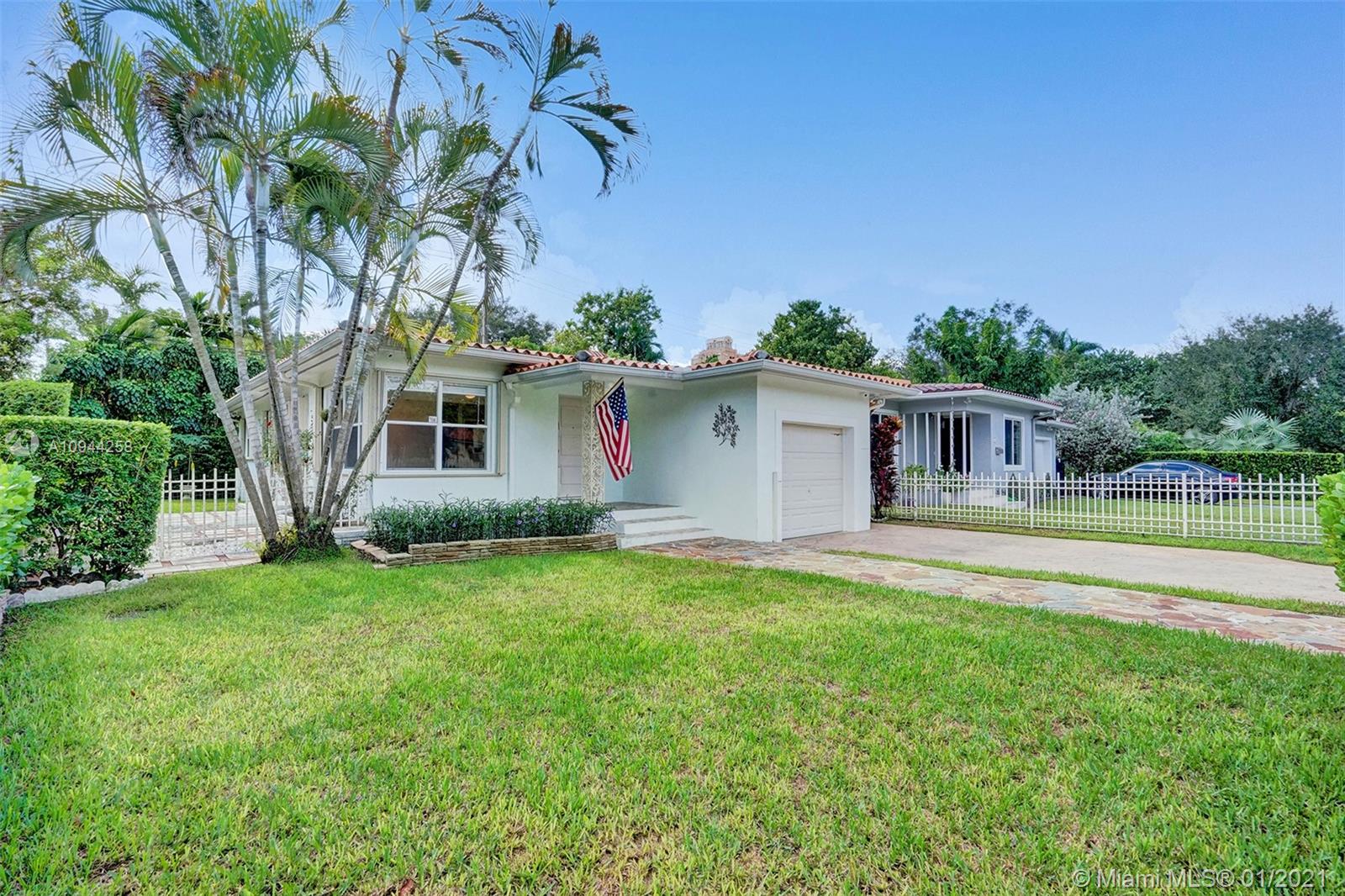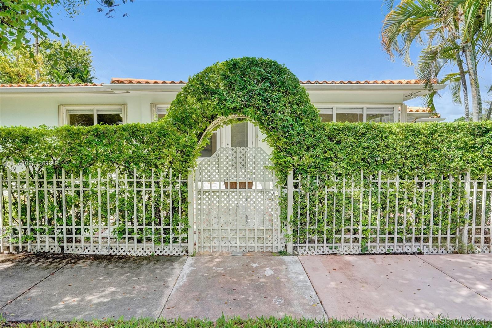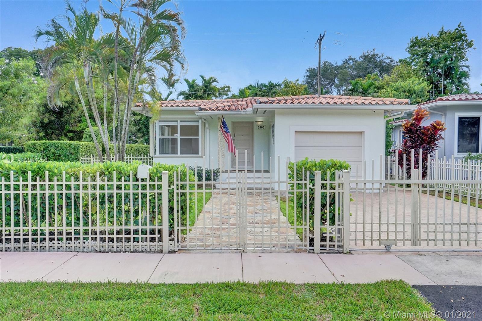 Corner property at Hernando and Giralda. Completely fenced. Wood floors throughout and ceramic tile floors in kitchen and bathrooms. Three bedrooms, two bathrooms plus one car garage. Hurricane accordion shutters. Remodeled kitchen and bathrooms. Rolling gate in driveway. Storage shed. Walk to restaurants on Giralda, Miracle Mile, houses of worship, schools, city hall, theaters, golf courses, tennis courts, etc.