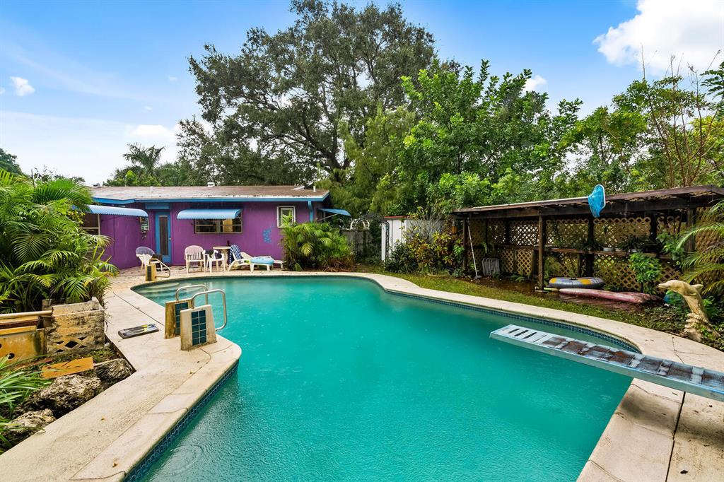 Better known as the Butterfly Home, this charming 3/3 is located on a 16,807 sq ft DOUBLE LOT at the end of a quiet cul-de-sac. A tropical oasis awaits you featuring organic fruit trees and plants including Avocado, Star Fruit, Miracle Fruit, Dragon Fruit, Jabuticaba, Valencia Orange, Honeybell and Bay leaf which draw numerous butterflies and birds that nest on the property. Not to mention the luxurious 8.5 ft deep swimming pool with a diving board. Another distinguishing feature is the in-law quarters with private kitchen and entrance. Recent 2019 improvements include brand new outdoor shower, new paint throughout, updated kitchen, fully renovated bathroom, updated lighting, new side entry door, new deck, automatic sprinklers and new archway. A/C is 2018. Come see this one of a kind gem!