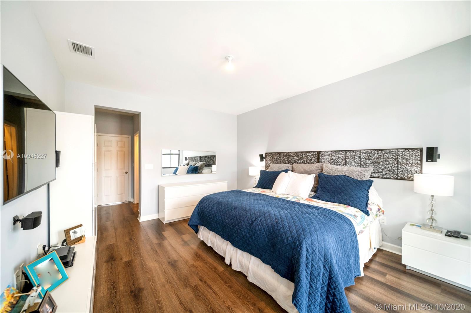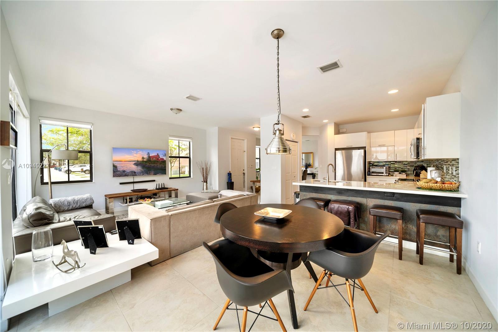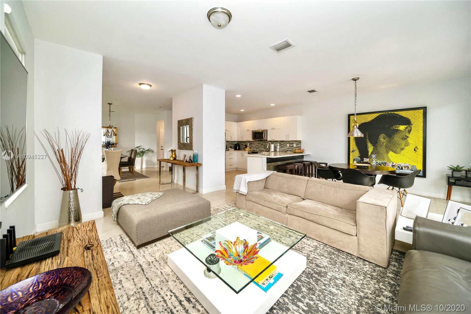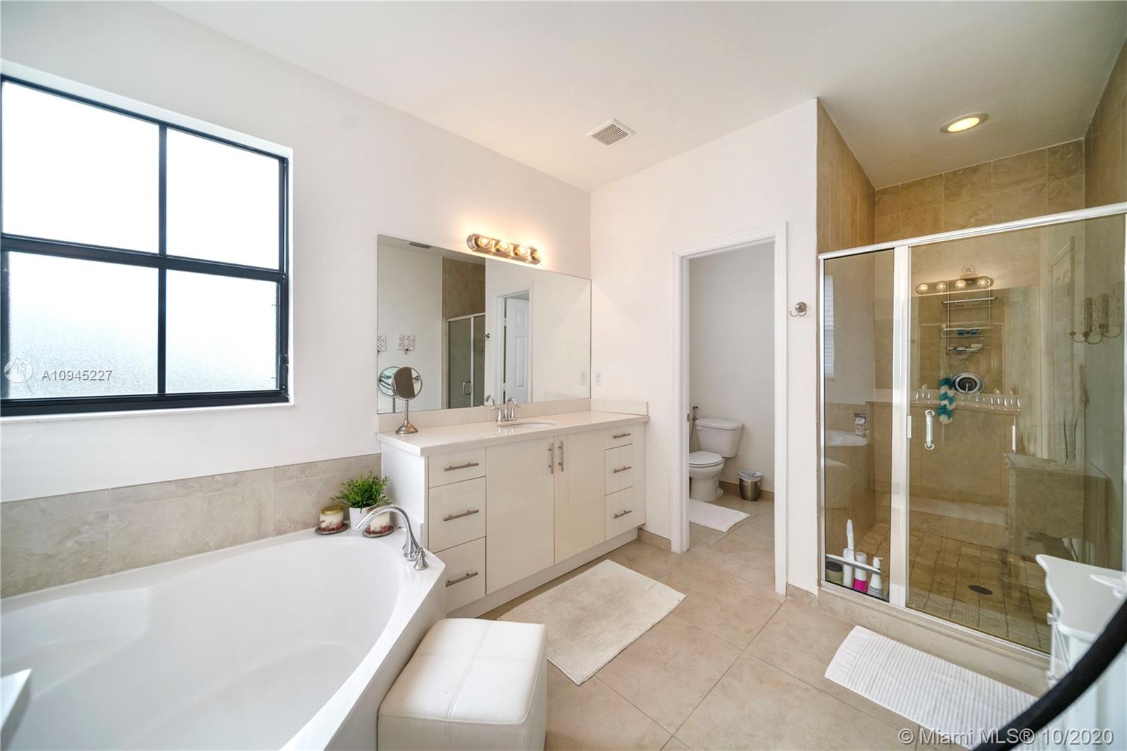 Elegant and spacious corner townhouse ready to move-in with 4 Beds + 1bed/office, 3.5 Baths, 2 car garage. Modern tile floor, and laminated wood on stairs and second level. This house features a spacious open floor plan w/ plenty of natural light, modern finishes, upgraded kitchen w/ Quartz countertop, modern vanities, spacious rooms, Master suite has a built-in walking closet, his and hers vanities, tub and glass shower. Laundry room located on second level, a welcoming patio design, 2 car garage or your personal Gym and office space. Close to community entrance, clubhouse, guest parking and mailbox. Doral Cay is a gated community,24/7 security, modern Clubhouse w/ wonderful amenities. Great location, walking distance to shops, restaurants, A+ Schools, and Turnpike and 826 Expressway