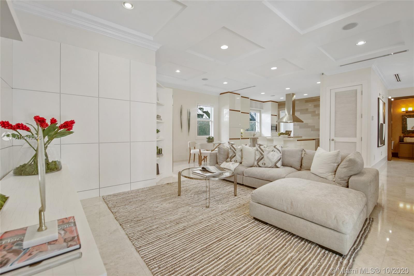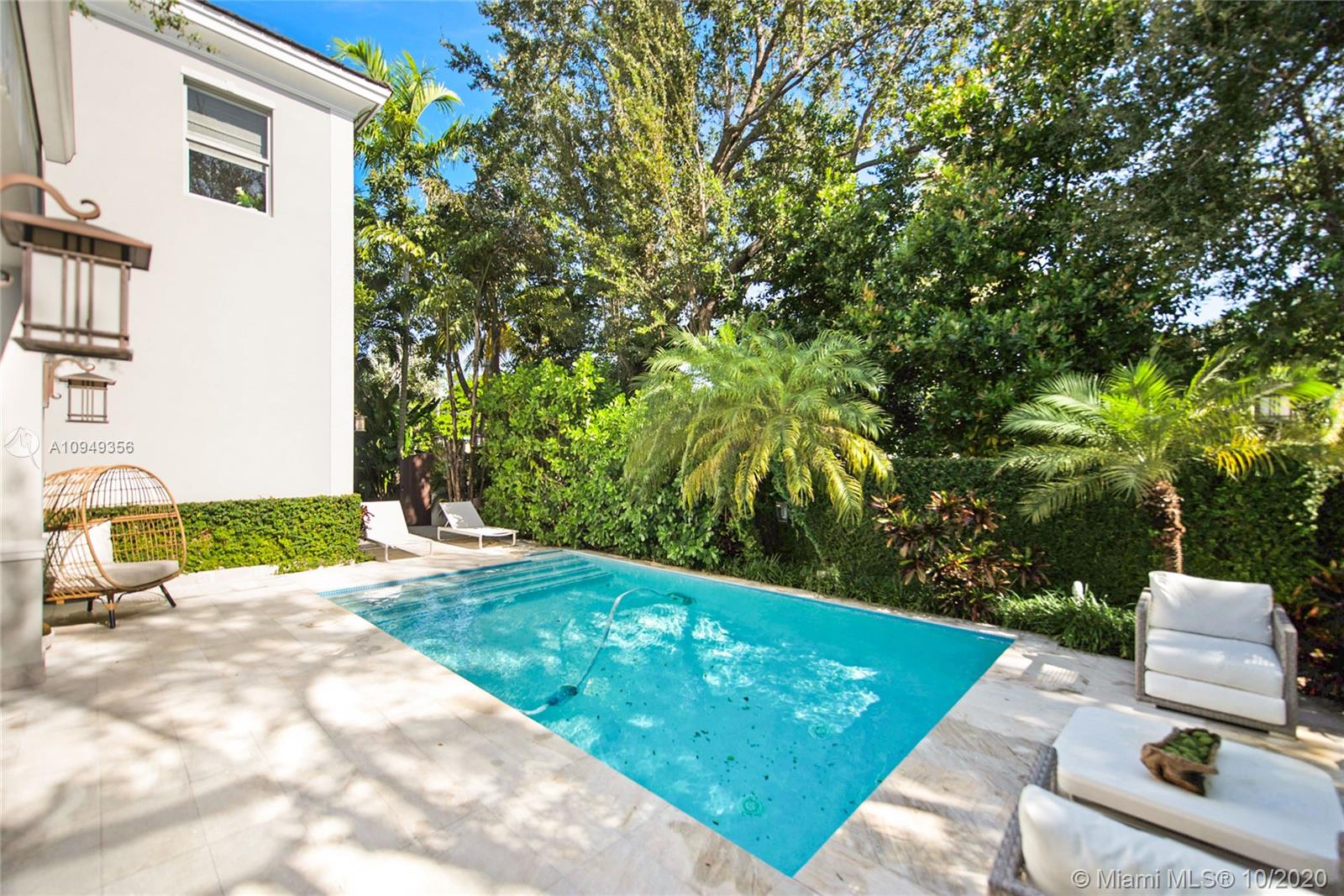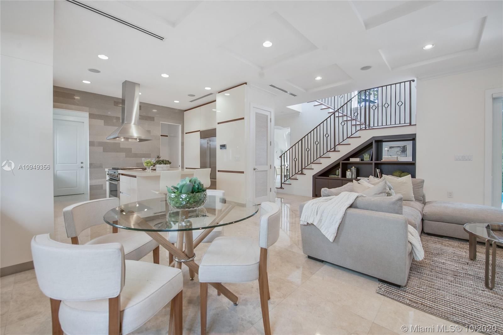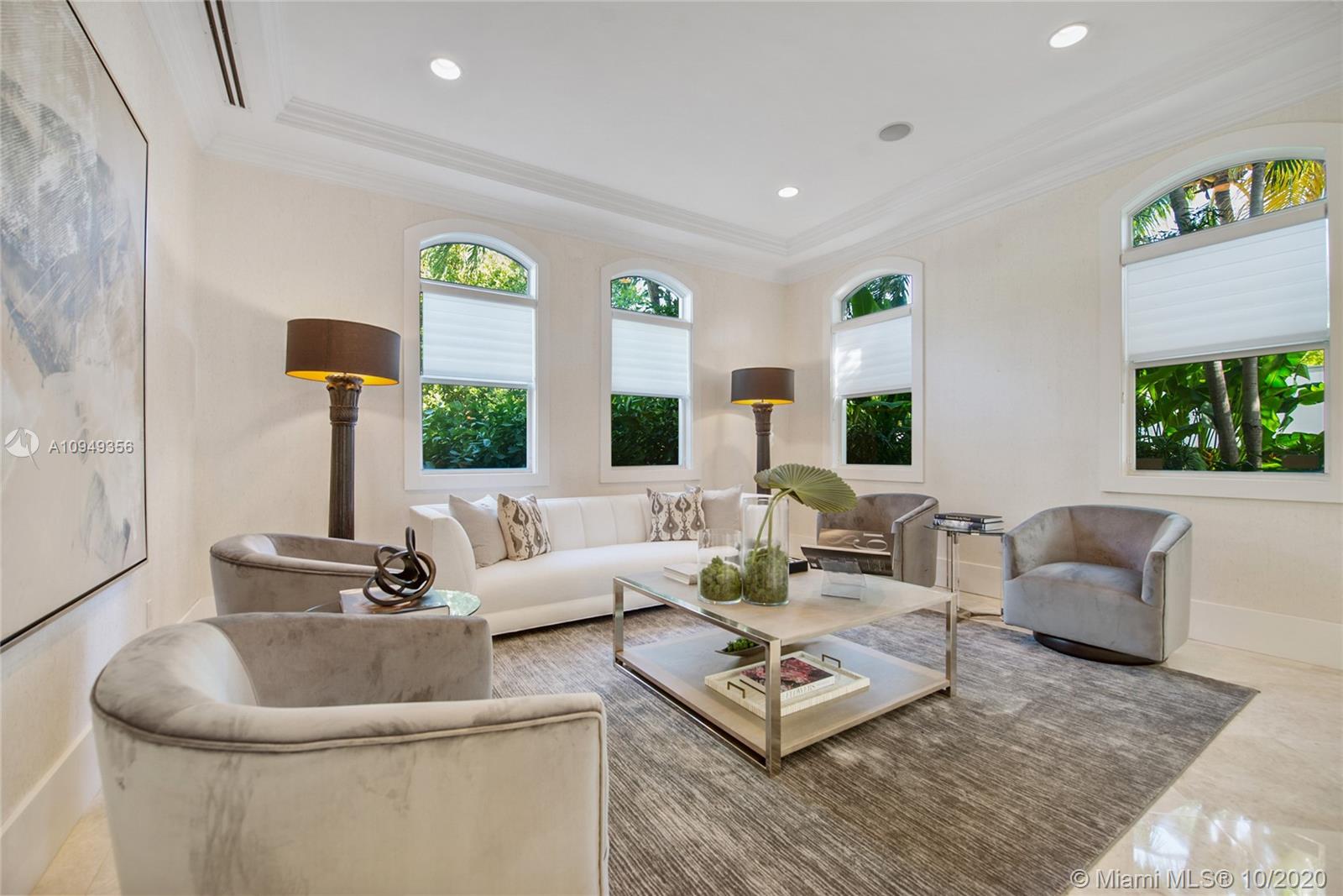 Stunning, magazine quality home in prestigious North Coconut Grove. Walk to bayfront parks & marinas, yet located at one of the highest sea-level elevations in South Florida. Totally walled & gated for ultra-privacy. Light-filled living spaces offer double-height ceilings and a blending of classic architectural details with a modern vibe. Expansive formal living & dining rooms for entertaining. Family room with custom built-ins, opens to the spectacular high-end kitchen w/white-lacquered cabinetry, walk-in pantry, professional gas range & adjacent breakfast area. Incredible master suite features his/hers walk-in closets (hers: 12’ X 19’), luxurious bath w/soaking tub & private terrace overlooking the garden & tranquil pool. Minutes to the Grove village center, MIA, downtown & the Beaches.