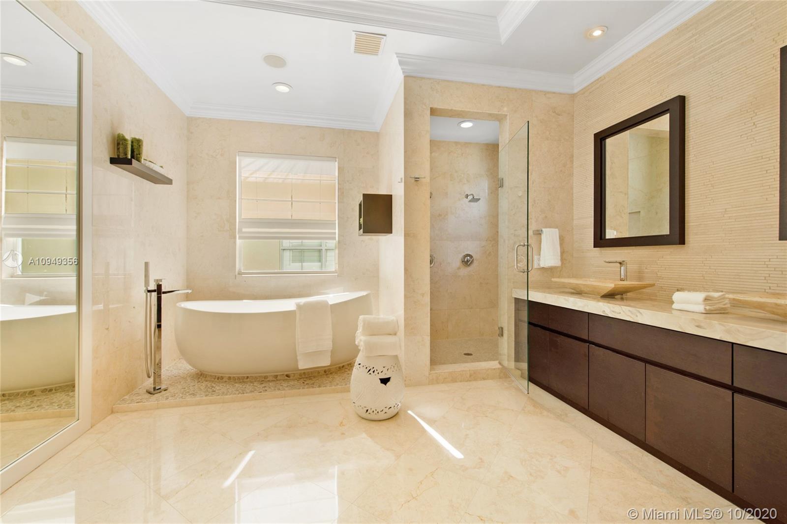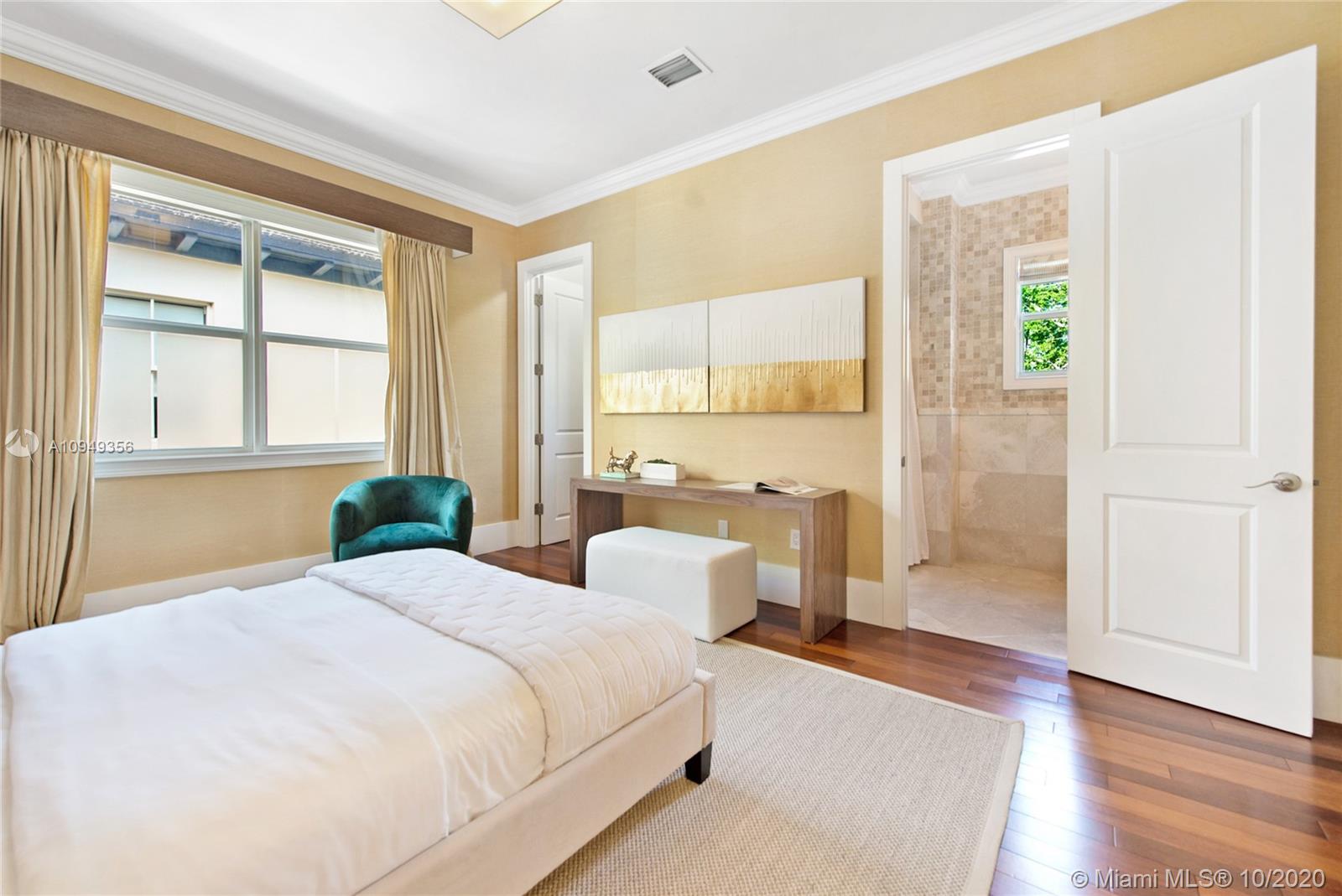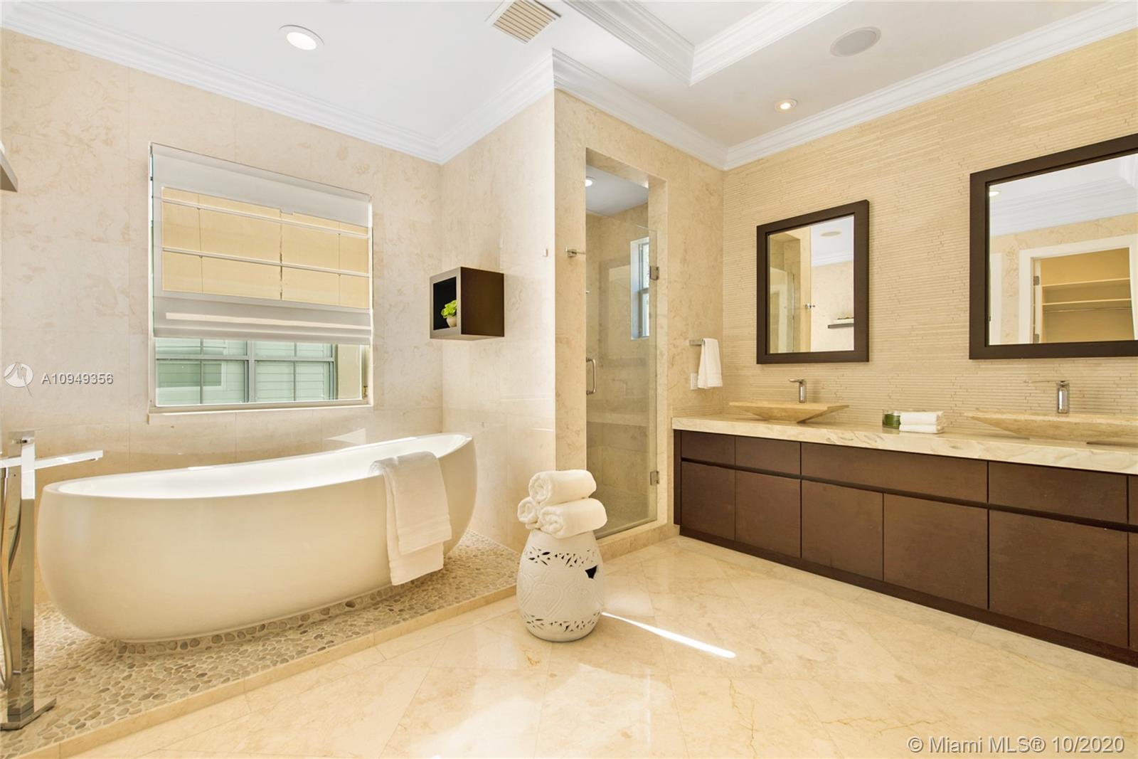 Stunning, magazine quality home in prestigious North Coconut Grove. Walk to bayfront parks & marinas, yet located at one of the highest sea-level elevations in South Florida. Totally walled & gated for ultra-privacy. Light-filled living spaces offer double-height ceilings and a blending of classic architectural details with a modern vibe. Expansive formal living & dining rooms for entertaining. Family room with custom built-ins, opens to the spectacular high-end kitchen w/white-lacquered cabinetry, walk-in pantry, professional gas range & adjacent breakfast area. Incredible master suite features his/hers walk-in closets (hers: 12’ X 19’), luxurious bath w/soaking tub & private terrace overlooking the garden & tranquil pool. Minutes to the Grove village center, MIA, downtown & the Beaches.