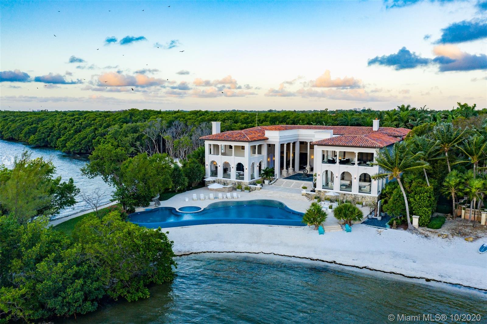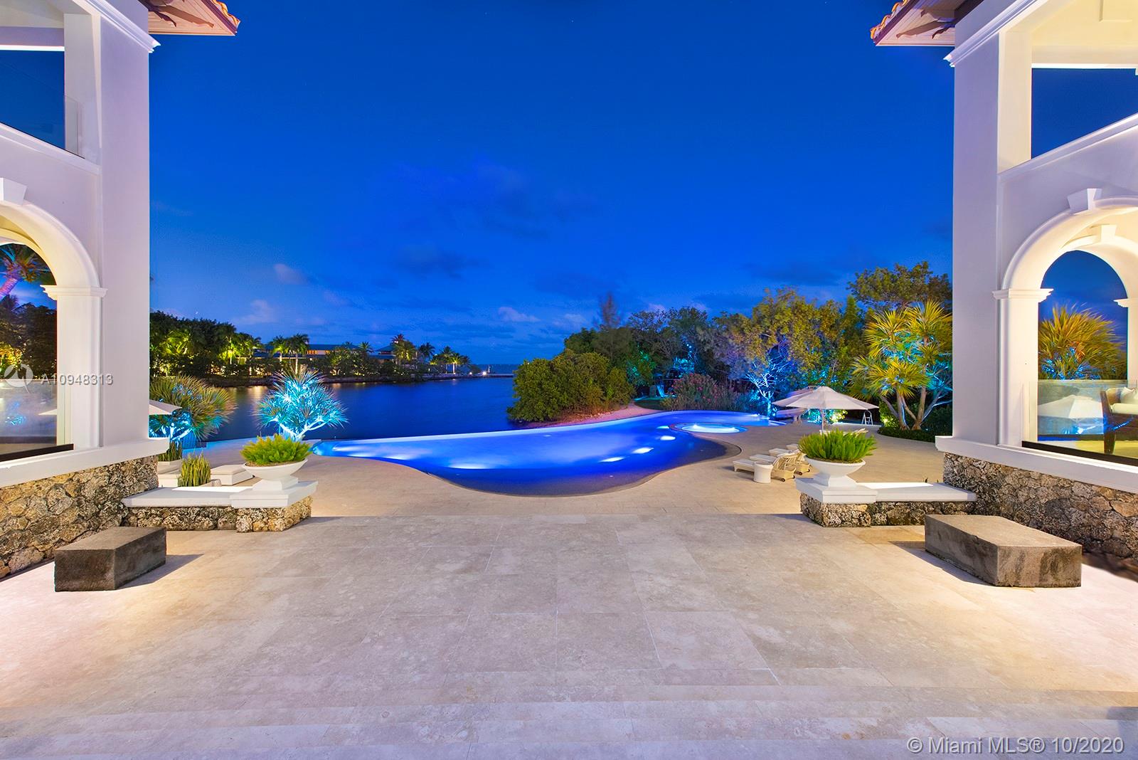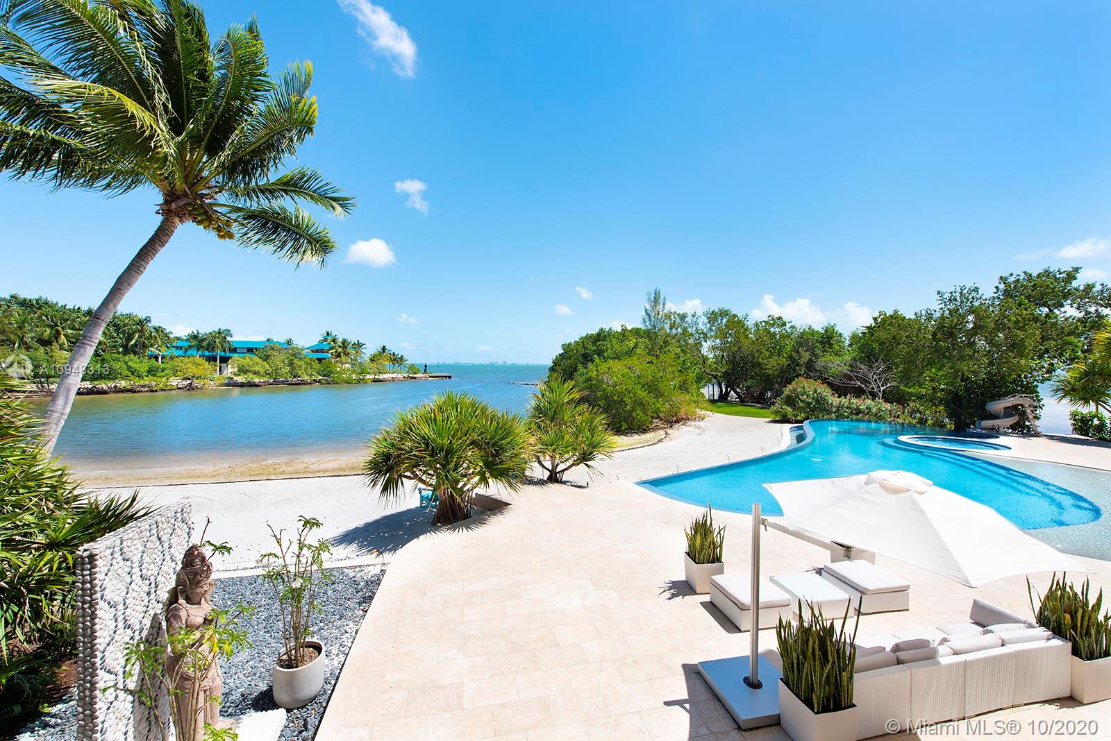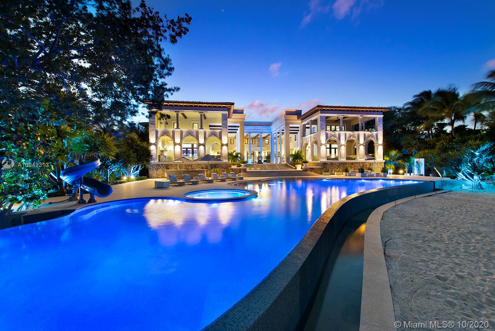 Paradise island estate complete with your very own sandy beach in the most exclusive gated community, Tahiti Beach. Find your secluded luxury lifestyle here. Located on a 1.5 acre peninsula with over 530 feet of open bay views. One of only 26 residences on this private island. Mesmerizing unobstructed views from nearly every corner. Nothing short of grand, the resort style backyard features marble throughout and cathedral inspired covered terraces equipped to entertain. 10 bedrooms, 10.5 bathrooms, designed by architect Ramon Pacheco and completely renovated in 2016. Soaring ceilings, elevator, fully loaded theater, heated pool. Your paradise awaits.