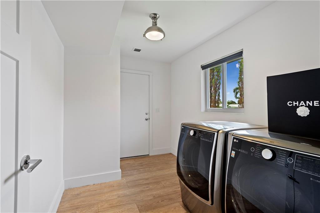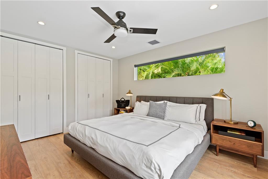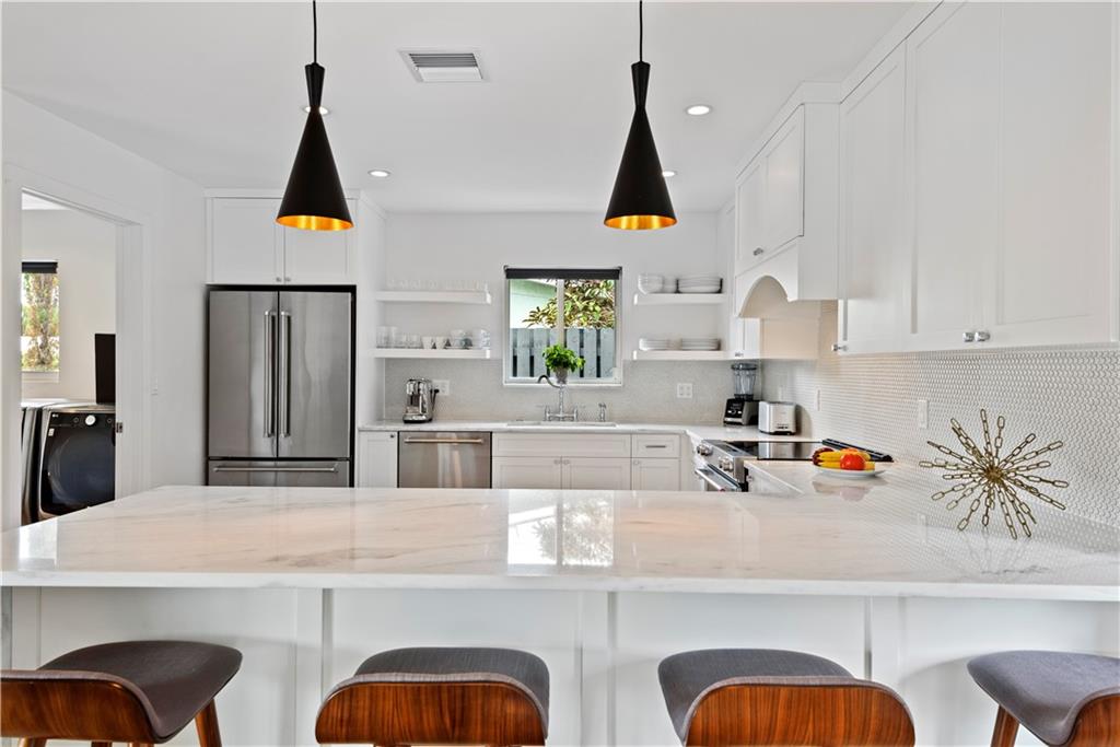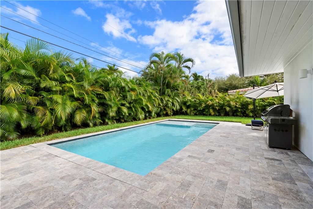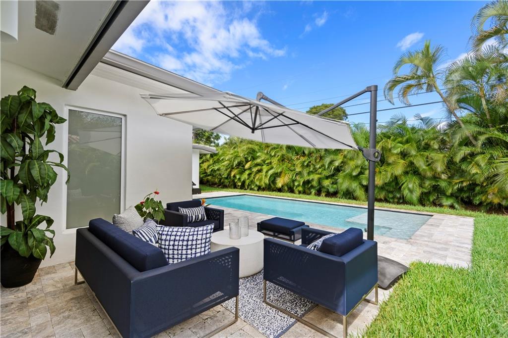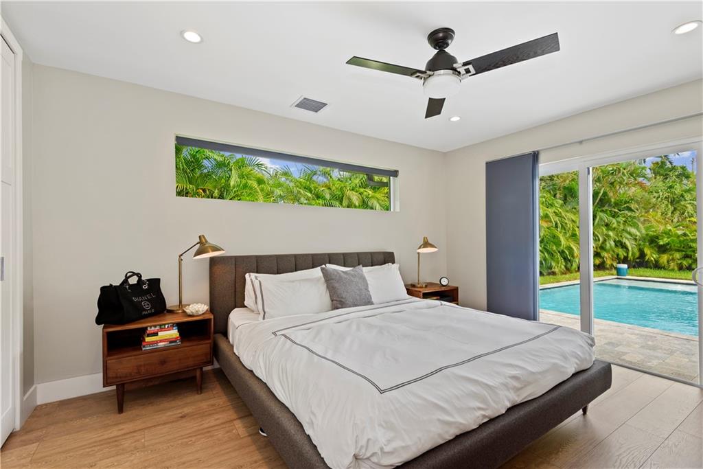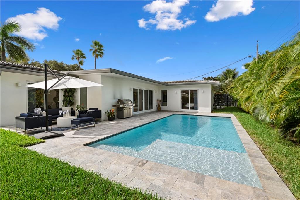 Stunning, completely rebuilt Imperial Point pool home! Open concept floor plan with wood flooring throughout. Primary suite w/ sliding doors to patio on one side and two guest bedrooms on other side of home. Bright, spacious kitchen with white cabinetry, stainless steel appliances, quartzite countertops w/ waterfall edge and bar seating. The home was completely rebuilt in 2018 including new plumbing, electrical, HVAC system, roof, impact windows, pool, etc. Enjoy the patio and pool with sunshelf in the lushly landscaped, private backyard. Additional features include an energy efficient tankless water heater, Nest thermostat, Ring doorbell and hookup in garage for an electric car charger. Meticulous and move-in ready!