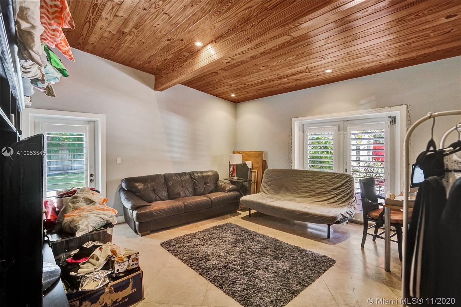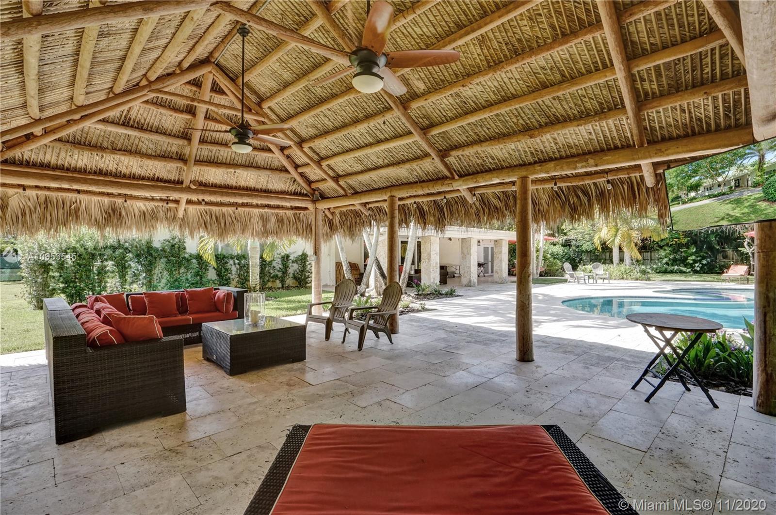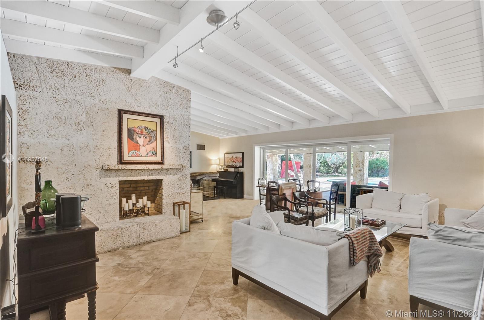 Resort living in Pinecrest! Tranquil courtyard framed by keystone columns invites you into this lovely 4 bed 3 bath home. Sitting on a lush builder's acre of fruit trees and flowering palms, this charmer has it all. Light and bright and tastefully updated, the 2,869sf home has wood-beamed cathedral ceilings, stunning keystone fireplace, Saturnia marble floors, updated contemporary kitchen and plenty of space for entertaining. Sliding doors open to outdoor living space and spectacular resort style backyard with free form pool, 500sf Tiki Hut, and loads of yard. The split plan provides three bedrooms and two baths on one side, and the 4th bed/office, bath, laundry and large family/game room on the other. Gorgeous landscape lighting and invisible fence for dogs are bonus amenities.