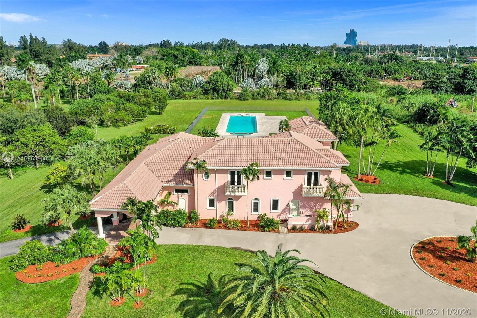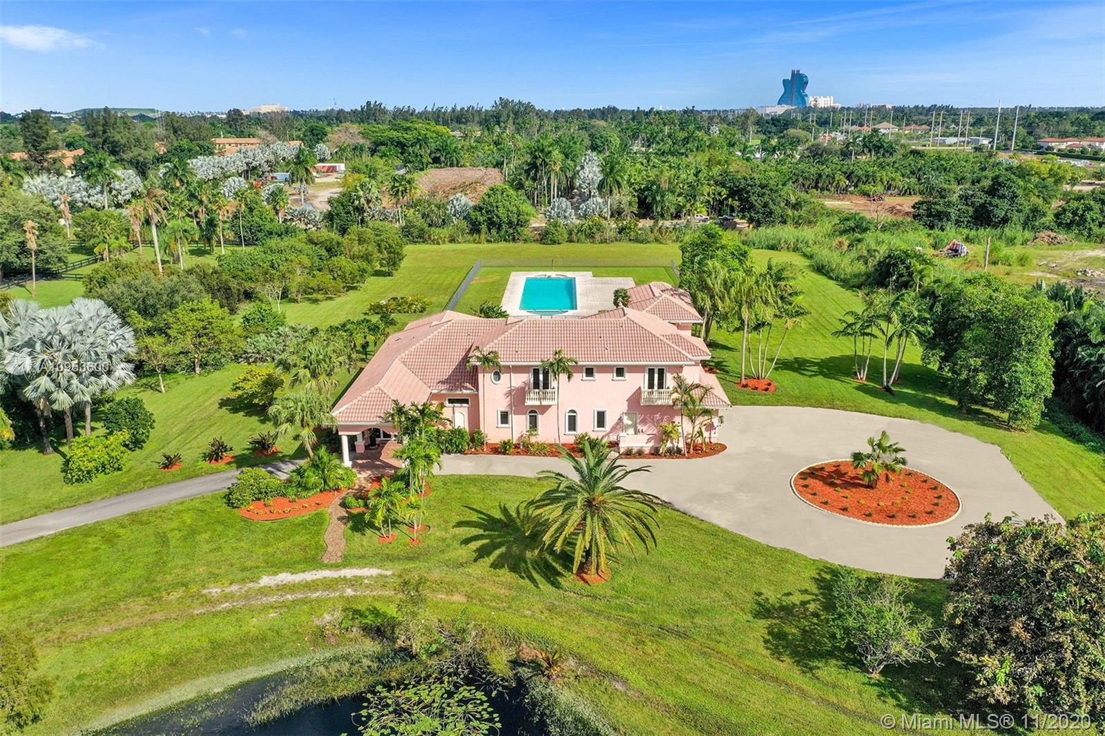 Fabulous opportunity for a sprawling, private estate in the heart of East Davie. 10 beautiful and quiet acres await you with easy access to major roadways, making any commute a breeze. This secluded, comfortable and unique home offers 8 bedrooms and 7.5 baths with a separate guest quarters; 6 bedrooms of which are their own private suites. Effortlessly host friends and family with the privacy afforded by this well-executed floor plan. This generous home includes a large 3 car garage, an incredible and refreshing 74 foot pool with an additional spa, hurricane impact windows, the comfort of a 4-zone HVAC system & plenty of room for horses. Take a relaxing stroll down the winding drive and discover your new luxurious paradise.