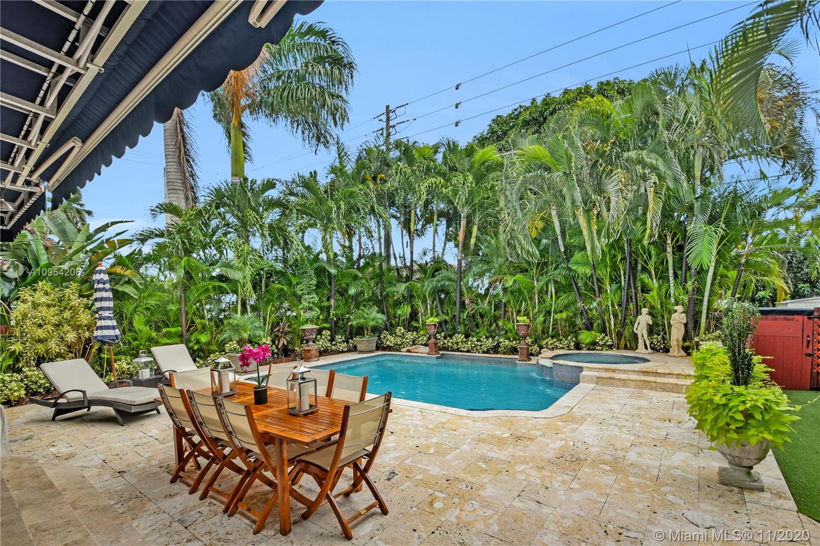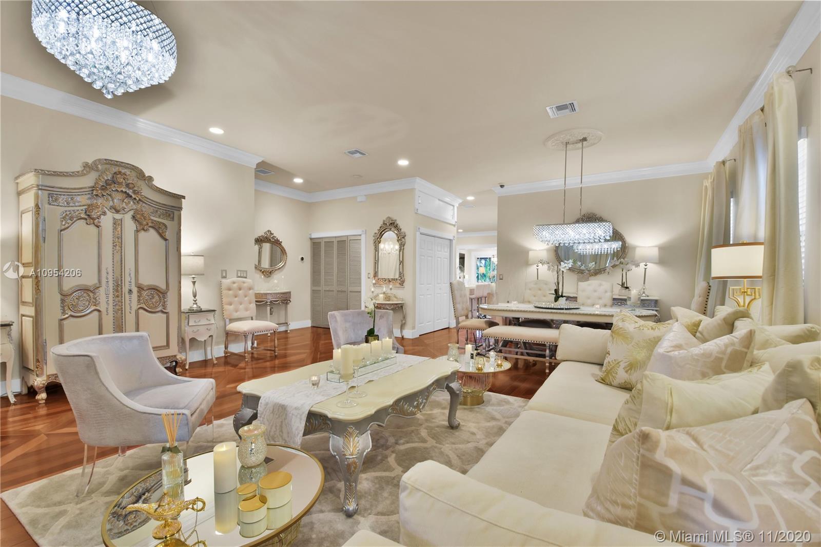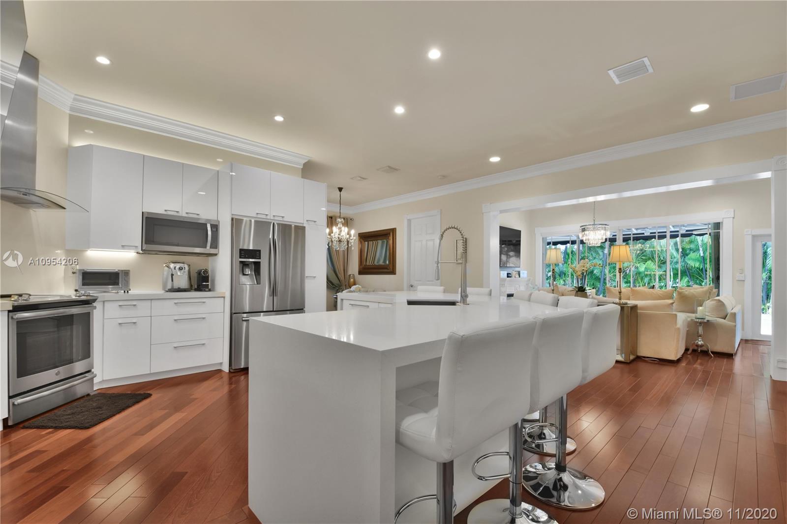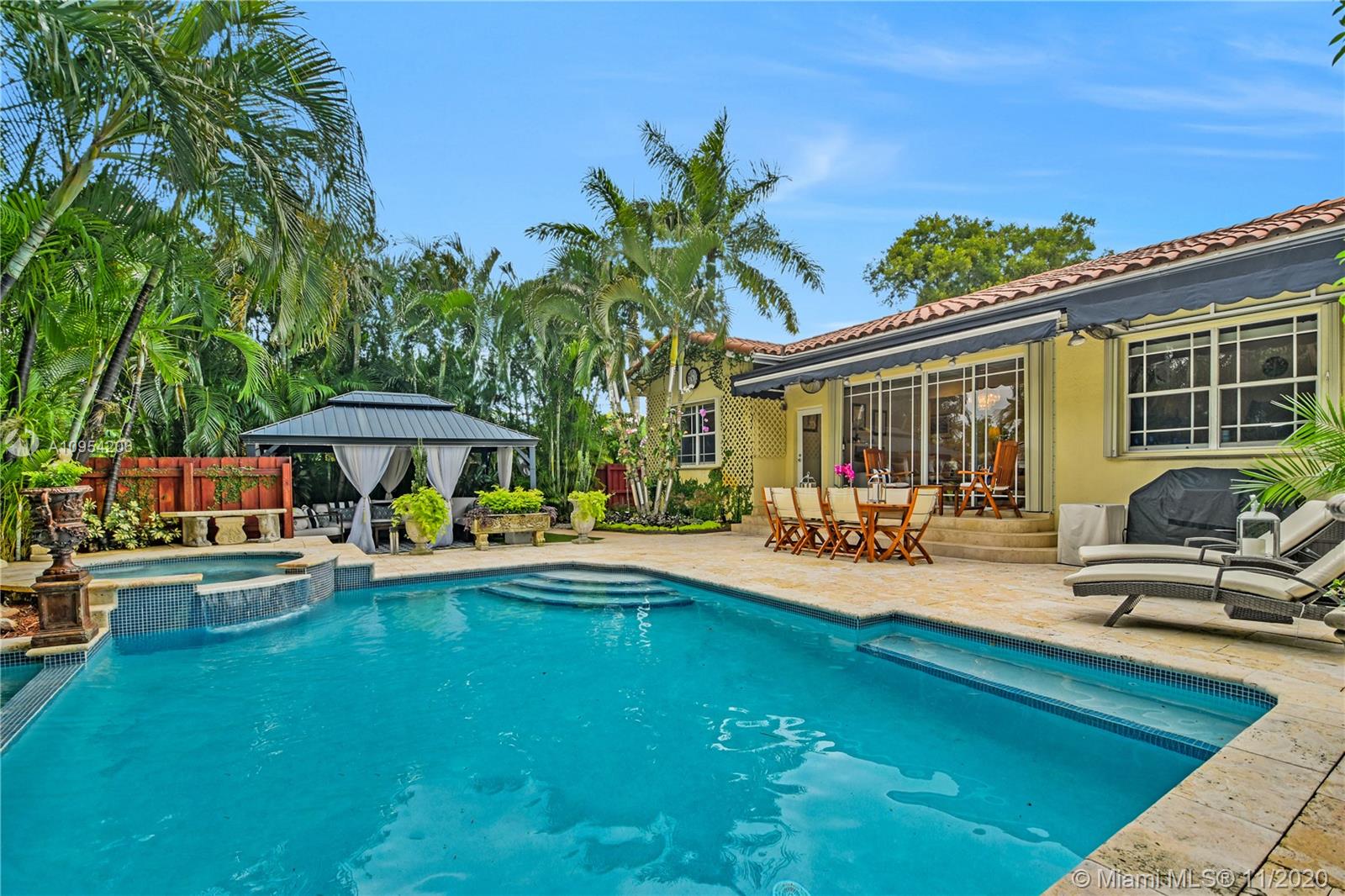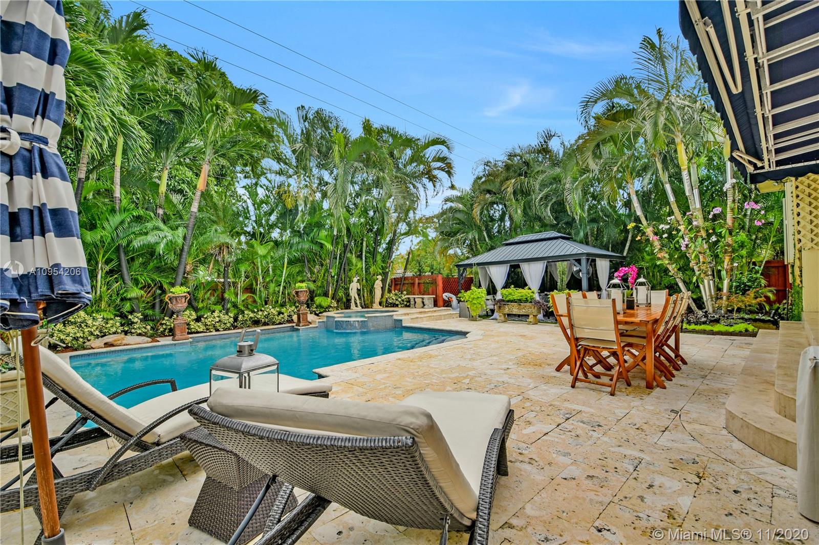 A neighborhood-defining property, this elegant, three-bedroom, two-bath Hollywood home has been fully remodeled for the modern lifestyle. An entry motor court leads to the abundantly lit, open-plan interiors showcasing sophisticated living, dining and family rooms and a brand new kitchen with Samsung appliances. Interiors segue to the resort-style, entertainer’s backyard, featuring expansive terraces, heated waterfall pool, cascading spa and modern gazebo lounge, surrounded by tall palms and meticulous landscaping. Three bedrooms include the spacious primary suite with soaking tub and dual vanities. Features include an in-home gym, exquisite finishes, a new water heater, sprinkler system and well to reduce water costs. A private, tropical retreat, located moments from world-class shopping.