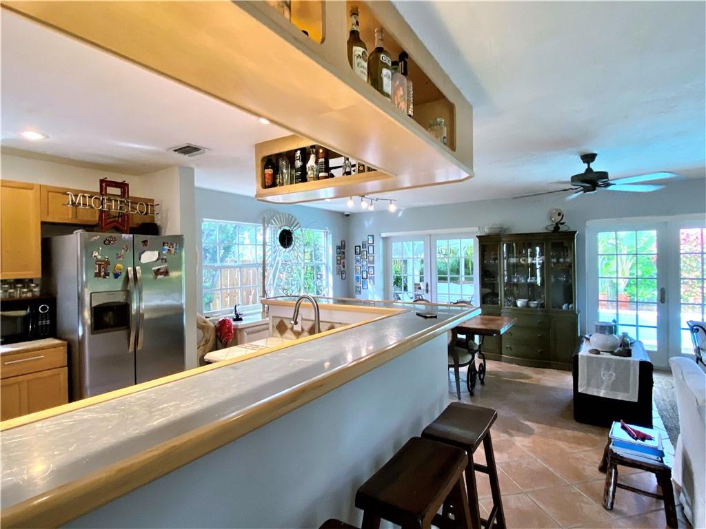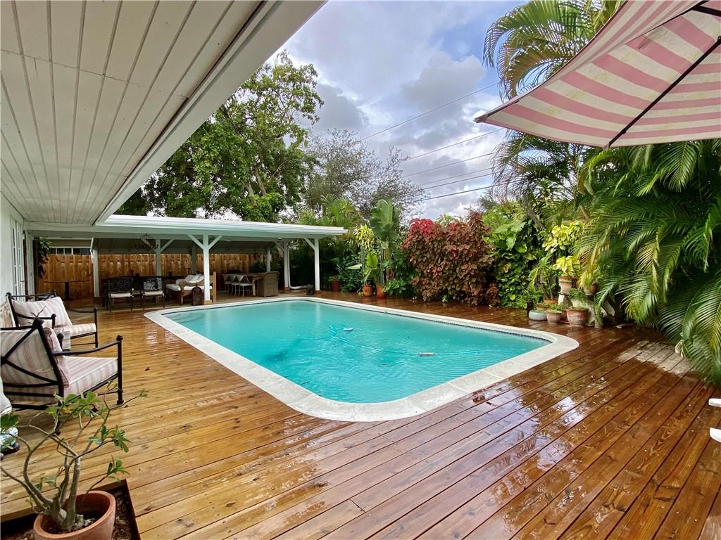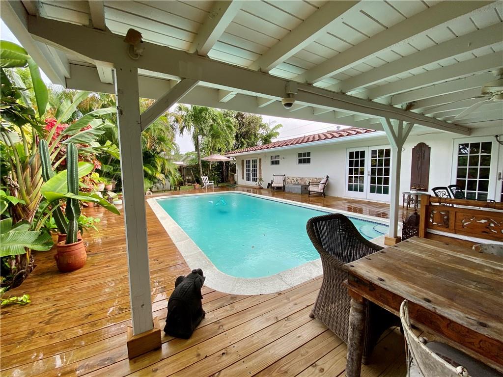 Key West Style home with Pool & garage on quiet dead-end street. Open floorplan. Kitchen features tile counter tops, 2 sinks, Stainless appliances, snack bar, natural gas cooking. Separate pantry/laundry room off the kitchen. Small Bonus/storage room off pantry/laundry room with separate entrance. Updated bathrooms. Covered outdoor dining and newer deck. Sparkling Pool. Great outdoor living-Lushly landscaped and fully fenced for privacy. Move in ready. Convenient to Downtown/Las Olas, Beaches, Airport & all major highways.