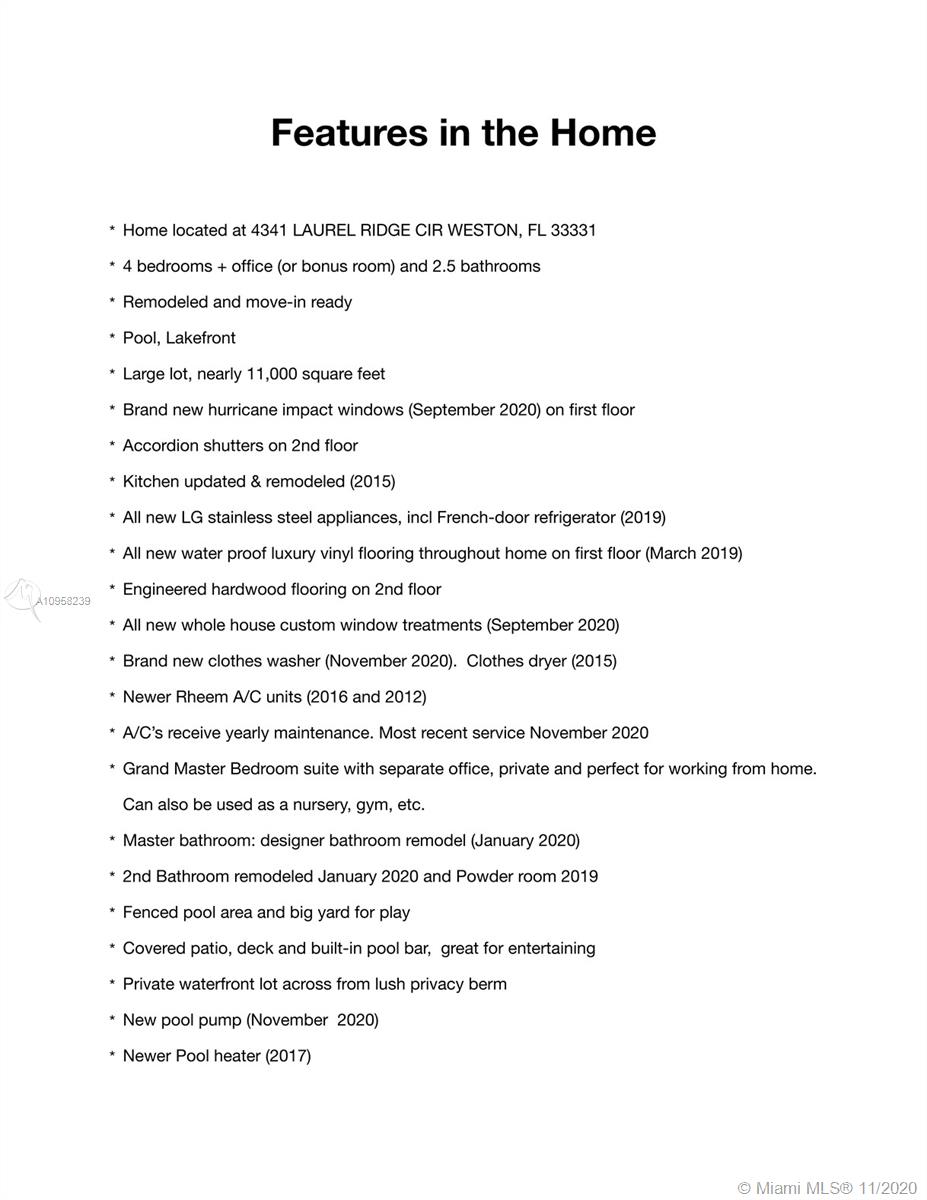 Beautifully REMODELED and move-in ready! 4bed + office, 2.5 bath, pool, lakefront & situated on a large lot across from a lush privacy berm. Brand new hurricane impact glass on first floor (Sept 2020). Accordions on top level. Updated kitchen w all new appliances (2019). Master suite with office, perfect for working from home. (or can be used as a nursery, gym..) All bathrooms tastefully remodeled! Covered patio, deck and built-in pool bar, great for entertaining. Fenced pool area & big yard for play. MANY updates, see list! Located in desirable The Ridges community w clubhouse, playgrounds, pools, tiki huts, splash pad, toddler pool, BBQ area, basketball/volleyball/soccer areas, lots of tree-shaded walk ways & more. 24/7 manned security. Weston’s A+ schools. Easy access to highways.