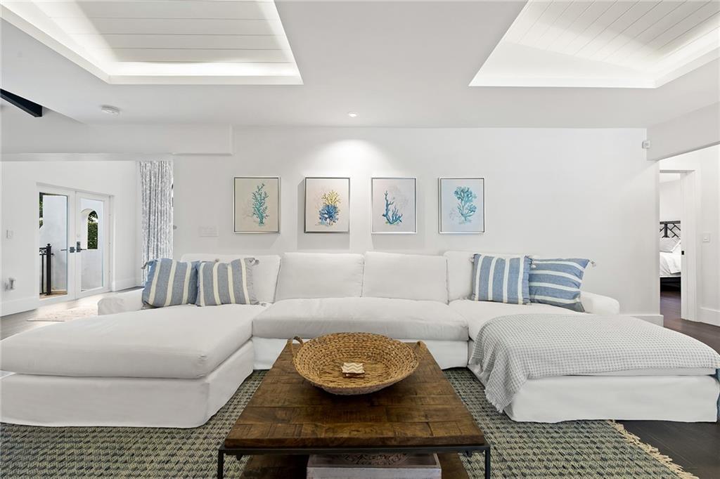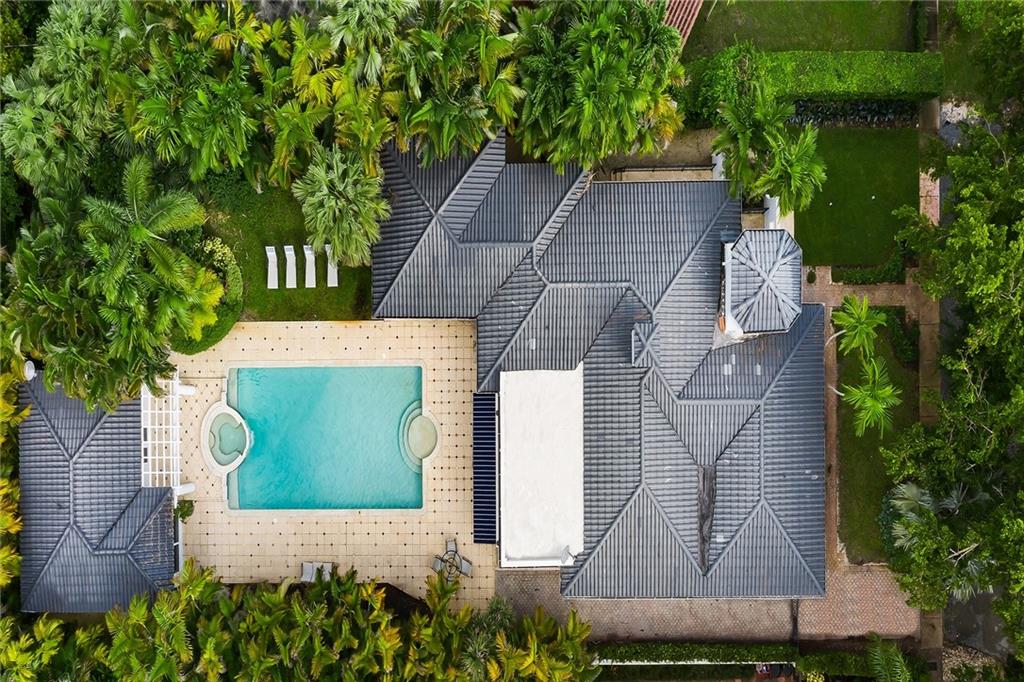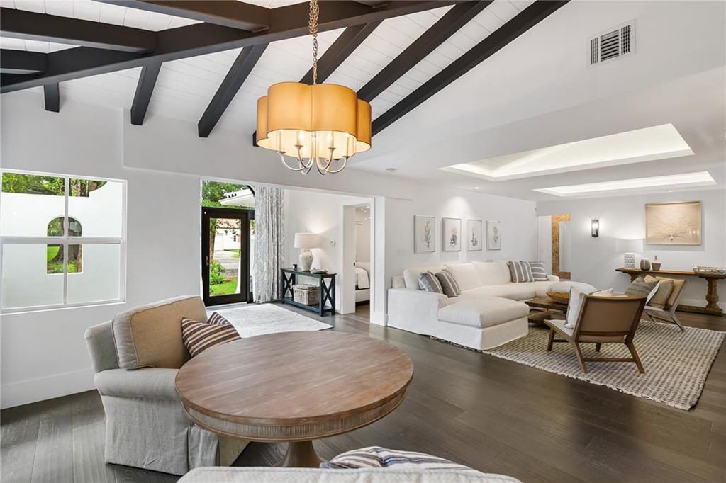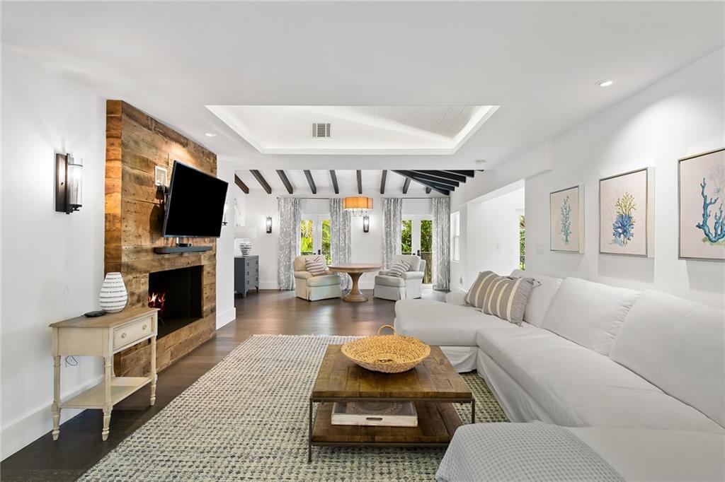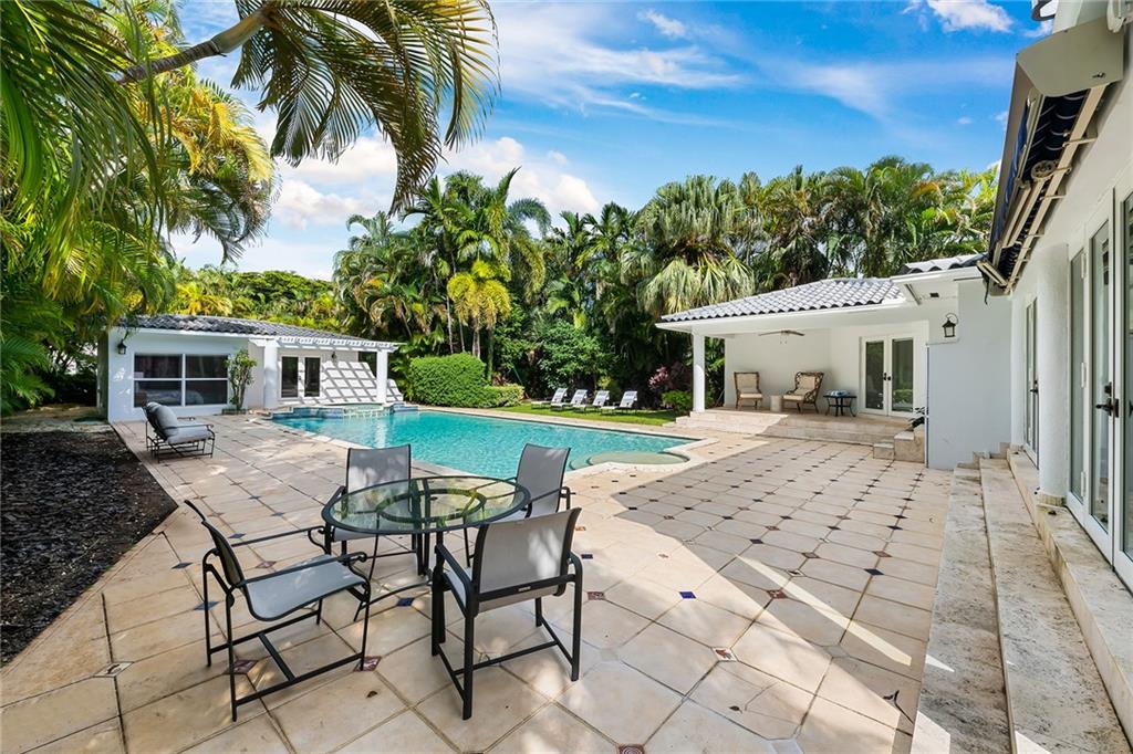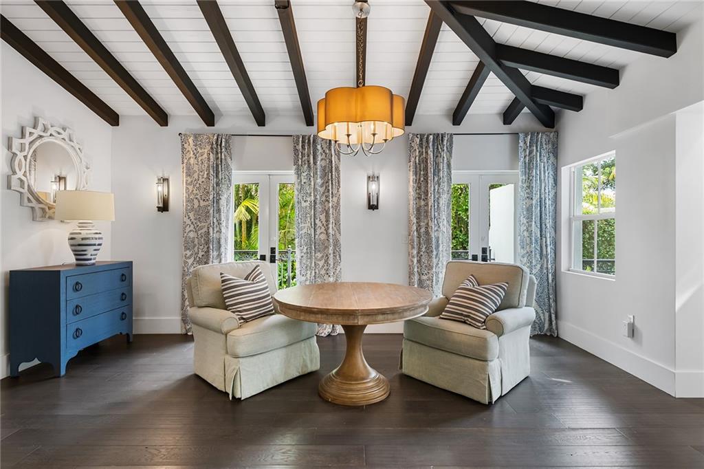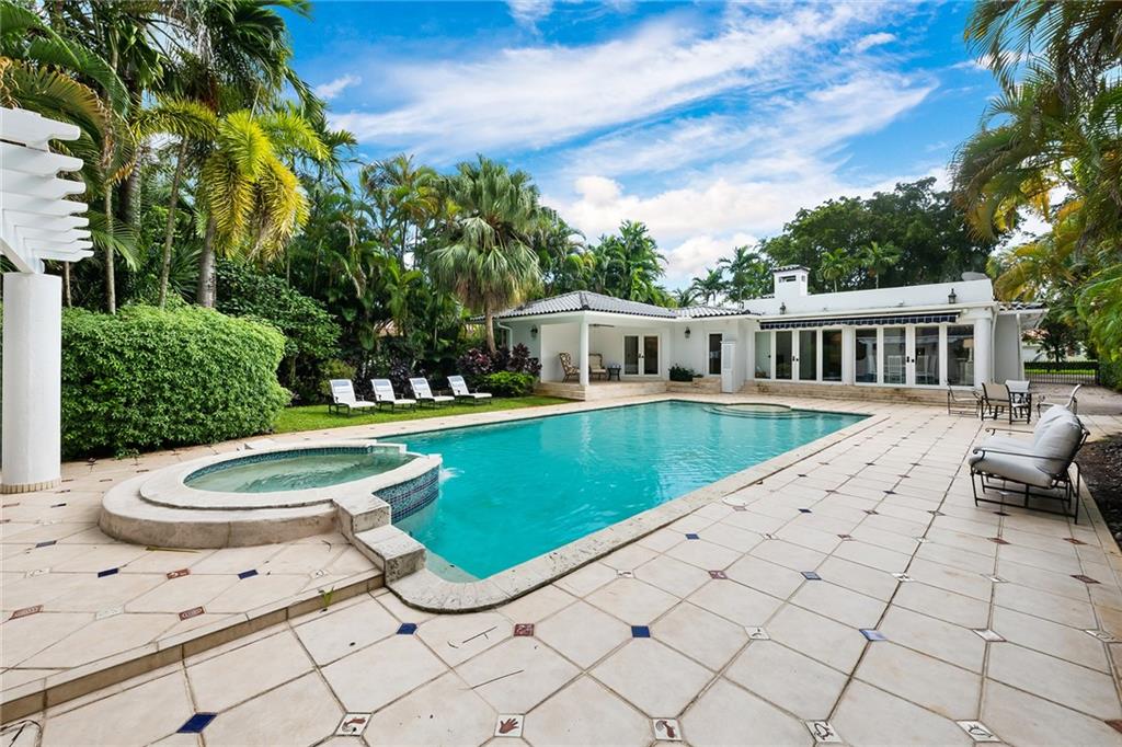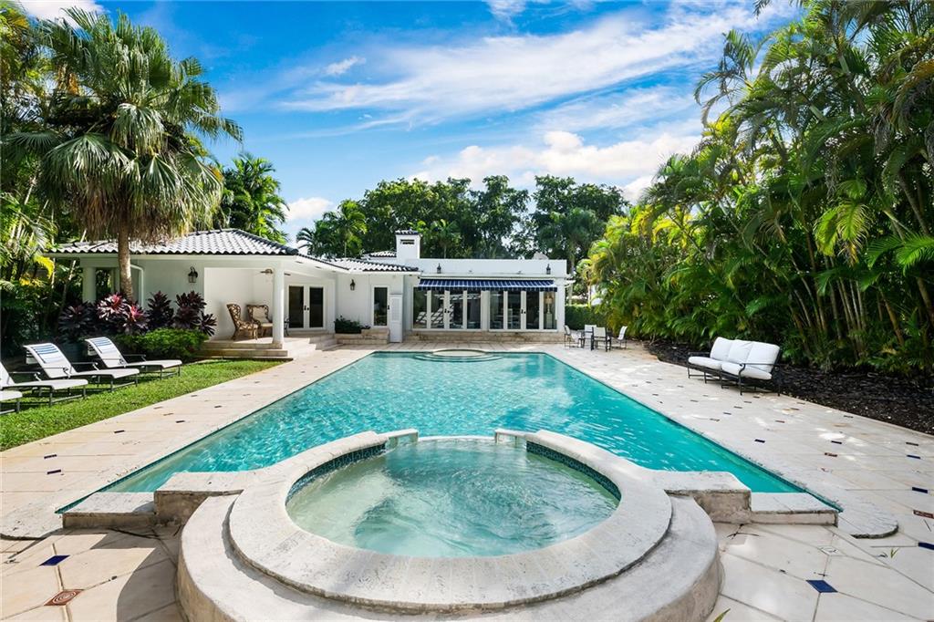 Welcome home to beautifully renovated and professionally designed transitional modern, in the heart of the exclusive Coral Gables community. Enjoy an open warm inviting floor plan flooded by natural light from multiple french doors defining the exterior walls. Elevated ceiling heights in the entry present a grand entrance that pulls your eyes into the main living area highlighted with fireplace, raised ceilings, wood beam accents, wall sconces, elegant window treatments, and chic furniture accents. The kitchen and dining area of the home offer top of the line appliances (Viking) and gas cooking options. With 4 bedrooms + den in the main house and a full functioning guest house ( kitchen, full bath, and separate bedroom) this house is incredible. Lush, tropical, private, and modern.