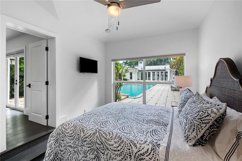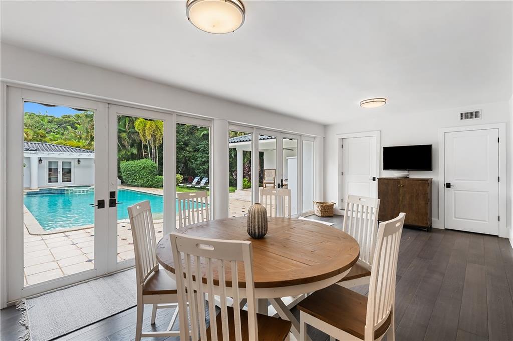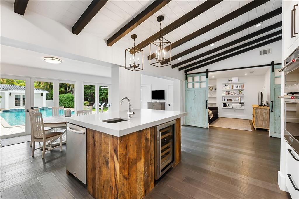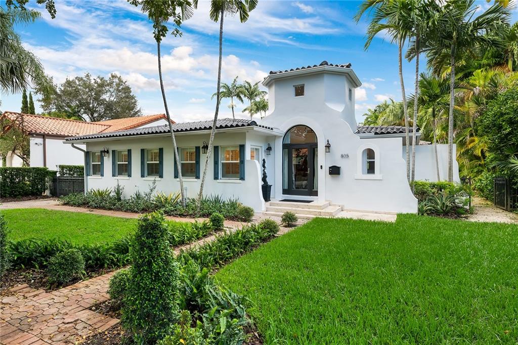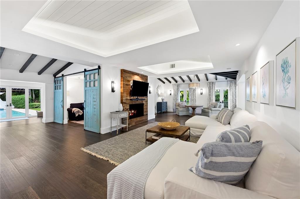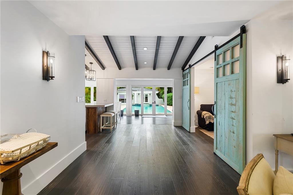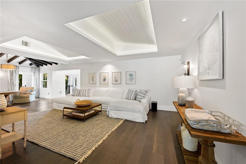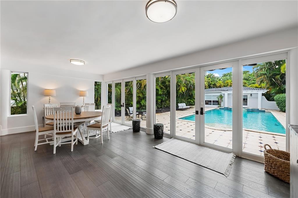 Welcome home to beautifully renovated and professionally designed transitional modern, in the heart of the exclusive Coral Gables community. Enjoy an open warm inviting floor plan flooded by natural light from multiple french doors defining the exterior walls. Elevated ceiling heights in the entry present a grand entrance that pulls your eyes into the main living area highlighted with fireplace, raised ceilings, wood beam accents, wall sconces, elegant window treatments, and chic furniture accents. The kitchen and dining area of the home offer top of the line appliances (Viking) and gas cooking options. With 4 bedrooms + den in the main house and a full functioning guest house ( kitchen, full bath, and separate bedroom) this house is incredible. Lush, tropical, private, and modern.