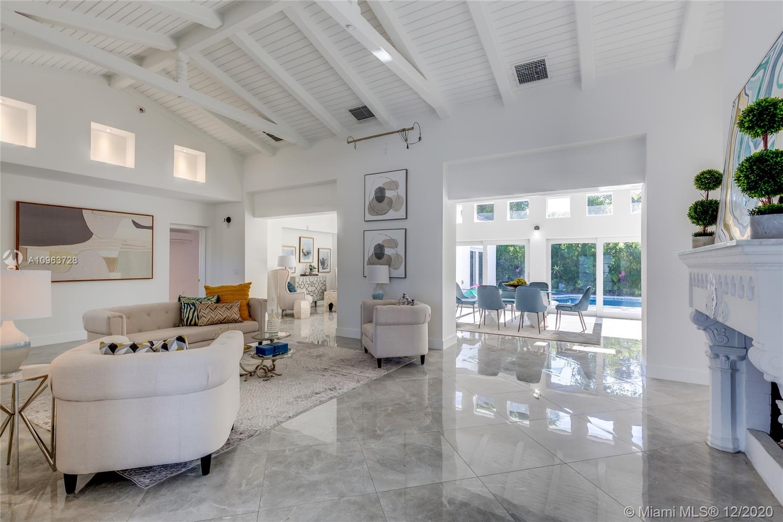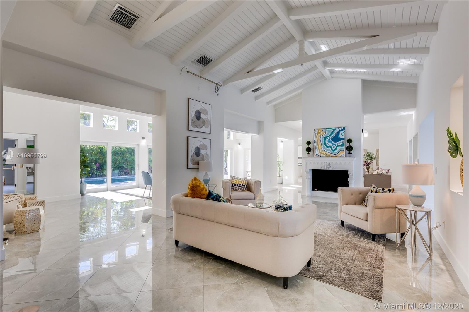 Wonderful opportunity to own a Miami Beach Paradise on an oversized lot. Very unique design with vaulted ceilings in the living room and pool views from all living areas as well as main bedroom. Completely fenced in dog run. The home has been beautifully updated for you in 2015 and 2020. New European style kitchen w/ custom island & breakfast/bar area , new roof, new bathrooms, new flooring, impact windows & doors, 3 new AC systems, new swimming pool and new patio area. Great floor plan with lots of privacy. Additional bonus room could be used for guests, a live in or a nanny. Plenty of Parking in the circular drive way or in the 2 car garage.This home on prestigious Pine Tree Drive is only a few blocks from the Ocean. A Beautiful Miami Home.