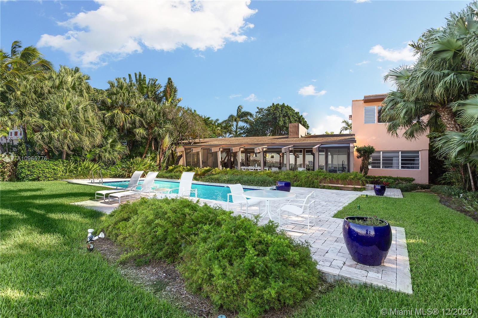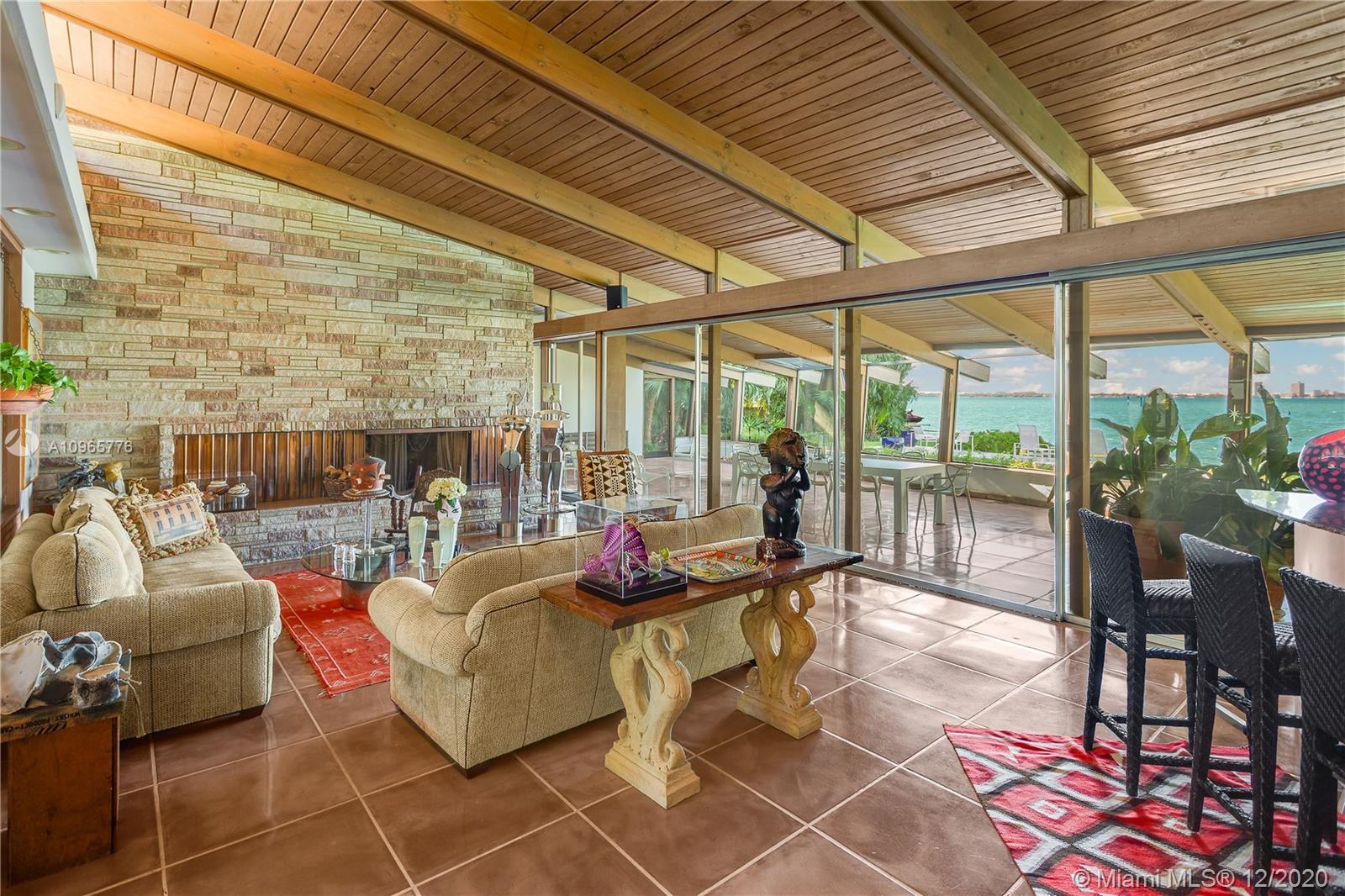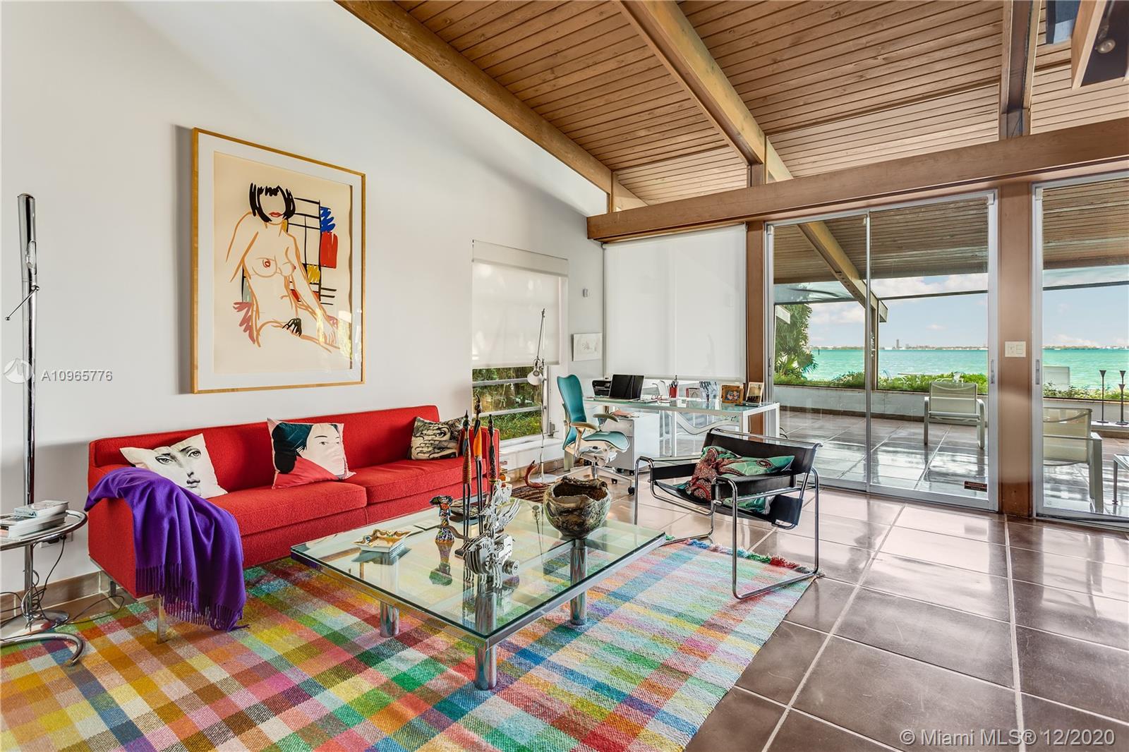 True mid century modern gem located on the most sought after location of prestigious North Bay Rd. Enter into this unique architecturally designed home surrounded by lush landscaping through wooden gates and an open foyer entry where you will find high ceilings and great walls for art throughout. The functional indoor outdoor living make it the perfect home for entertaining. Enjoy the bay breeze and breathtaking sunset views from the outdoor oasis that offers over 100+ ft of water frontage and unobstructed bay views.