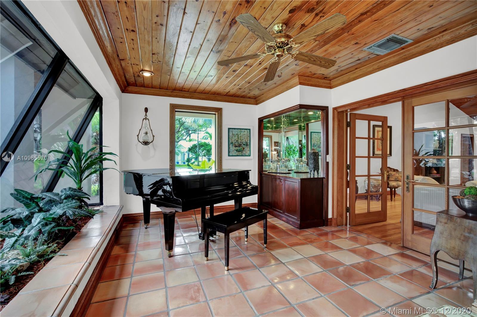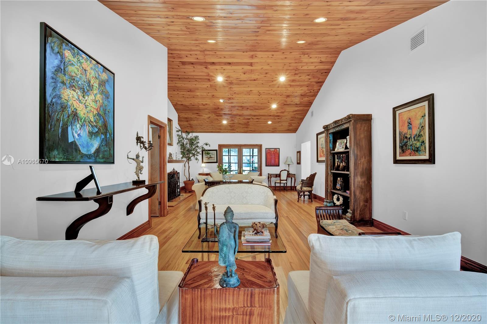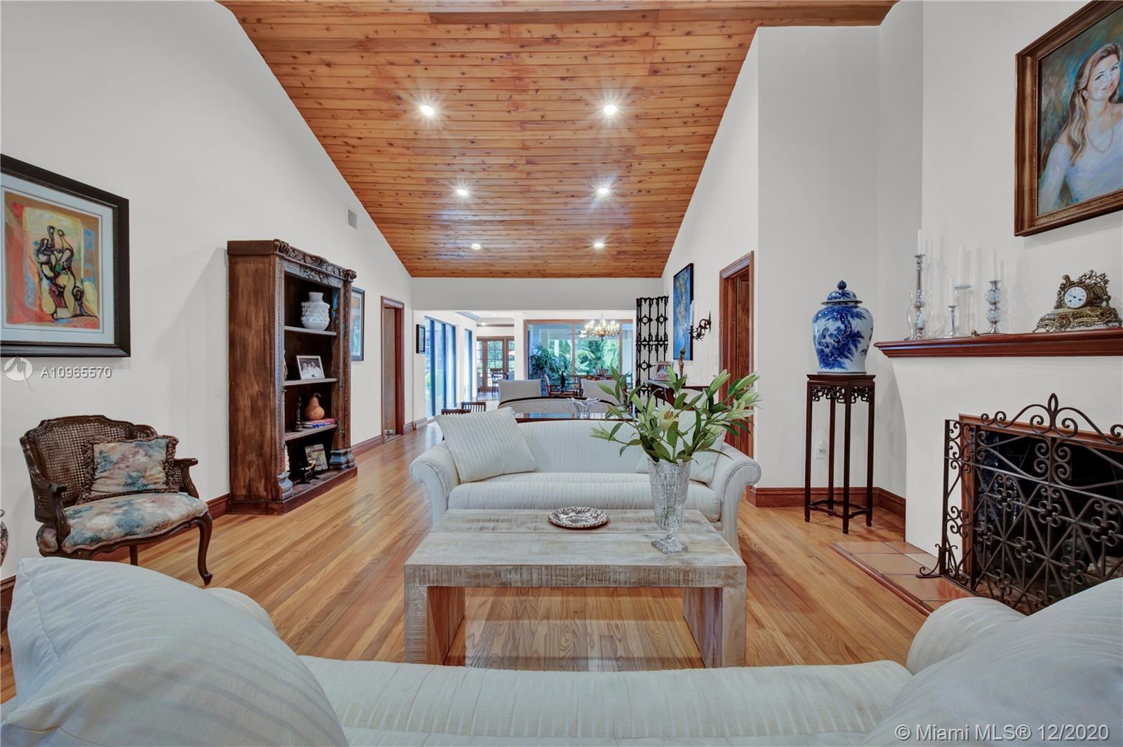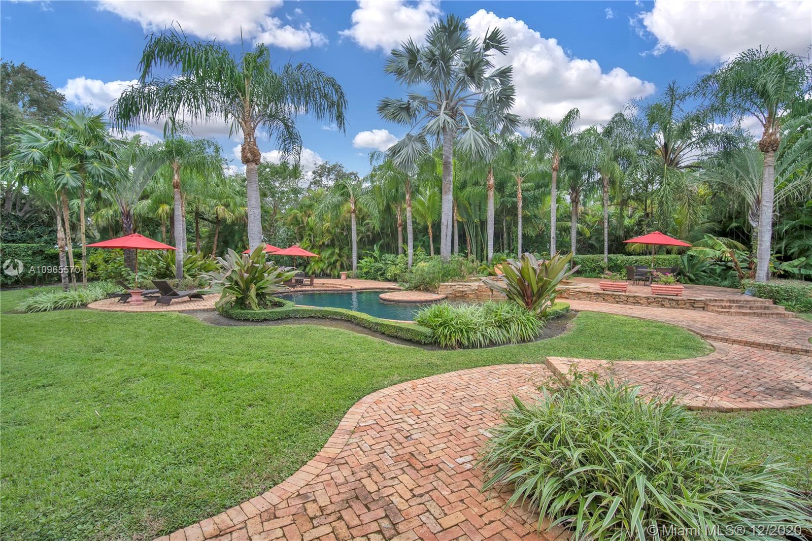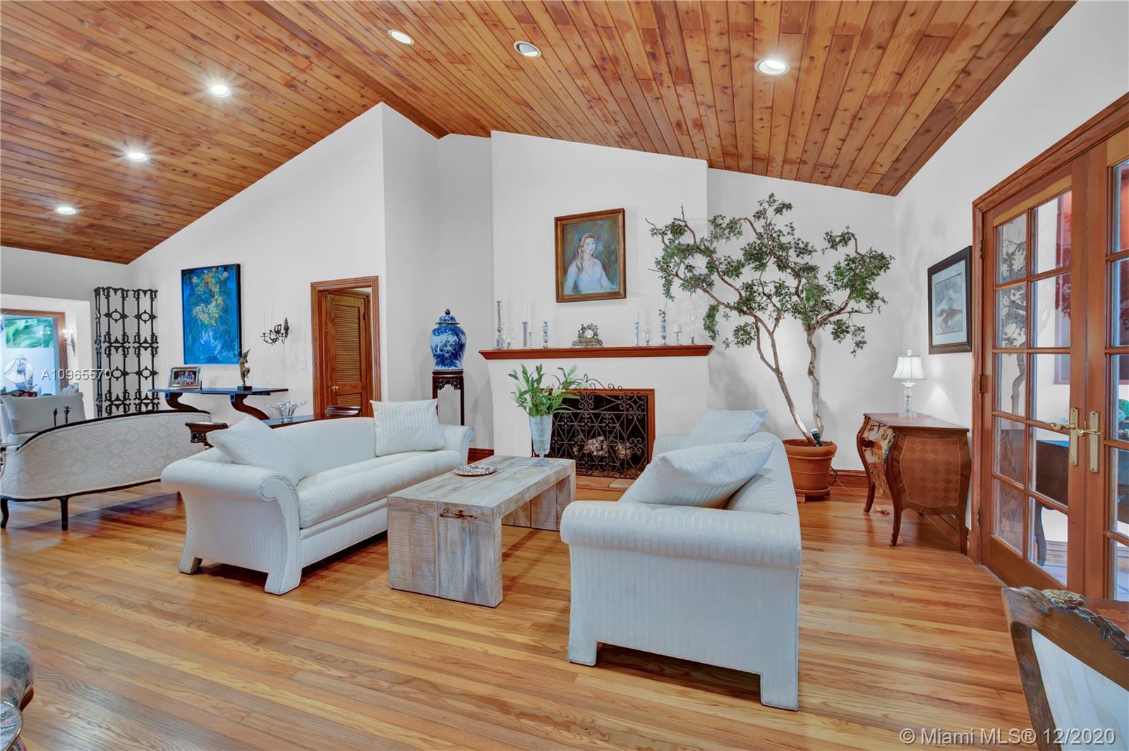 Resort Style living in Pinecrest. Large 4/3.5 home on 41,817 Sq. Ft. lot located in a gated enclave. Enter the great room with beautifully restored original oak wood floors and an 18ft tongue and groove ceiling. The family room with tray ceiling is surrounded by a courtyard and wraparound terrace. Sit in the den with the interior planter for some quiet time. Master suite and 1 Ensuite bedroom located on one side of the house, other two bedrooms with a Jack & Jill bathroom are on the other side. Transport yourself to a resort as you walk the terrace and winding pathway surrounding the lagoon pebble tech pool. The beach entrance & waterfall offer fun family time. This home has the modern-day comfort you're looking for and the luxury you desire. New roof installed 2019, PVC pipes, city water.