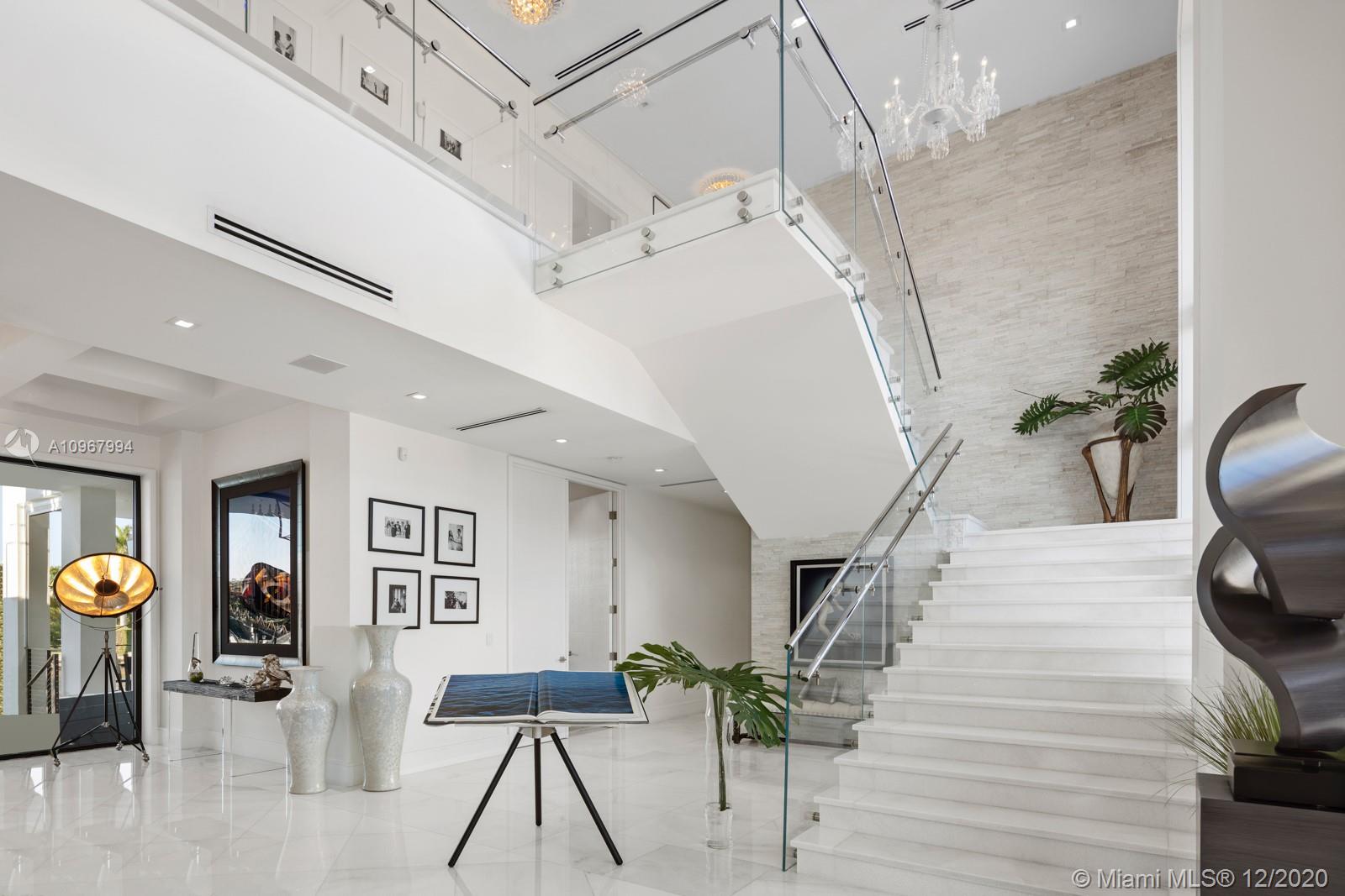Elegant & grand waterfront estate in the gated community of Old Cutler Bay. This home stands out from the moment you enter the privacy gates, fascinating your eyes with stately architectural features and cascading water. Dramatic double-height foyer entrance, flowing water views. Enjoy a large eat-in, gourmet chef's kitchen adjoining bar and glass wine room or entertain at your outdoor kitchen area, covered terrace with retractable screen overlooking the heated saltwater pool & 142' seawall. Impressive large master suite with stunning bathroom, his & hers custom walk-in closets & walk-out balcony. Top level also has 2 en-suite guest bedrooms. Theatre/screening room plus 2 bedrooms on first level plus staff quarters. 3-car garage, elevator, whole house generator & under-home storage.